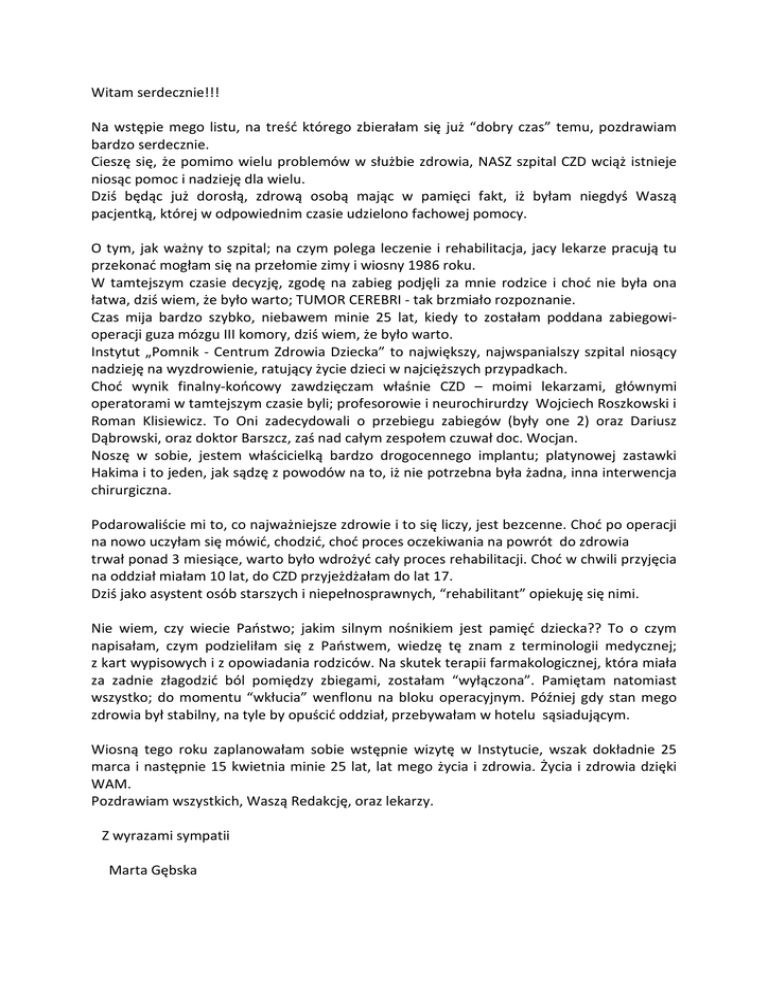 Witam serdecznie!!! Na wstępie mego listu, na treść którego zbierałam się już “dobry czas” temu, pozdrawiam bardzo serdecznie. Cieszę się, że pomimo wielu problemów w służbie zdrowia, NASZ szpital CZD wciąż istnieje niosąc pomoc i nadzieję dla wielu. Dziś będąc już dorosłą, zdrową osobą mając w pamięci fakt, iż byłam niegdyś Waszą pacjentką, której w odpowiednim czasie udzielono fachowej pomocy. O tym, jak ważny to szpital; na czym polega leczenie i rehabilitacja, jacy lekarze pracują tu przekonać mogłam się na przełomie zimy i wiosny 1986 roku. W tamtejszym czasie decyzję, zgodę na zabieg podjęli za mnie rodzice i choć nie była ona łatwa, dziś wiem, że było warto; TUMOR CEREBRI - tak brzmiało rozpoznanie. Czas mija bardzo szybko, niebawem minie 25 lat, kiedy to zostałam poddana zabiegowioperacji guza mózgu III komory, dziś wiem, że było warto. Instytut „Pomnik - Centrum Zdrowia Dziecka” to największy, najwspanialszy szpital niosący nadzieję na wyzdrowienie, ratujący życie dzieci w najcięższych przypadkach. Choć wynik finalny-końcowy zawdzięczam właśnie CZD – moimi lekarzami, głównymi operatorami w tamtejszym czasie byli; profesorowie i neurochirurdzy Wojciech Roszkowski i Roman Klisiewicz. To Oni zadecydowali o przebiegu zabiegów (były one 2) oraz Dariusz Dąbrowski, oraz doktor Barszcz, zaś nad całym zespołem czuwał doc. Wocjan. Noszę w sobie, jestem właścicielką bardzo drogocennego implantu; platynowej zastawki Hakima i to jeden, jak sądzę z powodów na to, iż nie potrzebna była żadna, inna interwencja chirurgiczna. Podarowaliście mi to, co najważniejsze zdrowie i to się liczy, jest bezcenne. Choć po operacji na nowo uczyłam się mówić, chodzić, choć proces oczekiwania na powrót do zdrowia trwał ponad 3 miesiące, warto było wdrożyć cały proces rehabilitacji. Choć w chwili przyjęcia na oddział miałam 10 lat, do CZD przyjeżdżałam do lat 17. Dziś jako asystent osób starszych i niepełnosprawnych, “rehabilitant” opiekuję się nimi. Nie wiem, czy wiecie Państwo; jakim silnym nośnikiem jest pamięć dziecka?? To o czym napisałam, czym podzieliłam się z Państwem, wiedzę tę znam z terminologii medycznej; z kart wypisowych i z opowiadania rodziców. Na skutek terapii farmakologicznej, która miała za zadnie złagodzić ból pomiędzy zbiegami, zostałam “wyłączona”. Pamiętam natomiast wszystko; do momentu “wkłucia” wenflonu na bloku operacyjnym. Później gdy stan mego zdrowia był stabilny, na tyle by opuścić oddział, przebywałam w hotelu sąsiadującym. Wiosną tego roku zaplanowałam sobie wstępnie wizytę w Instytucie, wszak dokładnie 25 marca i następnie 15 kwietnia minie 25 lat, lat mego życia i zdrowia. Życia i zdrowia dzięki WAM. Pozdrawiam wszystkich, Waszą Redakcję, oraz lekarzy. Z wyrazami sympatii Marta Gębska