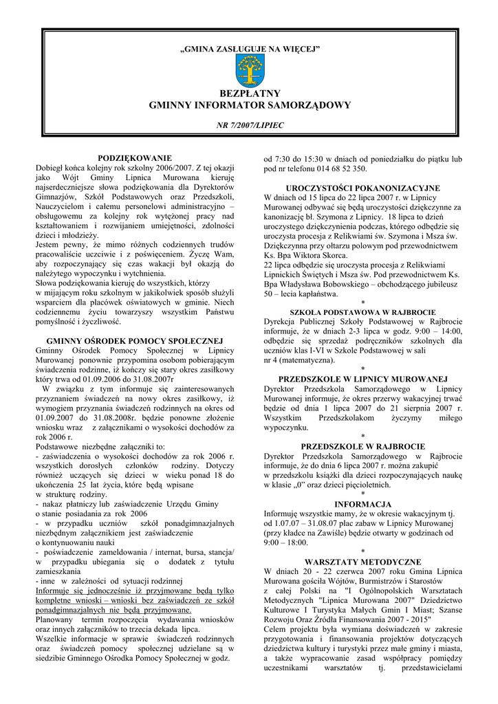 „GMINA ZASŁUGUJE NA WIĘCEJ” BEZPŁATNY GMINNY INFORMATOR SAMORZĄDOWY NR 7/2007/LIPIEC PODZIĘKOWANIE Dobiegł końca kolejny rok szkolny 2006/2007. Z tej okazji jako Wójt Gminy Lipnica Murowana kieruję najserdeczniejsze słowa podziękowania dla Dyrektorów Gimnazjów, Szkół Podstawowych oraz Przedszkoli, Nauczycielom i całemu personelowi administracyjno – obsługowemu za kolejny rok wytęŜonej pracy nad kształtowaniem i rozwijaniem umiejętności, zdolności dzieci i młodzieŜy. Jestem pewny, Ŝe mimo róŜnych codziennych trudów pracowaliście uczciwie i z poświęceniem. śyczę Wam, aby rozpoczynający się czas wakacji był okazją do naleŜytego wypoczynku i wytchnienia. Słowa podziękowania kieruję do wszystkich, którzy w mijającym roku szkolnym w jakikolwiek sposób słuŜyli wsparciem dla placówek oświatowych w gminie. Niech codziennemu Ŝyciu towarzyszy wszystkim Państwu pomyślność i Ŝyczliwość. GMINNY OŚRODEK POMOCY SPOŁECZNEJ Gminny Ośrodek Pomocy Społecznej w Lipnicy Murowanej ponownie przypomina osobom pobierającym świadczenia rodzinne, iŜ kończy się stary okres zasiłkowy który trwa od 01.09.2006 do 31.08.2007r W związku z tym informuje się zainteresowanych przyznaniem świadczeń na nowy okres zasiłkowy, iŜ wymogiem przyznania świadczeń rodzinnych na okres od 01.09.2007 do 31.08.2008r. będzie ponowne złoŜenie wniosku wraz z załącznikami o wysokości dochodów za rok 2006 r. Podstawowe niezbędne załączniki to: - zaświadczenia o wysokości dochodów za rok 2006 r. wszystkich dorosłych członków rodziny. Dotyczy równieŜ uczących się dzieci w wieku ponad 18 do ukończenia 25 lat Ŝycia, które będą wpisane w strukturę rodziny. - nakaz płatniczy lub zaświadczenie Urzędu Gminy o stanie posiadania za rok 2006 - w przypadku uczniów szkół ponadgimnazjalnych niezbędnym załącznikiem jest zaświadczenie o kontynuowaniu nauki - poświadczenie zameldowania / internat, bursa, stancja/ w przypadku ubiegania się o dodatek z tytułu zamieszkania - inne w zaleŜności od sytuacji rodzinnej Informuje się jednocześnie iŜ przyjmowane będą tylko kompletne wnioski – wnioski bez zaświadczeń ze szkół ponadgimnazjalnych nie będą przyjmowane. Planowany termin rozpoczęcia wydawania wniosków oraz innych załączników to trzecia dekada lipca. Wszelkie informacje w sprawie świadczeń rodzinnych oraz świadczeń pomocy społecznej udzielane są w siedzibie Gminnego Ośrodka Pomocy Społecznej w godz. od 7:30 do 15:30 w dniach od poniedziałku do piątku lub pod nr telefonu 014 68 52 350. UROCZYSTOŚCI POKANONIZACYJNE W dniach od 15 lipca do 22 lipca 2007 r. w Lipnicy Murowanej odbywać się będą uroczystości dziękczynne za kanonizację bł. Szymona z Lipnicy. 18 lipca to dzień uroczystego dziękczynienia podczas, którego odbędzie się uroczysta procesja z Relikwiami św. Szymona i Msza św. Dziękczynna przy ołtarzu polowym pod przewodnictwem Ks. Bpa Wiktora Skorca. 22 lipca odbędzie się uroczysta procesja z Relikwiami Lipnickich Świętych i Msza św. Pod przewodnictwem Ks. Bpa Władysława Bobowskiego – obchodzącego jubileusz 50 – lecia kapłaństwa. * SZKOŁA PODSTAWOWA W RAJBROCIE Dyrekcja Publicznej Szkoły Podstawowej w Rajbrocie informuje, Ŝe w dniach 2-3 lipca w godz. 9:00 – 14:00, odbędzie się sprzedaŜ podręczników szkolnych dla uczniów klas I-VI w Szkole Podstawowej w sali nr 4 (matematyczna). * PRZEDSZKOLE W LIPNICY MUROWANEJ Dyrektor Przedszkola Samorządowego w Lipnicy Murowanej informuje, Ŝe okres przerwy wakacyjnej trwać będzie od dnia 1 lipca 2007 do 21 sierpnia 2007 r. Wszystkim Przedszkolakom Ŝyczymy miłego wypoczynku. * PRZEDSZKOLE W RAJBROCIE Dyrektor Przedszkola Samorządowego w Rajbrocie informuje, Ŝe do dnia 6 lipca 2007 r. moŜna zakupić w przedszkolu ksiąŜki dla dzieci rozpoczynających naukę w klasie „0” oraz dzieci pięcioletnich. * INFORMACJA Informuję wszystkie mamy, Ŝe w okresie wakacyjnym tj. od 1.07.07 – 31.08.07 plac zabaw w Lipnicy Murowanej (przy kładce na Zawiśle) będzie otwarty w godzinach od 9:00 – 18:00. * WARSZTATY METODYCZNE W dniach 20 - 22 czerwca 2007 roku Gmina Lipnica Murowana gościła Wójtów, Burmistrzów i Starostów z całej Polski na "I Ogólnopolskich Warsztatach Metodycznych "Lipnica Murowana 2007" Dziedzictwo Kulturowe I Turystyka Małych Gmin I Miast; Szanse Rozwoju Oraz Źródła Finansowania 2007 - 2015" Celem projektu była wymiana doświadczeń w zakresie przygotowania i finansowania projektów dotyczących dziedzictwa kultury i turystyki przez małe gminy i miasta, a takŜe wypracowanie zasad współpracy pomiędzy uczestnikami warsztatów tj. przedstawicielami samorządów terytorialnych, instytucji Kultury, muzeów, stowarzyszeń i fundacji z małych gmin i miast województw Polski południowo – wschodniej. * WYMIANA DOWODÓW OSOBISTYCH Z dniem 1 stycznia 2008 roku stary dowód osobisty traci waŜność! Dowód osobisty potwierdza toŜsamość i obywatelstwo polskie. Brak dokumentu uniemoŜliwia załatwienie wszelkich spraw urzędowych i bankowych. Nowy dowód osobisty będzie od 1 stycznia 2008 roku niezbędny, by uzyskać stosowne decyzje i wsparcie finansowe: 1) z Agencji Restrukturyzacji i Modernizacji Rolnictwa na: - dopłaty bezpośrednie - zalesienie gruntów rolnych - wspieranie działalności rolniczej na obszarach o niekorzystnych warunkach gospodarowania - wspieranie przedsięwzięć rolnośrodowiskowych i poprawę dobrostanu zwierząt, - inwestycje w gospodarstwach rolnych - zróŜnicowanie działalności rolniczej i zbliŜonej do rolnictwa w celu zapewnienia róŜnorodności działań lub alternatywnych źródeł dochodu, - ułatwienie startu młodym rolnikom 2) z Agencji Rynku Rolnego na: - przekazanie i dziedziczenie gospodarstwa rolnego wraz z przysługującą ilością referencyjną mleka - przyznanie i transfer indywidualnej referencyjnej ceny mleka, - rejestrację w Centralnym Rejestr