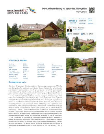 Dom jednorodzinny na sprzedaż, Namysłów Namysłów Cena 349 000 zł lub 1 517 zł miesięcznie Powierzchnia Cena za metr Liczba pokoi Pow. działki 170 m2 2 053 zł 4 14600 m2 Irena Woźniak Dyrektor Oddziału 513 134 067 Informacje ogólne Nr oferty 30998 Wyłączność tak Województwo Opolskie Typ zabudowy dom jednorodzinny Miasto Namysłów Stan budynku bardzo dobry Pow. użytkowa 170 m2 Ogrzewanie centralne + kominek Pow. działki 14600 m2 Typ podłączenia wody miejska Liczba pomieszczeń 4 Gaz butla Materiał budowy cegła Kanalizacja szambo Zwalniane od zaraz Zwalniany od zaraz Forma własności własność Szczegółowy opis Oferujemy do sprzedaży dom jednorodzinny dwu kondygnacyjny o pow. 170m2 w gm. Namysłów. Na parterze znajdują się dwa pokoje, jeden z kominkiem posiadającym rozprowadzone kanały grzewcze do wszystkich pomieszczeń, kuchnia z jadalnią, duża łazienka, przedpokój, kotłownia i ganek. Całe piętro to jedna ogromna przestrzeń wypoczynkowa o pow. ok 80m2. Dom położony jest na a ok. 1,5 hektarowej działce na której znajduje się ogród składający się z dużej ilości drzew ozdobnych, drzew leśnych, łąk i polan na których pasie się kucyk właściciela. Na działce znajduje się również mały staw, altana, grill, wybrukowane miejsce na ognisko oraz wybrukowane ścieżki między drzewami, które dodatkowo oświetlają latarnie, plac zabaw dla dzieci, oddzielny garaż i pomieszczenie gospodarcze. Cała posesja jest ogrodzona betonowym ogrodzeniem o łącznej długości 500 m. Dom znajduje się na końcu wioski jest to ostatni budynek graniczący z lasem i Stobrawskim Parkiem Narodowym. Stanowi to bardzo ustronne i klimatyczne miejsce całkowicie odizolowane od ciekawskich. Wspaniałe miejsce do życia wśród przyrody lub do wypoczynku jako wspaniały dom na wsi. Odległość od Wrocławia - 60km, od Opola 40 km, od Brzegu 18 km, od Namysłowa 12 km. Zapraszam na prezentację. Oferujemy również skuteczną, nieodpłatną pomoc w uzyskaniu kredytu na zakup nieruchomości. Zapraszamy do naszego biura w celu omówienia szczegółów oferty oraz ustalenia dogodnego dla Państwa terminu prezentacji. Szczegóły oferty: INVESTOR NIERUCHOMOŚCI Oddział w Namysłowie, ul. Wojska Polskiego 9 - Irena Woźniak tel. 513 134 067 lub 77 410 57 37. 77 410 57 37 Nota prawna: Informacje dotyczące opisu nieruchomości podane są przez właściciela, mają charakter wyłącznie informacyjny i mogą podlegać aktualizacji. Oferta dotycząca nieruchomości stanowi zaproszenie do rokowań zgodnie z art. 71 Kodeksu Cywilnego i nie stanowi oferty określonej w art. 66 i następnych KC. Oddział Namysłów, ul. Wojska Polskiego 9 , 46-100 Namysłów 77 400 01 76 • [email protected] • www.investor.net.pl 2017-03-07 22:31:02 Strona 1 z 1