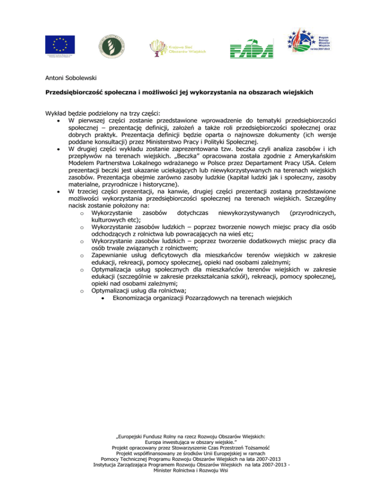 Antoni Sobolewski Przedsiębiorczość społeczna i możliwości jej wykorzystania na obszarach wiejskich Wykład będzie podzielony na trzy części: W pierwszej części zostanie przedstawione wprowadzenie do tematyki przedsiębiorczości społecznej – prezentację definicji, założeń a także roli przedsiębiorczości społecznej oraz dobrych praktyk. Prezentacja definicji będzie oparta o najnowsze dokumenty (ich wersje poddane konsultacji) przez Ministerstwo Pracy i Polityki Społecznej. W drugiej części wykładu zostanie zaprezentowana tzw. beczka czyli analiza zasobów i ich przepływów na terenach wiejskich. „Beczka” opracowana została zgodnie z Amerykańskim Modelem Partnerstwa Lokalnego wdrażanego w Polsce przez Departament Pracy USA. Celem prezentacji beczki jest ukazanie uciekających lub niewykorzystywanych na terenach wiejskich zasobów. Prezentacja obejmie zarówno zasoby ludzkie (kapitał ludzki jak i społeczny, zasoby materialne, przyrodnicze i historyczne). W trzeciej części prezentacji, na kanwie, drugiej części prezentacji zostaną przedstawione możliwości wykorzystania przedsiębiorczości społecznej na terenach wiejskich. Szczególny nacisk zostanie położony na: o Wykorzystanie zasobów dotychczas niewykorzystywanych (przyrodniczych, kulturowych etc); o Wykorzystanie zasobów ludzkich – poprzez tworzenie nowych miejsc pracy dla osób odchodzących z rolnictwa lub powracających na wieś etc; o Wykorzystanie zasobów ludzkich – poprzez tworzenie dodatkowych miejsc pracy dla osób trwale związanych z rolnictwem; o Zapewnianie usług deficytowych dla mieszkańców terenów wiejskich w zakresie edukacji, rekreacji, pomocy społecznej, opieki nad osobami zależnymi; o Optymalizacja usług społecznych dla mieszkańców terenów wiejskich w zakresie edukacji (szczególnie w zakresie przekształcania szkół), rekreacji, pomocy społecznej, opieki nad osobami zależnymi; o Optymalizacji usług dla rolnictwa; Ekonomizacja organizacji Pozarządowych na terenach wiejskich „Europejski Fundusz Rolny na rzecz Rozwoju Obszarów Wiejskich: Europa inwestująca w obszary wiejskie.” Projekt opracowany przez Stowarzyszenie Czas Przestrzeń Tożsamość Projekt współfinansowany ze środków Unii Europejskiej w ramach Pomocy Technicznej Programu Rozwoju Obszarów Wiejskich na lata 2007-2013 Instytucja Zarządzająca Programem Rozwoju Obszarów Wiejskich na lata 2007-2013 Minister Rolnictwa i Rozwoju Wsi