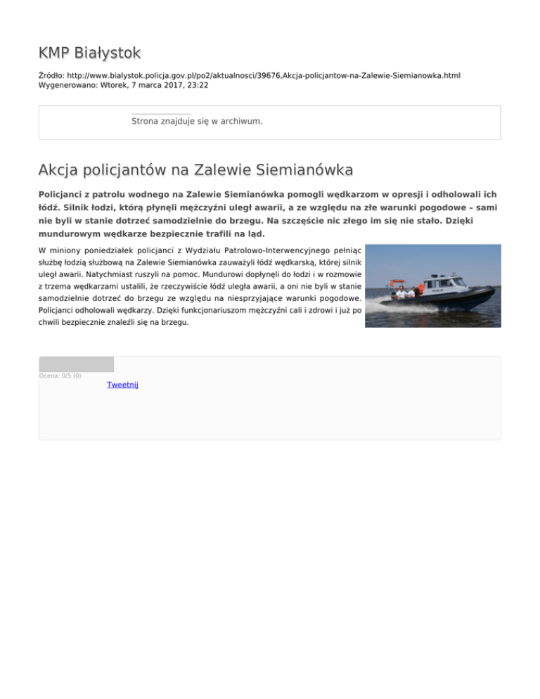 KMP Białystok Źródło: http://www.bialystok.policja.gov.pl/po2/aktualnosci/39676,Akcja-policjantow-na-Zalewie-Siemianowka.html Wygenerowano: Wtorek, 7 marca 2017, 23:22 Strona znajduje się w archiwum. Akcja policjantów na Zalewie Siemianówka Policjanci z patrolu wodnego na Zalewie Siemianówka pomogli wędkarzom w opresji i odholowali ich łódź. Silnik łodzi, którą płynęli mężczyźni uległ awarii, a ze względu na złe warunki pogodowe – sami nie byli w stanie dotrzeć samodzielnie do brzegu. Na szczęście nic złego im się nie stało. Dzięki mundurowym wędkarze bezpiecznie trafili na ląd. W miniony poniedziałek policjanci z Wydziału Patrolowo-Interwencyjnego pełniąc służbę łodzią służbową na Zalewie Siemianówka zauważyli łódź wędkarską, której silnik uległ awarii. Natychmiast ruszyli na pomoc. Mundurowi dopłynęli do łodzi i w rozmowie z trzema wędkarzami ustalili, że rzeczywiście łódź uległa awarii, a oni nie byli w stanie samodzielnie dotrzeć do brzegu ze względu na niesprzyjające warunki pogodowe. Policjanci odholowali wędkarzy. Dzięki funkcjonariuszom mężczyźni cali i zdrowi i już po chwili bezpiecznie znaleźli się na brzegu. Ocena: 0/5 (0) Tweetnij