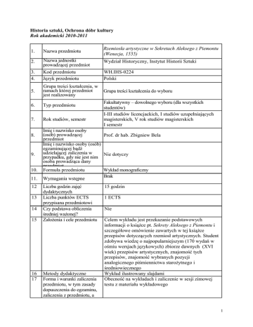 Historia sztuki, Ochrona dóbr kultury Rok akademicki 2010-2011 1. Nazwa przedmiotu Rzemiosła artystyczne w Sekretach Aleksego z Piemontu (Wenecja, 1555) 2. Nazwa jednostki prowadzącej przedmiot Wydział Historyczny, Instytut Historii Sztuki 3. 4. Kod przedmiotu Język przedmiotu WH.IHS-0224 Polski 5. Grupa treści kształcenia, w ramach której przedmiot jest realizowany Grupa treści kształcenia do wyboru 6. Typ przedmiotu 7. Rok studiów, semestr 8. 9. 10. 11. 12 13 14 15 16 17 Fakultatywny – dowolnego wyboru (dla wszystkich studentów) I-III studiów licencjackich, I studiów uzupełniających magisterskich, V rok studiów magisterskich I semestr Imię i nazwisko osoby (osób) prowadzącej Prof. dr hab. Zbigniew Bela przedmiot Imię i nazwisko osoby (osób) egzaminującej bądź udzielającej zaliczenia w Nie dotyczy przypadku, gdy nie jest nim osoba prowadząca dany przedmiot Formuła przedmiotu Wykład monograficzny Brak Wymagania wstępne Liczba godzin zajęć dydaktycznych Liczba punktów ECTS przypisana przedmiotowi Czy podstawa obliczenia średniej ważonej? Założenia i cele przedmiotu Metody dydaktyczne Forma i warunki zaliczenia przedmiotu, w tym zasady dopuszczenia do egzaminu, zaliczenia z przedmiotu, a 15 godzin 1 ECTS Nie Celem wykładu jest przekazanie podstawowych informacji o książce pt. Sekrety Aleksego z Piemontu i szczegółowe omówienie zawartych w tej książce przepisów dotyczących rzemiosł artystycznych. Student zdobywa wiedzę o najpopularniejszym (170 wydań w ośmiu wersjach językowych) zbiorze dawnych (XVI wiek) przepisów artystycznych, znajomość tych przepisów, znajomość wybranych pozycji analogicznego piśmiennictwa starożytnego i średniowiecznego Wykład ilustrowany slajdami Obecność na wykładach i zaliczenie w sesji zimowej testu z materiału wykładowego 1 18 19 także formę i warunki zaliczenia poszczególnych form zajęć wchodzących w zakres danego przedmiotu Treści merytoryczne przedmiotu oraz sposób ich realizacji Wykaz literatury podstawowej i uzupełniającej, obowiązującej do zaliczenia danego przedmiotu Podstawowe informacje o książce pt. Sekrety Aleksego z Piemontu, tzn. historia jej „rozwoju” (dodawanie w kolejnych włoskich wydaniach Sekretów nowych przepisów), opis zawartości włoskiego pierwodruku, sprawa autorstwa, gatunek i tradycja tego rodzaju piśmiennictwa, przekłady Sekretów na języki obce, polska wersja Sekretów Aleksego z Piemontu, przykłady przepisów Aleksego, które nie dotyczą rzemiosł artystycznych). Prezentacja i komentarz przepisów Aleksego z Piemontu na wykonanie farb (do malowania i iluminowania), przepisów na atramenty różnych kolorów (m.in. biały), przepisy na grunty i werniksy, przepisy na barwienie kości, drewna, włosia, skór i jedwabiu, przepisy złotnicze (pozłacanie marmuru i drewna, zaprawy pod złocenie itp.) i jubilerskie, przepisy dotyczące małej sztuki odlewniczej (drobne odlewy o charakterze reliefowym) Literatura podstawowa: - Z. Bela, Aleksego Pedemontana Tajemnice. Kraków, 1999 tom I: faksymile polskiej wersji Sekretów, przepisy na ss. 580–608. tom II: Monografia – tu w szczególności rozdział pt. Analiza treści, podrozdziały: Księga piąta i Księga szósta Literatura uzupełniająca: - Kaja Pliniusza Starszego Historia Naturalna ksiąg XXXVII. Przekład J. Łukaszewicz. Poznań, 1845, księgi XXXIII–XXXVII (informacje dotyczące mineralogii i metalurgii, z praktycznym zastosowaniem w malarstwie i rzeźbie, a także w obróbce złota, srebra, spiżu i kamieni szlachetnych) - Teofila kapłana i zakonnika o sztukach rozmaitych ksiąg troje. Opracował Teofil Żebrawski. Kraków 1880 2