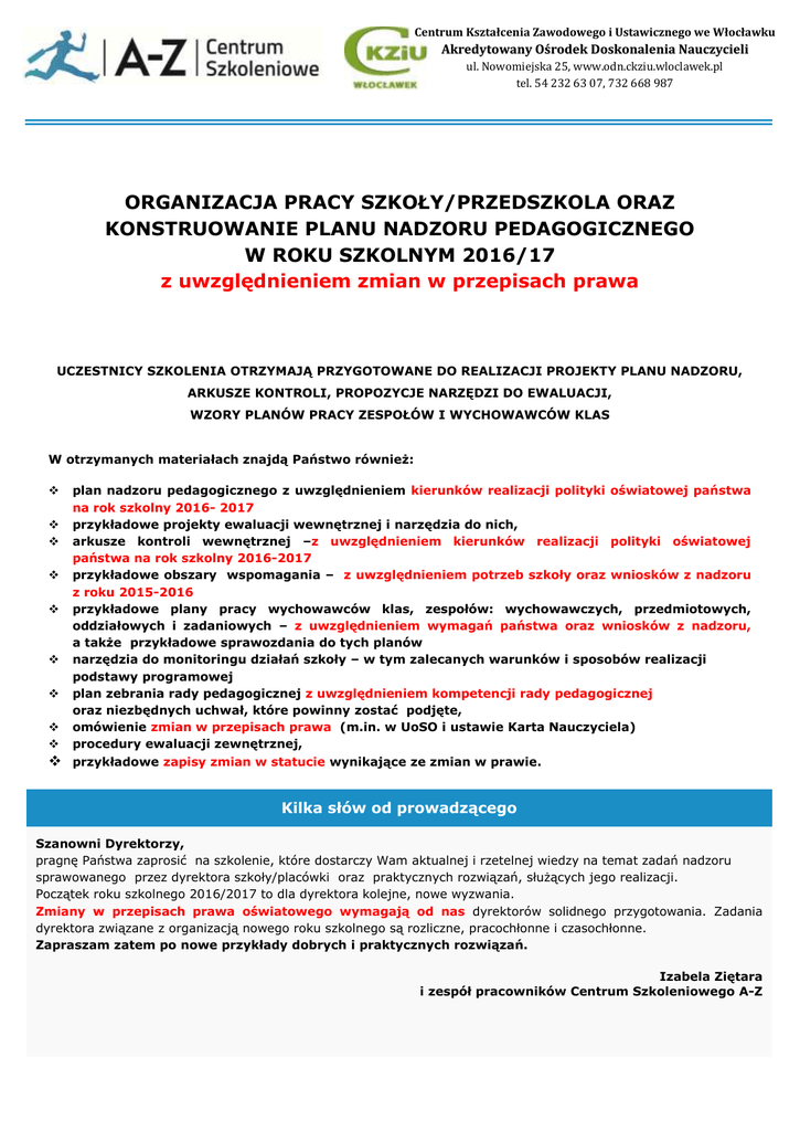 Centrum Kształcenia Zawodowego i Ustawicznego we Włocławku Akredytowany Ośrodek Doskonalenia Nauczycieli ul. Nowomiejska 25, www.odn.ckziu.wloclawek.pl tel. 54 232 63 07, 732 668 987 e-mail: [email protected] ORGANIZACJA PRACY SZKOŁY/PRZEDSZKOLA ORAZ KONSTRUOWANIE PLANU NADZORU PEDAGOGICZNEGO W ROKU SZKOLNYM 2016/17 z uwzględnieniem zmian w przepisach prawa UCZESTNICY SZKOLENIA OTRZYMAJĄ PRZYGOTOWANE DO REALIZACJI PROJEKTY PLANU NADZORU, ARKUSZE KONTROLI, PROPOZYCJE NARZĘDZI DO EWALUACJI, WZORY PLANÓW PRACY ZESPOŁÓW I WYCHOWAWCÓW KLAS W otrzymanych materiałach znajdą Państwo również: plan nadzoru pedagogicznego z uwzględnieniem kierunków realizacji polityki oświatowej państwa na rok szkolny 2016- 2017 przykładowe projekty ewaluacji wewnętrznej i narzędzia do nich, arkusze kontroli wewnętrznej –z uwzględnieniem kierunków realizacji polityki oświatowej państwa na rok szkolny 2016-2017 przykładowe obszary wspomagania – z uwzględnieniem potrzeb szkoły oraz wniosków z nadzoru z roku 2015-2016 przykładowe plany pracy wychowawców klas, zespołów: wychowawczych, przedmiotowych, oddziałowych i zadaniowych – z uwzględnieniem wymagań państwa oraz wniosków z nadzoru, a także przykładowe sprawozdania do tych planów narzędzia do monitoringu działań szkoły – w tym zalecanych warunków i sposobów realizacji podstawy programowej plan zebrania rady pedagogicznej z uwzględnieniem kompetencji rady pedagogicznej oraz niezbędnych uchwał, które powinny zostać podjęte, omówienie zmian w przepisach prawa (m.in. w UoSO i ustawie Karta Nauczyciela) procedury ewaluacji zewnętrznej, przykładowe zapisy zmian w statucie wynikające ze zmian w prawie. Kilka słów od prowadzącego Szanowni Dyrektorzy, pragnę Państwa zaprosić na szkolenie, które dostarczy Wam aktualnej i rzetelnej wiedzy na temat zadań nadzoru sprawowanego przez dyrektora szkoły/placówki oraz praktycznych rozwiązań, służących jego realizacji. Początek roku szkolnego 2016/2017 to dla dyrektora kolejne, nowe wyzwania. Zmiany w przepisach prawa oświatowego wymagają od nas dyrektorów solidnego przygotowania. Zadania dyrektora związane z organizacją nowego roku szkolnego są rozliczne, pracochłonne i czasochłonne. Zapraszam zatem po nowe przykłady dobrych i praktycznych rozwiązań. Izabela Ziętara i zespół pracowników Centrum Szkoleniowego A-Z Program seminarium Podstawowe kierunki realizacji polityki oświatowej państwa i kierunki realizacji zadań z zakresu nadzoru pedagogicznego w roku szkolnym 2016/17. Zadania wynikające z kierunków realizacji polityki oświatowej państwa oraz wniosków dyrektora szkoły z nadzoru pedagogicznego za miniony rok szkolny podstawą planowania pracy szkoły i nadzoru pedagogicznego Nadzór pedagogiczny w 2016/2017r.: Przykładowe projekty i narzędzia do ewaluacji wewnętrznej, Arkusze kontroli wewnętrznej, Planowanie wspomagania nauczycieli. Planowanie pracy zespołów przedmiotowych i zadaniowych zadania i przykładowe plany pracy – z uwzględnieniem obowiązujących wymagań państwa arkusze monitorowania działań szkoły, w tym warunków i sposobów realizacji podstawy programowej Zadania wychowawców i planowanie ich pracy. Organizacja pomocy psychologiczno-pedagogicznej w szkole/placówce Opracowanie szkolnego programu wychowawczego Elementy kontroli zarządczej. Koncepcja pracy szkoły/placówki – jej modyfikacja w oparciu o zmieniające się potrzeby i oczekiwania uczniów, ich rodziców i środowiska lokalnego. Przygotowanie szkoły do ewaluacji zewnętrznej. Terminy zajęć 8 września 2016 godz. 10.00-15.00 Zgłoszenia Do 6 września br. na formularzu zgłoszeniowym dostępnym na www.odn.ckziu.wloclawek.pl tel./fax. 54 232 63 07; e-mail: [email protected] lub [email protected] Miejsce Koszt 195 zł/os. brutto (min. grupa 25 osób) CKZiU Włocławek ul. Nowomiejska 25 Koszt obejmuje: materiały szkoleniowe (druk + płyta), certyfikat, poczęstunek Na szkoleniu otrzymują Państwo fakturę z terminem płatności 14 dni. Wykładowca - Izabela Ziętara - wieloletni edukator Centrum Szkoleniowego A-Z, obecnie dyrektor gimnazjum, wcześniej doradca metodyczny (przyroda i biologia); współpracuje jako wykładowca z Uniwersytetem Mikołaja Kopernika oraz z wydawnictwami; została powołana w Toruniu na lidera ds. ramowych programów nauczania oraz nadzoru pedagogicznego