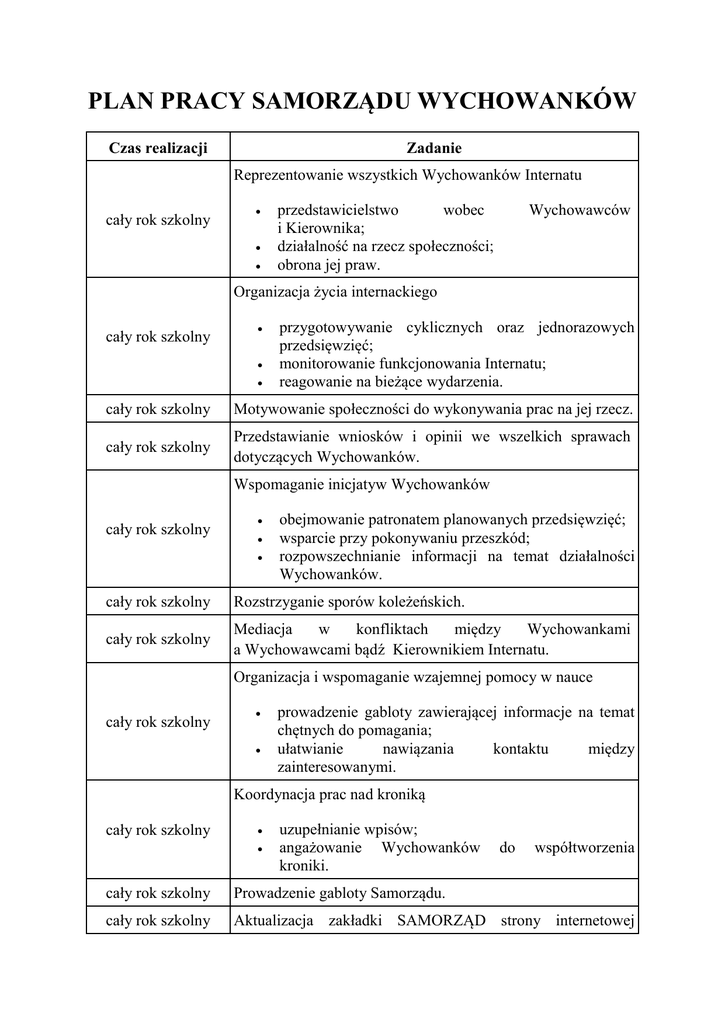 PLAN PRACY SAMORZĄDU WYCHOWANKÓW Czas realizacji Zadanie Reprezentowanie wszystkich Wychowanków Internatu cały rok szkolny przedstawicielstwo wobec i Kierownika; działalność na rzecz społeczności; obrona jej praw. Wychowawców Organizacja życia internackiego cały rok szkolny przygotowywanie cyklicznych oraz jednorazowych przedsięwzięć; monitorowanie funkcjonowania Internatu; reagowanie na bieżące wydarzenia. cały rok szkolny Motywowanie społeczności do wykonywania prac na jej rzecz. cały rok szkolny Przedstawianie wniosków i opinii we wszelkich sprawach dotyczących Wychowanków. Wspomaganie inicjatyw Wychowanków cały rok szkolny obejmowanie patronatem planowanych przedsięwzięć; wsparcie przy pokonywaniu przeszkód; rozpowszechnianie informacji na temat działalności Wychowanków. cały rok szkolny Rozstrzyganie sporów koleżeńskich. cały rok szkolny Mediacja w konfliktach między Wychowankami a Wychowawcami bądź Kierownikiem Internatu. Organizacja i wspomaganie wzajemnej pomocy w nauce cały rok szkolny prowadzenie gabloty zawierającej informacje na temat chętnych do pomagania; ułatwianie nawiązania kontaktu między zainteresowanymi. Koordynacja prac nad kroniką cały rok szkolny uzupełnianie wpisów; angażowanie Wychowanków kroniki. do współtworzenia cały rok szkolny Prowadzenie gabloty Samorządu. cały rok szkolny Aktualizacja zakładki SAMORZĄD strony internetowej placówki. wrzesień Wybór Przewodniczącego oraz Zastępcy Przewodniczącego Rady Samorządu. wrzesień Przeprowadzenie wyborów na Opiekuna Samorządu. wrzesień Uchwalenie Statutu Samorządu. wrzesień Przygotowywanie obchodów Dnia Chłopaka. październik Organizacja Otrzęsin klas I. grudzień Organizacja Turnieju Grup. grudzień Współorganizacja uroczystej kolacji wigilijnej. Przedstawienie sprawozdania z prac w I okresie styczeń marzec kwiecień publikowanie w formie pisemnej okresowego podsumowania w celu poinformowania Wychowanków o działalności Rady Samorządu; przedstawienie okresowego podsumowania Radzie Pedagogicznej. Organizacja obchodów Dnia Kobiet. Organizacja uroczystego pożegnania Maturzystów. Przedstawienie sprawozdania z prac w roku szkolnym czerwiec publikowanie w formie pisemnej rocznego podsumowania w celu poinformowania Wychowanków o działalności Rady Samorządu; przedstawienie rocznego podsumowania Radzie Pedagogicznej.
