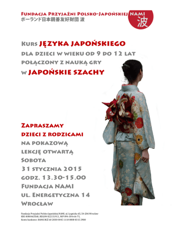 Fundacja Przyjaźni Polsko-Japońskiej NAMI, ul. Legnicka 65, 54-206 Wrocław KRS 0000463568, REGON 022151911, NIP 894-304-66-75, Konto bankowe: BANK BGŻ 60 2030 0045 1110 0000 0315 2980 Eksperymentalne zajęcia językowo-szachowe Od grudnia ubiegłego roku Wojciech Jedynak prowadzi w Fundacji NAMI eksperymentalne zajęcia języka japońskiego i japońskich szachów dla dzieci. Od początku lutego zaczniemy prowadzić regularne zajęcia dla większej grupy (maks. 6 osób) w soboty od 11.00-13.00. Zajęcia prowadzi Wojciech Jedynak – posiadacz stopnia N1 JLPT (najwyższy poziom znajomości języka japońskiego dla osób spoza Japonii), gracz i popularyzator shogi. W sierpniu i wrześniu 2014 na stażu w Japonii doskonalił metody nauczania shogi pod okiem japońskich profesjonalistów. Zainteresowanych prosimy o kontakt: Grażyna Pogorzelska, [email protected], tel. 784 694 592 Shōgi (将棋) dosłownie „gra generałów” to oryginalna, japońska gra strategiczna. Ze względu na wspólne korzenie i zbliżone zasady, nazywana jest też „japońskimi szachami”. Tak jak w szachach, celem gry jest mat króla przeciwnika. Gra odbywa się na planszy liczącej 9 na 9 pól. Płaskie figury, których ruchy są zbliżone do szachowych, są jednokolorowe – rozróżnia się je po kierunku, w którym są obrócone. Poza przesunięciem figury, gracz może też wykonać ruch polegający na wstawieniu na planszę zbitej wcześniej figury przeciwnika jako swojej. Dodaje to grze dynamiki i sprawia, że końcowe etapy partii są bardzo emocjonujące. Dōbutsu shōgi (どうぶつしょうぎ) „zwierzątkowe shogi”, to stworzona przez japońską zawodniczkę shogi p. Madokę Kitao uproszczona wersja japońskich szachów łącząca łatwe do zapamiętania reguły z dziecięcą grafiką i stale widocznymi oznaczeniami dopuszczalnych ruchów. Fundacja Przyjaźni Polsko-Japońskiej NAMI, ul. Legnicka 65, 54-206 Wrocław KRS 0000463568, REGON 022151911, NIP 894-304-66-75, Konto bankowe: BANK BGŻ 60 2030 0045 1110 0000 0315 2980
