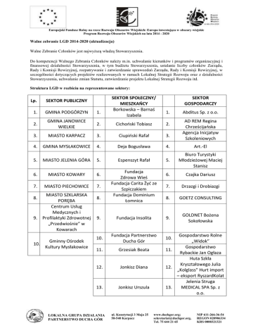 Europejski Fundusz Rolny na rzecz Rozwoju Obszarów Wiejskich: Europa inwestująca w obszary wiejskie Program Rozwoju Obszarów Wiejskich na lata 2014 - 2020 Walne zebranie LGD 2014-2020 (aktualizacja) Walne Zebranie Członków jest najwyższą władzą Stowarzyszenia. Do kompetencji Walnego Zebrania Członków należy m.in. uchwalanie kierunków i programów organizacyjnej i finansowej działalności Stowarzyszenia, w tym budżetu Stowarzyszenia, ustalanie liczby członków Zarządu, Rady i Komisji Rewizyjnej, rozpatrywanie i zatwierdzanie sprawozdań Zarządu, Rady i Komisji Rewizyjnej, w szczególności dotyczących projektów realizowanych w ramach Lokalnej Strategii Rozwoju oraz z działalności Stowarzyszenia, uchwalanie zmian Statutu, zatwierdzanie projektu Lokalnej Strategii Rozwoju itd. Struktura LGD w rozbiciu na reprezentowane sektory: SEKTOR SPOŁECZNY/ MIESZKAŃCY Borkowska – Barnaś Izabela SEKTOR GOSPODARCZY Lp. SEKTOR PUBLICZNY 1. GMINA PODGÓRZYN 1. 2. GMINA JANOWICE WIELKIE 2. Cichoński Tobiasz 2. 3. MIASTO KARPACZ 3. Ciupiński Rafał 3. 4. GMINA MYSŁAKOWICE 4. Deja Bogusława 4. Art.-El 5. MIASTO JELENIA GÓRA 5. Espenszyt Rafał 5. Biuro Turystyki Młodzieżowej Maciej Stanisz 6. MIASTO KOWARY 6. 6. Czajka Dariusz 7. MIASTO PIECHOWICE 7. 7. Drzazgi i Drobiazgi 8. GOETZ CONSULTING GOLDNET Bożena Sokołowska MIASTO SZKLARSKA PORĘBA Centrum Usług Medycznych i 9. Profilaktyki Zdrowotnej „Przedwiośnie” w Kowarach 8. 10. Gminny Ośrodek Kultury Mysłakowice 8. Fundacja Zdrowa Wieś Fundacja Carita Żyć ze Szpiczakiem Fundacja Dominium Łomnica 1. 9. Fundacja Insolita 9. 10. Fundacja Partnerstwo Ducha Gór 10. 11. Grzesiak Beata 12. Jonkisz Diana 13. Jonkisz Urszula LOKALNA GRUPA DZIAŁANIA PARTNERSTWO DUCHA GÓR ul. Konstytucji 3 Maja 25 58-540 Karpacz Abditus Sp. z o.o. AD REM Regina Chrześcijańska Agencja Inicjatyw Szkoleniowych Gospodarstwo Rolne „Widok” Gospodarstwo 11. Rybackie Jan Ogłaza Huta Szkła Kryształowego Julia 12. „Kolglass” Hurt import – eksport RyszardKolat Jelenia Struga 13. MEDICAL SPA Sp. z o.o. www.duchgor.org; [email protected], Tel. 75 644 21 65 NIP 611-266-36-54 REGON 020906334 KRS 0000321321 Europejski Fundusz Rolny na rzecz Rozwoju Obszarów Wiejskich: Europa inwestująca w obszary wiejskie Program Rozwoju Obszarów Wiejskich na lata 2014 - 2020 Koło Gospodyń Wiejskich w Mysłakowicach 15. Kotylak Rafał 14. 14. Malantowicz Marcin 15. 20. Mendak Magdalena Karkonoskie Tajemnice S.C. Aneta Sieradzka i Jakub Paczyński Konsorcjum Anna Daniel Leśna Huta Muzeum Ziemi „JUNA” Piekarnia „UliJanka” 21. RUBIN Pracownia 16. Kowal-Ruschil Agata 16. 17. Kowarski Klub Seniora 17. 18. Kujawa Aldona Lokalna Organizacja Turystyczna Makutynowicz Beata Marciniak-Kucharska Agnieszka 18. 22. Matusiak Krystyna 22. 23. Matyja Barbara 23. 24. 25. 26. 27. 28. 29. 30. 31. Mendyk Emil MKS Olimpia Kowary Olszowski Ireneusz OSP Karpacz Piątkowska Jolanta Pietras Dawid Piskor Mariola PKS „Lechia Piechowice” Poniatowska-Wasiak Natalia Renata Wysoczańska Rzemieniewska Irena Scena Otwarta Stowarzyszenie Promocji Kultury i Sztuki Sidor Ewa Sokołowska Barbara Spiżarnia Danuty Polak Stowarzyszenie Karkonoski Klub Owczarka Niemieckiego Stowarzyszenie „LOKALNI-NIEBANALNI” 24. 25. 26. 27. 19. 20. 21. 32. 33. 34. 35. 36. 37. 38. 39. 40. LOKALNA GRUPA DZIAŁANIA PARTNERSTWO DUCHA GÓR ul. Konstytucji 3 Maja 25 58-540 Karpacz 19. Salon Lniany Regina Rosa Schronisko PTTK Samotnia K. Siemaszko, M. Siemaszko-Arcimowicz SIRUWIA Szygula Zygfryd Toreja Michał Klaga Ulmer Urszula www.duchgor.org; [email protected], Tel. 75 644 21 65 NIP 611-266-36-54 REGON 020906334 KRS 0000321321 Europejski Fundusz Rolny na rzecz Rozwoju Obszarów Wiejskich: Europa inwestująca w obszary wiejskie Program Rozwoju Obszarów Wiejskich na lata 2014 - 2020 41. 42. 43. 44. 45. 46. 47. 48. 49. 50. 51. 52. 53. 54. LOKALNA GRUPA DZIAŁANIA PARTNERSTWO DUCHA GÓR Stowarzyszenie „Łomniczanie” Stowarzyszenie Miłośników Kowar Stowarzyszenie Odnowy i Rozwoju Wsi Gruszków Stowarzyszenie Piechowice Stowarzyszenie Przyjaciół Miłkowa Stowarzyszenie Senior 60 Stowarzyszenie sołectwa Wojanów-Bobrów Stowarzyszenie Społeczno-Kulturalne Faktor Stowarzyszenie Sympatyków Gminy Mysłakowice Promocji Regionu i Agroturystyki Studio Rob Śniegucka-Pawłowska Anna Waszczuk Małgorzata Waszczuk Martin Tabiś Ewa ul. Konstytucji 3 Maja 25 58-540 Karpacz www.duchgor.org; [email protected], Tel. 75 644 21 65 NIP 611-266-36-54 REGON 020906334 KRS 0000321321