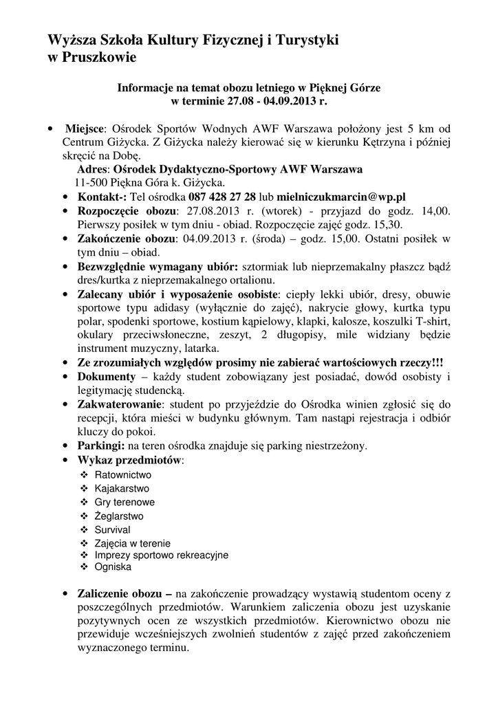 Wyższa Szkoła Kultury Fizycznej i Turystyki w Pruszkowie Informacje na temat obozu letniego w Pięknej Górze w terminie 27.08 - 04.09.2013 r. • Miejsce: Ośrodek Sportów Wodnych AWF Warszawa położony jest 5 km od Centrum Giżycka. Z Giżycka należy kierować się w kierunku Kętrzyna i później skręcić na Dobę. Adres: Ośrodek Dydaktyczno-Sportowy AWF Warszawa 11-500 Piękna Góra k. Giżycka. • Kontakt-: Tel ośrodka 087 428 27 28 lub [email protected] • Rozpoczęcie obozu: 27.08.2013 r. (wtorek) - przyjazd do godz. 14,00. Pierwszy posiłek w tym dniu - obiad. Rozpoczęcie zajęć godz. 15,30. • Zakończenie obozu: 04.09.2013 r. (środa) – godz. 15,00. Ostatni posiłek w tym dniu – obiad. • Bezwzględnie wymagany ubiór: sztormiak lub nieprzemakalny płaszcz bądź dres/kurtka z nieprzemakalnego ortalionu. • Zalecany ubiór i wyposażenie osobiste: ciepły lekki ubiór, dresy, obuwie sportowe typu adidasy (wyłącznie do zajęć), nakrycie głowy, kurtka typu polar, spodenki sportowe, kostium kąpielowy, klapki, kalosze, koszulki T-shirt, okulary przeciwsłoneczne, zeszyt, 2 długopisy, mile widziany będzie instrument muzyczny, latarka. • Ze zrozumiałych względów prosimy nie zabierać wartościowych rzeczy!!! • Dokumenty – każdy student zobowiązany jest posiadać, dowód osobisty i legitymację studencką. • Zakwaterowanie: student po przyjeździe do Ośrodka winien zgłosić się do recepcji, która mieści w budynku głównym. Tam nastąpi rejestracja i odbiór kluczy do pokoi. • Parkingi: na teren ośrodka znajduje się parking niestrzeżony. • Wykaz przedmiotów: Ratownictwo Kajakarstwo Gry terenowe Żeglarstwo Survival Zajęcia w terenie Imprezy sportowo rekreacyjne Ogniska • Zaliczenie obozu – na zakończenie prowadzący wystawią studentom oceny z poszczególnych przedmiotów. Warunkiem zaliczenia obozu jest uzyskanie pozytywnych ocen ze wszystkich przedmiotów. Kierownictwo obozu nie przewiduje wcześniejszych zwolnień studentów z zajęć przed zakończeniem wyznaczonego terminu. • Bezpieczeństwo – w trakcie trwania obozu każdego uczestnika obowiązuje regulamin ośrodka AWF oraz regulamin obozu WSKFiT. Warunkiem zapisu na obóz jest wniesienie opłaty 400 zł tytułem zaliczki do dnia 27 kwietnia 2013 roku. Warunkiem uczestnictwa jest wniesienie pełnej opłaty w kwocie 1200 zł do 30 czerwca 2013 !!! Wpłat proszę dokonywać na konto Uczelni (z dopiskiem w tytule płatności „obóz letni 2013"): ING Bank Śląski o/Pruszków 82 1050 1924 1000 0022 6350 4223 2