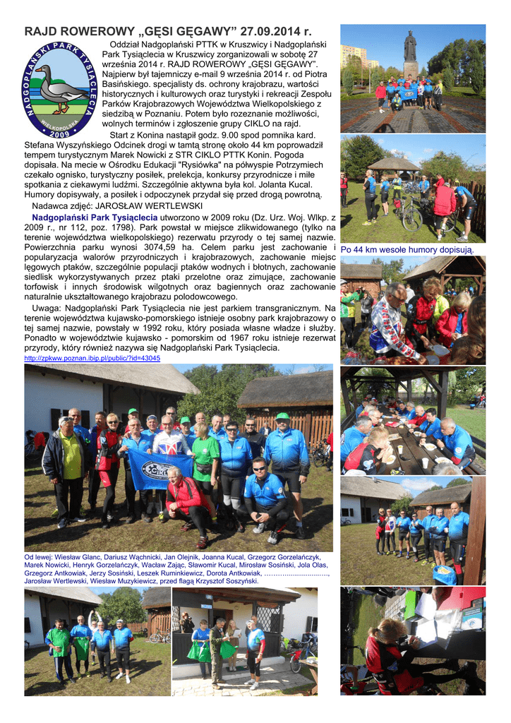 RAJD ROWEROWY „GĘSI GĘGAWY” 27.09.2014 r. Oddział Nadgoplański PTTK w Kruszwicy i Nadgoplański Park Tysiąclecia w Kruszwicy zorganizowali w sobotę 27 września 2014 r. RAJD ROWEROWY „GĘSI GĘGAWY”. Najpierw był tajemniczy e-mail 9 września 2014 r. od Piotra Basińskiego. specjalisty ds. ochrony krajobrazu, wartości historycznych i kulturowych oraz turystyki i rekreacji Zespołu Parków Krajobrazowych Województwa Wielkopolskiego z siedzibą w Poznaniu. Potem było rozeznanie możliwości, wolnych terminów i zgłoszenie grupy CIKLO na rajd. Start z Konina nastąpił godz. 9.00 spod pomnika kard. Stefana Wyszyńskiego Odcinek drogi w tamtą stronę około 44 km poprowadził tempem turystycznym Marek Nowicki z STR CIKLO PTTK Konin. Pogoda dopisała. Na mecie w Ośrodku Edukacji "Rysiówka" na półwyspie Potrzymiech czekało ognisko, turystyczny posiłek, prelekcja, konkursy przyrodnicze i miłe spotkania z ciekawymi ludźmi. Szczególnie aktywna była kol. Jolanta Kucal. Humory dopisywały, a posiłek i odpoczynek przydał się przed drogą powrotną. Nadawca zdjęć: JAROSŁAW WERTLEWSKI Nadgoplański Park Tysiąclecia utworzono w 2009 roku (Dz. Urz. Woj. Wlkp. z 2009 r., nr 112, poz. 1798). Park powstał w miejsce zlikwidowanego (tylko na terenie województwa wielkopolskiego) rezerwatu przyrody o tej samej nazwie. Powierzchnia parku wynosi 3074,59 ha. Celem parku jest zachowanie i Po 44 km wesołe humory dopisują. popularyzacja walorów przyrodniczych i krajobrazowych, zachowanie miejsc lęgowych ptaków, szczególnie populacji ptaków wodnych i błotnych, zachowanie siedlisk wykorzystywanych przez ptaki przelotne oraz zimujące, zachowanie torfowisk i innych środowisk wilgotnych oraz bagiennych oraz zachowanie naturalnie ukształtowanego krajobrazu polodowcowego. Uwaga: Nadgoplański Park Tysiąclecia nie jest parkiem transgranicznym. Na terenie województwa kujawsko-pomorskiego istnieje osobny park krajobrazowy o tej samej nazwie, powstały w 1992 roku, który posiada własne władze i służby. Ponadto w województwie kujawsko - pomorskim od 1967 roku istnieje rezerwat przyrody, który również nazywa się Nadgoplański Park Tysiąclecia. http://zpkww.poznan.ibip.pl/public/?id=43045 Od lewej: Wiesław Glanc, Dariusz Wąchnicki, Jan Olejnik, Joanna Kucal, Grzegorz Gorzelańczyk, Marek Nowicki, Henryk Gorzelańczyk, Wacław Zając, Sławomir Kucal, Mirosław Sosiński, Jola Olas, Grzegorz Antkowiak, Jerzy Sosiński, Leszek Ruminkiewicz, Dorota Antkowiak, ………..................…., Jarosław Wertlewski, Wiesław Muzykiewicz, przed flagą Krzysztof Soszyński.