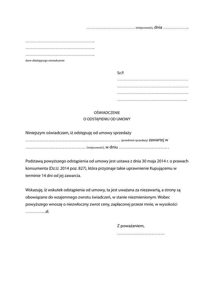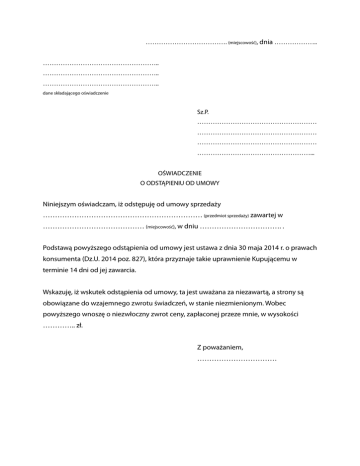 ………………………………. (miejscowość), dnia ……………….. …………………………………………….. …………………………………………….. …………………………………………….. dane składającego oświadczenie Sz.P. ……………………………………………… ……………………………………………… ……………………………………………… ……………………………………………... OŚWIADCZENIE O ODSTĄPIENIU OD UMOWY Niniejszym oświadczam, iż odstępuję od umowy sprzedaży ………………………………………………………… (przedmiot sprzedaży) zawartej w …………………………………… (miejscowość), w dniu ……………………………. . Podstawą powyższego odstąpienia od umowy jest ustawa z dnia 30 maja 2014 r. o prawach konsumenta (Dz.U. 2014 poz. 827), która przyznaje takie uprawnienie Kupującemu w terminie 14 dni od jej zawarcia. Wskazuję, iż wskutek odstąpienia od umowy, ta jest uważana za niezawartą, a strony są obowiązane do wzajemnego zwrotu świadczeń, w stanie niezmienionym. Wobec powyższego wnoszę o niezwłoczny zwrot ceny, zapłaconej przeze mnie, w wysokości ………….. zł. Z poważaniem, ……………………………