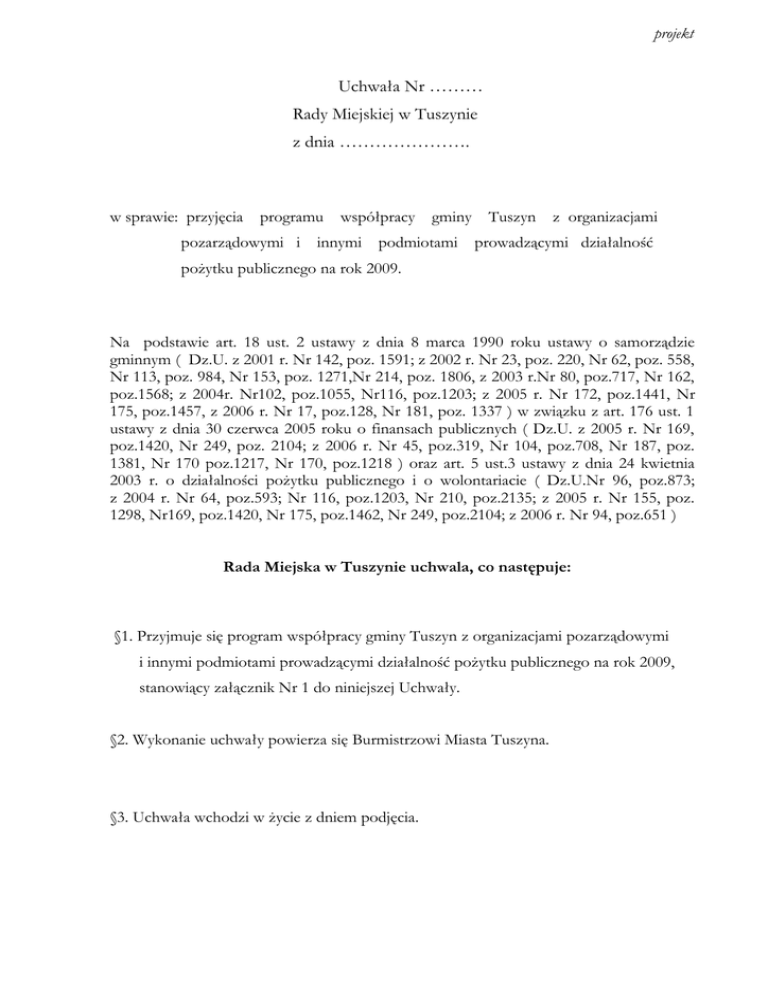 projekt Uchwała Nr ……… Rady Miejskiej w Tuszynie z dnia …………………. w sprawie: przyjęcia programu pozarządowymi i współpracy innymi gminy podmiotami Tuszyn z organizacjami prowadzącymi działalność pożytku publicznego na rok 2009. Na podstawie art. 18 ust. 2 ustawy z dnia 8 marca 1990 roku ustawy o samorządzie gminnym ( Dz.U. z 2001 r. Nr 142, poz. 1591; z 2002 r. Nr 23, poz. 220, Nr 62, poz. 558, Nr 113, poz. 984, Nr 153, poz. 1271,Nr 214, poz. 1806, z 2003 r.Nr 80, poz.717, Nr 162, poz.1568; z 2004r. Nr102, poz.1055, Nr116, poz.1203; z 2005 r. Nr 172, poz.1441, Nr 175, poz.1457, z 2006 r. Nr 17, poz.128, Nr 181, poz. 1337 ) w związku z art. 176 ust. 1 ustawy z dnia 30 czerwca 2005 roku o finansach publicznych ( Dz.U. z 2005 r. Nr 169, poz.1420, Nr 249, poz. 2104; z 2006 r. Nr 45, poz.319, Nr 104, poz.708, Nr 187, poz. 1381, Nr 170 poz.1217, Nr 170, poz.1218 ) oraz art. 5 ust.3 ustawy z dnia 24 kwietnia 2003 r. o działalności pożytku publicznego i o wolontariacie ( Dz.U.Nr 96, poz.873; z 2004 r. Nr 64, poz.593; Nr 116, poz.1203, Nr 210, poz.2135; z 2005 r. Nr 155, poz. 1298, Nr169, poz.1420, Nr 175, poz.1462, Nr 249, poz.2104; z 2006 r. Nr 94, poz.651 ) Rada Miejska w Tuszynie uchwala, co następuje: §1. Przyjmuje się program współpracy gminy Tuszyn z organizacjami pozarządowymi i innymi podmiotami prowadzącymi działalność pożytku publicznego na rok 2009, stanowiący załącznik Nr 1 do niniejszej Uchwały. §2. Wykonanie uchwały powierza się Burmistrzowi Miasta Tuszyna. §3. Uchwała wchodzi w życie z dniem podjęcia. Załącznik Nr 1 do Uchwały Nr …………….. Rady Miejskiej w Tuszynie z dnia ………….. PROGRAM WSPÓŁPRACY POZARZĄDOWYMI I GMINY INNYMI TUSZYN Z ORGANIZACJAMI PODMIOTAMI PROWADZĄCYMI DZIAŁALNOŚĆ POŻYTKU PUBLICZNEGO NA ROK 2009 1. POSTANOWIENIA OGÓLNE 1. Program współpracy gminy Tuszyn z organizacjami pozarządowymi i innymi podmiotami prowadzącymi działalność pożytku publicznego jest elementem lokalnego systemu szeroko rozumianej polityki społecznej. 2. Program określa: formy, zasady, zakres współpracy gminy Tuszyn z organizacjami pozarządowymi i innymi podmiotami prowadzącymi działalność pożytku publicznego. 3. Ilekroć w niniejszym programie jest mowa o: a) „ustawie” – rozumie się przez to ustawę z dnia 24 kwietnia 2003r. o działalności pożytku publicznego i wolontariacie; b) „organizacji” lub „podmiotach programu” – rozumie się przez to organizacje pozarządowe, osoby prawne i jednostki organizacyjne, o których mowa w art. 3 ust. 2 i 3 ustawy; c) „programie” – rozumie się przez to „program współpracy gminy Tuszyn z organizacjami pozarządowymi i innymi podmiotami prowadzącymi działalność pożytku publicznego w 2009 roku”; d) „gminie” – rozumie się przez to gminę Tuszyn; e) „konkursie” – rozumie się przez to otwarty konkurs ofert, o którym mowa w art. 11 ust. 2 i 3 oraz w art. 13 ustawy; f) „dotacji” - rozumie się przez to dotację w rozumieniu art. 176 ust. 1 ustawy z dnia 30 czerwca 2005 roku o finansach publicznych ( Dz.U. z 2005 r. Nr 249, poz. 2103 i 2104 ) . 4. Obszar współpracy gminy Tuszyn z organizacjami obejmuje w szczególności sferę zadań publicznych, o których mowa w art. 4 ust. 1 ustawy. 2. CELE PROGRAMU Celem wprowadzenia programu współpracy gminy Tuszyn z organizacjami jest: 1. budowanie społeczeństwa obywatelskiego poprzez aktywizację społeczności lokalnej; 2. stworzenie warunków do zwiększenia aktywności obywatelskiej mieszkańców gminy Tuszyn; 3. uzupełnienie działań gminy Tuszyn w zakresie nie obejmowanym przez struktury samorządowe. 2 3. PODMIOTY PROGRAMU WSPÓŁPRACY Podmiotami współpracy są prowadzące swą działalność na terenie gminy Tuszyn lub dla mieszkańców gminy Tuszyn, nie będące jednostkami sektora finansów publicznych i nie działające w celu osiągnięcia zysku: a) organizacje pozarządowe; b) osoby prawne i jednostki organizacyjne działające na podstawie przepisów o stosunku Państwa do Kościoła Katolickiego w Rzeczypospolitej Polskiej, o stosunku Państwa do innych kościołów i związków wyznaniowych oraz o gwarancjach wolności sumienia i wyznania, jeżeli ich cele statutowe obejmują prowadzenie działalności pożytku publicznego; c) stowarzyszenia jednostek samorządu terytorialnego. 4. FORMY WSPÓŁPRACY W 2009 roku współpraca gminy Tuszyn z organizacjami pozarządowymi i innymi podmiotami prowadzącymi działalność pożytku publicznego będzie prowadzona w następujących formach: a) zlecanie realizacji zadań publicznych na zasadach określonych w ustawie o pożytku publicznym i wolontariacie poprzez: ▫ powierzanie wykonania zadań publicznych wraz z udzielaniem dotacji na finansowanie ich realizacji; ▫ wspieranie wykonywania zadań publicznych poprzez udzielanie dotacji na finansowanie ich realizacji. b) wzajemnego informowania się o planowanych kierunkach działalności i współdziałania w celu zharmonizowania tych kierunków; c) konsultowania aktów prawa lokalnego w dziedzinach aktywnej działalności podmiotów programu; d) rozbudowanie i aktualizacja witryny internetowej gminy Tuszyn o stronę z informacjami dotyczącymi organizacji pozarządowych z terenu gminy Tuszyn; e) organizacja lub współudział organów samorządu Gminy Tuszyn w organizacji szkoleń, konferencji, forum wymiany doświadczeń, w celu podniesienia sprawności funkcjonowania organizacji. 3 5. SFERA ZADAŃ PUBLICZNYCH PLANOWANYCH DO REALIZACJI W 2009 ROKU WE WSPÓŁPRACY Z PODMIOTAMI PROGRAMU. Lp. Sfera zadań Zadania do realizacji w roku 2008 na podstawie ustawy Kwota publicznych o działalności pożytku publicznego i o wolontariacie przeznaczona na Wypoczynek dzieci Organizowanie czasu wolnego dzieci i młodzieży w formie koloni i młodzieży i obozów. Szkolenie sportowe dzieci i młodzieży oraz grup seniorów w ramach piłki nożnej mężczyzn, organizowan