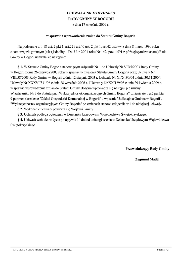 UCHWAŁA NR XXXVI/242/09 RADY GMINY W BOGORII z dnia 17 września 2009 r. w sprawie : wprowadzenia zmian do Statutu Gminy Bogoria Na podstawie art. 18 ust. 2 pkt 1, art.22 i art.40 ust. 2 pkt 1, art.42 ustawy z dnia 8 marca 1990 roku o samorządzie gminnym (tekst jednolity – Dz. U. z 2001 roku Nr 142, poz. 1591 z późniejszymi zmianami) Rada Gminy w Bogorii uchwala, co następuje: § 1. W Statucie Gminy Bogoria stanowiącym załącznik Nr 1 do Uchwały Nr VI/45/2003 Rady Gminy w Bogorii z dnia 26 czerwca 2003 roku w sprawie uchwalenia Statutu Gminy Bogoria oraz; Uchwały Nr VIII/58/2003 Rady Gminy w Bogorii z dnia 12 sierpnia 2003 r, Uchwały Nr XIX/190/04 z dnia 30.11.2004, Uchwały Nr XXXVI/331/06 z dnia 28 września 2006 r. i Uchwały Nr XX/129/08 z dnia 29 kwietnia 2009 r. w sprawie wprowadzenia zmian do Statutu Gminy Bogoria wprowadza się następujące zmiany: W załączniku Nr 3 do Statutu pn. „Wykaz jednostek organizacyjnych Gminy Bogoria”: zmienia się treść punktu 9 poprzez skreślenie "Zakład Gospodarki Komunalnej w Bogorii" a wpisanie "Jadłodajnia Gminna w Bogorii". "Wykaz jednostek organizacyjnych Gminy Bogoria" po zmianach stanowi załącznik nr 1 do niniejszej uchwały. § 2. Wykonanie uchwały powierza się Wójtowi Gminy. § 3. Uchwała podlega ogłoszeniu w Dzienniku Urzędowym Województwa Świętokrzyskiego. § 4. Uchwała wchodzi w życie po upływie 14 dni od dnia ogłoszenia w Dzienniku Urzędowym Województwa Świętokrzyskiego. Przewodniczący Rady Gminy Zygmunt Madej Załącznik do Uchwały Nr XXXVI/242/09 Rady Gminy w Bogorii z dnia 17 września 2009 r. WYKAZ JEDNOSTEK ORGANIZACYJNYCH GMINY BOGORIA 1. Zespół Szkół Ogólnokształcących w Bogorii. 2. Publiczna Szkoła Podstawowa w Bogorii. 3. Publiczna Szkoła Podstawowa w Niedźwiedziu. 4. Zespół Placówek Oświatowych w Jurkowicach -Publiczna Szkoła Podstawowa i Przedszkole. 5. Zespół Placówek Oświatowych w Szczeglicach -Publiczna Szkoła Podstawowa i Przedszkole. 6. Zespół Ekonomiczno-Administracyjny Szkół i Przedszkoli w Bogorii 7. Publiczne Przedszkole w Bogorii. 8. Ośrodek Pomocy Społecznej w Bogorii. Jadłodajnia Gminna w Bogorii. Podpisany. ID:9. UVLVL-VLNOS-PBLRQ-YIGLA-LHUDJ. 10. Gminny Ośrodek Kultury w Bogorii. Strona 1 / 2 Zygmunt Madej Załącznik do Uchwały Nr XXXVI/242/09 Rady Gminy w Bogorii z dnia 17 września 2009 r. WYKAZ JEDNOSTEK ORGANIZACYJNYCH GMINY BOGORIA 1. Zespół Szkół Ogólnokształcących w Bogorii. 2. Publiczna Szkoła Podstawowa w Bogorii. 3. Publiczna Szkoła Podstawowa w Niedźwiedziu. 4. Zespół Placówek Oświatowych w Jurkowicach -Publiczna Szkoła Podstawowa i Przedszkole. 5. Zespół Placówek Oświatowych w Szczeglicach -Publiczna Szkoła Podstawowa i Przedszkole. 6. Zespół Ekonomiczno-Administracyjny Szkół i Przedszkoli w Bogorii 7. Publiczne Przedszkole w Bogorii. 8. Ośrodek Pomocy Społecznej w Bogorii. 9. Jadłodajnia Gminna w Bogorii. 10. Gminny Ośrodek Kultury w Bogorii. ID: UVLVL-VLNOS-PBLRQ-YIGLA-LHUDJ. Podpisany. Strona 2 / 2