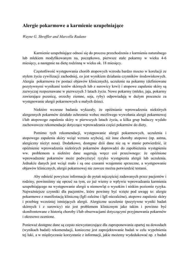 Alergie pokarmowe a karmienie uzupełniające Wayne G. Shreffler and Marcella Radano Karmienie uzupełniające odnosi się do procesu przechodzenia z karmienia naturalnego lub mlekiem modyfikowanym na, początkowo, pierwsze stałe pokarmy w wieku 4-6 miesięcy, a następnie na dietę rodzinną w wieku ok. 18 miesięcy. Częstotliwość występowania chorób atopowych wzrosła bardzo mocno w korelacji ze stylem życia cywilizacji zachodniej, co jest wynikiem działania czynników środowiskowych. Alergia pokarmowa (w postaci objawów klinicznych), uczulenie na pokarmy (definiowane pozytywnymi wynikami testów skórnych lub z surowicy krwi) i atopowe zapalenie skóry są zazwyczaj rozpoznawane w pierwszych 3 latach życia. Nowe pokarmy (mleko, jaja, pokarmy zawierające pszenicę, orzechy ziemne, soja, ryby) odpowiadają w dużym procencie za występowanie alergii pokarmowych u małych dzieci. Niektóre wczesne badania wykazały, że opóźnianie wprowadzenia niektórych alergennych pokarmów działało ochronnie wobec możliwego wywołania alergii pokarmowej i/lub atopowego zapalenia skóry w pierwszych latach życia, a kilka grup badaczy wydało zachowawcze rekomendacje dotyczące wprowadzania części pokarmów do diety. Pomimo tych rekomendacji, występowanie alergii pokarmowych, uczulenia i atopowego zapalenia skóry wciąż wzrasta szybciej, niż inne choroby atopowe (np. astma, alergiczny nieżyt nosa). Dodatkowo, dostępne dziś dane nie są w stanie potwierdzić, iż opóźnienie wprowadzenia niektórych pokarmów doprowadzi do zapobieżenia wystąpieniu ww. problemom a niektóre dane sugerują wręcz coś przeciwnego: że opóźnione wprowadzenie pokarmów może podwyższyć ryzyko wystąpienia alergii lub uczulenia. Jednakże danych jest wciąż mało i są one czasami wzajemnie sprzeczne, a występowanie objawów klinicznych, alergii pokarmowej nie zawsze można potwierdzić testami. Aby odnieść powyższe informacje do pytań najczęściej zadawanych przez pacjentów i rodziny, powinniśmy się oprzeć na tym, co już wiemy o wpływie wprowadzania karmienia uzupełniającego na występowanie alergii u niemowląt o wysokim i niskim poziomie ryzyka. Najważniejsze czynniki dla pacjentów, które powinny być wzięte pod uwagę to: alergie pokarmowe z manifestacją kliniczną (IgE-zależne i IgE-niezależne), atopowe zapalenie skóry i przebieg wcześniej istniejących alergii. Alergiczne uczulenie (pozytywne wyniki badań skórnych i z surowicy) nie jest problemem klinicznym jako takim i powinno być skonfrontowane z historią choroby i/lub obserwacjami dotyczącymi przyjmowania pokarmów i okresowo ocenione. Ponieważ dostępne dane są często niewystarczające dla zaproponowania opartej na dowodach (wynikach badań) rekomendacji, konieczne jest zaprojektowanie badań w celu wypełnienia tej luki, a w międzyczasie korzystanie z informacji, jakie możemy wydedukować np. z badań konkretnych alergenów, badań immunoterapeutycznych, badań odpowiedzi immunologicznej błony śluzowej u zwierząt, itp. Możemy myśleć o potencjalnej roli karmienia uzupełniającego i jego wpływie na uczulenie, kliniczną alergię (wraz z wpływem na atopowe zapalenie skóry) i zaproponować wczesne działanie nakierowanym na profilaktykę lub leczenie (rys. 1). Uczulenie alergiczne jest określane przez charakterystyczne dla danego alergenu IgE oznaczane poprzez przezskórny test punktowy lub pomiar w surowicy krwi poprzez zastosowanie badania wiązania fazy stałej. Ważnym jest by wziąć pod uwagę, iż pozytywne wyniki tych testów są bardziej powszechne niż kliniczna choroba alergiczna. Istnieją sprzeczne dane pokazujące wpływ opóźniania wprowadzenia pokarmów uzupełniających na zmniejszenie częstotliwości uczulenia na pokarmy w pierwszych latach życia, przy czym badania długookresowe nie wykazały trwałej zależności. Część dzieci z atopowym zapaleniem skóry cierpi na alergię pokarmową, u części może choroba może być wywoływana przez alergen pokarmowy, choć taki poziom rozróżnienia nie został osiągnięty w większości badań skupiających się na roli wprowadzenia pokarmów uzupełniających. Niektóre badania wykazały wyższą częstotliwość chorób alergicznych w sytuacji, gdy niemowlętom podawano pokarmy stałe przed ukończeniem 4 mies. życia, ale u dzieci powyżej 2 roku życia nie stwierdzono efektu ochronnego opóźnionego wprowadzenia pokarmu stałego. W niektórych badaniach wykazano nawet mechanizm ochronny wprowadzania silnie alergizujących pokarmów w okresie niemowlęcym (np. ryby i orzechy ziemne). Badania ekspozycji na alergeny pokarmowe u dzieci z już potwierdzoną alergią pokarmową nie mieściły się w ramach czasowych wprowadzenia pokarmu stałego do diety niemowlęcia, ale wydaje się, że potwierdzają fakt, iż ekspozycja w formie i dawkach niewywołujących natychmiastowej reakcji indukuje tolerancję pokarmową. Rysunek 1 Model rozwoju lub ustąpienia alergii pokarmowej względem wprowadzenia karmienia uzupełniającego Bibliografia: 1. Zeiger RS, Heller S: The development and prediction of atopy in high-risk children: follow-up at age seven years in a prospective randomized study of combined maternal and infant food allergen avoidance. J Allergy Clin Immunol 1995;95:1179–1190. 2. American Academy of Pediatrics Committee on Nutrition: Hypoallergenic infant formulas. Pediatrics 2000;106:346–349. 3. Kramer MS, Kakuma R: Optimal duration of exclusive breastfeeding. Cochrane Database Syst Rev 2002;CD003517. 4. du Toit G, Katz Y, Sasieni P, et al: Early consumption of peanuts in infancy is associated with a low prevalence of peanut allergy. J Allergy Clin Immunol 2008;122:984–991. 5. Nowak-Wegrzyn A, Bloom KA, Sicherer SH, et al: Tolerance to extensively heated milk in children with cow’s milk allergy. J Allergy Clin Immunol 2008;122:342–347
