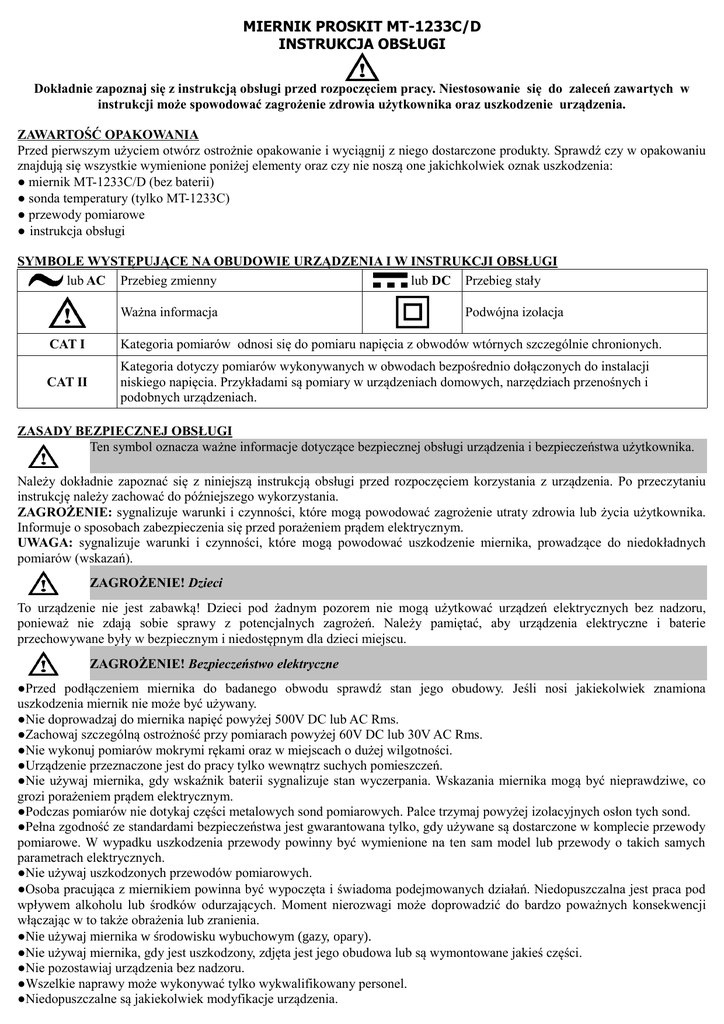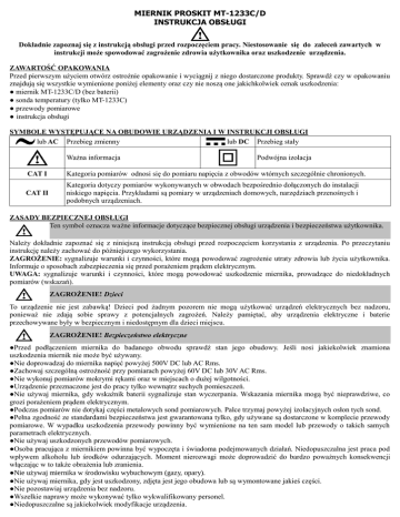 MIERNIK PROSKIT MT-1233C/D INSTRUKCJA OBSŁUGI Dokładnie zapoznaj się z instrukcją obsługi przed rozpoczęciem pracy. Niestosowanie się do zaleceń zawartych w instrukcji może spowodować zagrożenie zdrowia użytkownika oraz uszkodzenie urządzenia. ZAWARTOŚĆ OPAKOWANIA Przed pierwszym użyciem otwórz ostrożnie opakowanie i wyciągnij z niego dostarczone produkty. Sprawdź czy w opakowaniu znajdują się wszystkie wymienione poniżej elementy oraz czy nie noszą one jakichkolwiek oznak uszkodzenia: ● miernik MT-1233C/D (bez baterii) ● sonda temperatury (tylko MT-1233C) ● przewody pomiarowe ● instrukcja obsługi SYMBOLE WYSTĘPUJĄCE NA OBUDOWIE URZĄDZENIA I W INSTRUKCJI OBSŁUGI lub AC Przebieg zmienny lub DC Przebieg stały Ważna informacja Podwójna izolacja CAT I Kategoria pomiarów odnosi się do pomiaru napięcia z obwodów wtórnych szczególnie chronionych. CAT II Kategoria dotyczy pomiarów wykonywanych w obwodach bezpośrednio dołączonych do instalacji niskiego napięcia. Przykładami są pomiary w urządzeniach domowych, narzędziach przenośnych i podobnych urządzeniach. ZASADY BEZPIECZNEJ OBSŁUGI Ten symbol oznacza ważne informacje dotyczące bezpiecznej obsługi urządzenia i bezpieczeństwa użytkownika. Należy dokładnie zapoznać się z niniejszą instrukcją obsługi przed rozpoczęciem korzystania z urządzenia. Po przeczytaniu instrukcję należy zachować do późniejszego wykorzystania. ZAGROŻENIE: sygnalizuje warunki i czynności, które mogą powodować zagrożenie utraty zdrowia lub życia użytkownika. Informuje o sposobach zabezpieczenia się przed porażeniem prądem elektrycznym. UWAGA: sygnalizuje warunki i czynności, które mogą powodować uszkodzenie miernika, prowadzące do niedokładnych pomiarów (wskazań). ZAGROŻENIE! Dzieci To urządzenie nie jest zabawką! Dzieci pod żadnym pozorem nie mogą użytkować urządzeń elektrycznych bez nadzoru, ponieważ nie zdają sobie sprawy z potencjalnych zagrożeń. Należy pamiętać, aby urządzenia elektryczne i baterie przechowywane były w bezpiecznym i niedostępnym dla dzieci miejscu. ZAGROŻENIE! Bezpieczeństwo elektryczne ●Przed podłączeniem miernika do badanego obwodu sprawdź stan jego obudowy. Jeśli nosi jakiekolwiek znamiona uszkodzenia miernik nie może być używany. ●Nie doprowadzaj do miernika napięć powyżej 500V DC lub AC Rms. ●Zachowaj szczególną ostrożność przy pomiarach powyżej 60V DC lub 30V AC Rms. ●Nie wykonuj pomiarów mokrymi rękami oraz w miejscach o dużej wilgotności. ●Urządzenie przeznaczone jest do pracy tylko wewnątrz suchych pomieszczeń. ●Nie używaj miernika, gdy wskaźnik baterii sygnalizuje stan wyczerpania. Wskazania miernika mogą być nieprawdziwe, co grozi porażeniem prądem elektrycznym. ●Podczas pomiarów nie dotykaj części metalowych sond pomiarowych. Palce trzymaj powyżej izolacyjnych osłon tych sond. ●Pełna zgodność ze standardami bezpieczeństwa jest gwarantowana tylko, gdy używane są dostarczone w komplecie przewody pomiarowe. W wypadku uszkodzenia przewody powinny być wymienione na ten sam model lub przewody o takich samych parametrach elektrycznych. ●Nie używaj uszkodzonych przewodów pomiarowych. ●Osoba pracująca z miernikiem powinna być wypoczęta i świadoma podejmowanych działań. Niedopuszczalna jest praca pod wpływem alkoholu lub środków odurzających. Moment nierozwagi może doprowadzić do bardzo poważnych konsekwencji włączając w to także obrażenia lub zranienia. ●Nie używaj miernika w środowisku wybuchowym (gazy, opary). ●Nie używaj miernika, gdy jest uszkodzony, zdjęta jest jego obudowa lub są wymontowane jakieś części. ●Nie pozostawiaj urządzenia bez nadzoru. ●Wszelkie naprawy może wykonywać tylko wykwalifikowany personel. ●Niedopuszczalne są jakiekolwiek modyfikacje urządzenia. ●Miejsce pracy zawsze utrzymuj w czystości. Pracuj tylko w warunkach dobrego oświetlenia. Bałagan w miejscu pracy oraz złe oświetlenie mogą prowadzić do wypadku. UWAGA! ●Nigdy nie przekraczaj wartości granicznych wielkości elektrycznych podanych dla każdego zakresu pomiarowego. Gdy nie jest znana skala mierzonej wielkości elektrycznej zacznij pomiary od najwyższego zakresu. ●Przed zmianą zakresu pomiarowego przełącznikiem obrotowym odłącz przewody pomiarowe od mierzonego obwodu. ●Przed pomiarem rezystancji, diody lub ciągłości obwodu rozładuj kondensatory oraz odłącz wszystkie źródła zasilania obwodu. ●Wyjmij baterie z miernika, gdy nie będzie on używany przez dłuższy czas. ●Przed wymianą baterii upewnij się, że miernik jest wyłączony. ●Okresowo można czyścić obudowę miernika wilgotną ściereczką ze słabym detergentem. Nie używaj do czyszczenia past ściernych oraz rozpuszczalników. DANE TECHNICZNE Kategorie pomiarowe Zasilanie Wyświetlacz Wybór zakresu Wskaźnik przekroczenia zakresu Wskaźnik polaryzacji Wskaźnik rozładowania baterii Bezpiecznik Temperatura pracy Temperatura przechowywania Wymiary Waga CAT I 600V, CAT II 300V 3V, 2 x bateria R3 AAA LCD 3½ cyfry, max wskazanie 1999 ręcznie 1 ▬ dla ujemnej polaryzacji na wyświetlaczu 5x20mm szybki 200mA/250V 0°C ~ 40°C -10°C ~ 50°C 130 x 72 x 28mm 130g BUDOWA 1. Wyświetlacz LCD. 2. Przycisk HOLD. 3. Przycisk podświetlania wyświetlacza LCD. 4. Przełącznik obrotowy. 5. Gniazdo pomiarowe VΩmA. 6. Gniazdo pomiarowe 10A. 7. Gniazdo COM. OBSŁUGA Pomiar napięcia stałego DC lub zmiennego AC ZAGROŻENIE! Aby uniknąć szkód lub niebezpieczeństwa porażenia elektrycznego nie należy mierzyć napięć powyżej 500V DC lub AC RMS. Zachowaj szczególną ostrożność przy pomiarach powyżej 60V DC lub 30V AC RMS. 1. Ustaw przełącznik obrotowy na odpowiedni zakres pomiaru napięcia stałego V lub zmiennego V . 2. Czerwony przewód pomiarowy podłącz do gniazda VΩmA, a czarny do gniazda COM. 3. Odczytaj wynik pomiaru na wyświetlaczu LCD. Dla nap