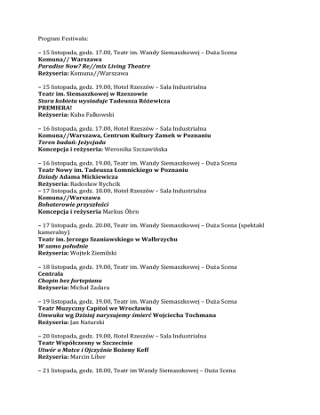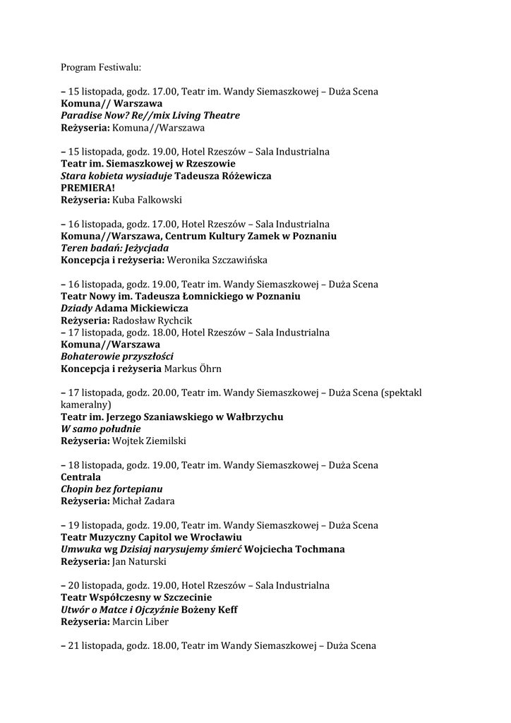 Program Festiwalu: – 15 listopada, godz. 17.00, Teatr im. Wandy Siemaszkowej – Duża Scena Komuna// Warszawa Paradise Now? Re//mix Living Theatre Reżyseria: Komuna//Warszawa – 15 listopada, godz. 19.00, Hotel Rzeszów – Sala Industrialna Teatr im. Siemaszkowej w Rzeszowie Stara kobieta wysiaduje Tadeusza Różewicza PREMIERA! Reżyseria: Kuba Falkowski – 16 listopada, godz. 17.00, Hotel Rzeszów – Sala Industrialna Komuna//Warszawa, Centrum Kultury Zamek w Poznaniu Teren badań: Jeżycjada Koncepcja i reżyseria: Weronika Szczawińska – 16 listopada, godz. 19.00, Teatr im. Wandy Siemaszkowej – Duża Scena Teatr Nowy im. Tadeusza Łomnickiego w Poznaniu Dziady Adama Mickiewicza Reżyseria: Radosław Rychcik – 17 listopada, godz. 18.00, Hotel Rzeszów – Sala Industrialna Komuna//Warszawa Bohaterowie przyszłości Koncepcja i reżyseria Markus Öhrn – 17 listopada, godz. 20.00, Teatr im. Wandy Siemaszkowej – Duża Scena (spektakl kameralny) Teatr im. Jerzego Szaniawskiego w Wałbrzychu W samo południe Reżyseria: Wojtek Ziemilski – 18 listopada, godz. 19.00, Teatr im. Wandy Siemaszkowej – Duża Scena Centrala Chopin bez fortepianu Reżyseria: Michał Zadara – 19 listopada, godz. 19.00, Teatr im. Wandy Siemaszkowej – Duża Scena Teatr Muzyczny Capitol we Wrocławiu Umwuka wg Dzisiaj narysujemy śmierć Wojciecha Tochmana Reżyseria: Jan Naturski – 20 listopada, godz. 19.00, Hotel Rzeszów – Sala Industrialna Teatr Współczesny w Szczecinie Utwór o Matce i Ojczyźnie Bożeny Keff Reżyseria: Marcin Liber – 21 listopada, godz. 18.00, Teatr im Wandy Siemaszkowej – Duża Scena Narodowy Stary Teatr w Krakowie Akropolis wg Stanisława Wyspiańskiego Reżyseria: Łukasz Twarkowski – 21 listopada, godz. 20.00, Hotel Rzeszów – Sala Industrialna Teatr im. Siemaszkowej w Rzeszowie Stara kobieta wysiaduje Tadeusza Różewicza Reżyseria: Kuba Falkowski Specjalnie dla Państwa po raz drugi! WYDARZENIA TOWARZYSZĄCE KINOTEATR – filmowe rejestracje remiksów, czyli nowych interpretacji legendarnych dzieł z obszaru teatru, tańca i sztuk wizualnych, zrealizowanych w ramach nowatorskiego projektu KOMUNY// WARSZAWA 17 listopada, godz. 11.00, Mała Scena – ekranizacje współczesnych polskich sztuk zrealizowane w Wytwórni Filmów Dokumentalnych i Fabularnych w Warszawie w ramach cyklu TEATROTEKA Walizka Małgorzaty Sikorskiej-Miszczuk; Trash Story Magdy Fertacz 19 listopada, godz. 11.00, Mała Scena Cukier Stanik Zyty Rudzkiej; Walentyna Julii Kamińskiej i Wojciecha Farugi 20 listopada, godz 11.00, Mała Scena – wideoteatr/spektakl dokamerowy o Jerzym Grotowskim i Ryszardzie Cieślaku Książę, reż. Karol Radziszewski 18 listopada, godz. 11.00, Mała Scena DRAMA LAB – nocne czytania najnowszych polskich sztuk/ tekstów dla teatru 18,19,20 listopada, godz. 22.00, Galeria Szajna TEATR LAB – szkic sceniczny rejestrujący wstępny etap pracy nad spektaklem 21 listopada, godz.11.00, Galeria Szajna ROZMOWY O TEATRZE – wieczorne spotkania z twórcami spektakli 16,17,18,19,20 listopada, po ostatnim spektaklu, Salonik Siemaszkowej – Kawiarnia Artystyczna lub Hotel Rzeszów – Sala Industrialna Na wydarzenia towarzyszące wstęp wolny!