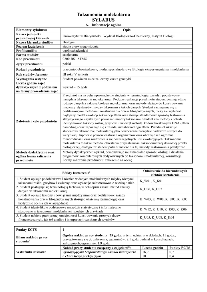 Taksonomia molekularna SYLABUS A. Informacje ogólne Elementy sylabusu Opis Nazwa jednostki prowadzącej kierunek Nazwa kierunku studiów Poziom kształcenia Profil studiów Forma studiów Kod przedmiotu Język przedmiotu Uniwersytet w Białymstoku, Wydział Biologiczno-Chemiczny, Instytut Biologii Rodzaj przedmiotu Rok studiów /semestr Wymagania wstępne Liczba godzin zajęć dydaktycznych z podziałem na formy prowadzenia zajęć przedmiot obowiązkowy, moduł specjalnościowy Biologia eksperymentalna i molekularna III rok / V semestr Student powinien mieć zaliczony kurs z genetyki Założenia i cele przedmiotu Metody dydaktyczne oraz ogólna forma zaliczenia przedmiotu Biologia studia pierwszego stopnia ogólnoakademicki stacjonarne 0200-BS1-5TMO polski wykład – 15 godz. Przedmiot ma na celu wprowadzenie studenta w terminologię, zasady i podstawowe narzędzia taksonomii molekularnej. Podczas realizacji przedmiotu student poznaje różne rodzaje danych z zakresu biologii molekularnej oraz metody służące do konstruowania macierzy dystansów między taksonami z takich danych. Student zaznajamia się z podstawowymi metodami konstruowania drzew filogenetycznych, uczy się wybierać najlepszy model ewolucji sekwencji DNA oraz stosuje standardowe sposoby testowania statystycznego uzyskanych powiązań między taksonami. Student zna metody i potrafi identyfikować taksony roślin, grzybów i zwierząt metodą kodów kreskowych DNA (DNA barcoding) oraz zapoznaje się z zasadą metabarkodingu DNA. Przedmiot ukazuje studentowi taksonomię molekularną jako nowoczesne narzędzie badawcze służące do weryfikacji hipotez o pokrewieństwach organizmów oraz obrazuje ich ogromną różnorodność i czas rozdzielenia się poszczególnych linii ewolucyjnych. Taksonomia molekularna to także metoda określania przynależności taksonomicznej dowolnej próbki biologicznej, dlatego też student potrafi znaleźć dla tej metody zastosowania praktyczne. Metody dydaktyczne: wykład, demonstracje multimedialne sposobu obsługi i działania programów komputerowych dedykowanych do taksonomii molekularnej, konsultacje. Formy zaliczenia przedmiotu: zaliczenie na ocenę. Efekty kształceniai 1. Student opisuje podobieństwa i różnice w danych molekularnych między różnymi taksonami roślin, grzybów i zwierząt oraz wykazuje zainteresowanie wiedzą o nich. 2. Student posługuje się terminologią fachową w celu opisu zasad i metod analizy danych w taksonomii molekularnej. 3. Student opisuje taksony i powiązania między nimi oraz podstawowe zasady konstruowania drzew filogenetycznych stosując właściwą terminologię oraz krytycznie ocenia ich wiarygodność. 4. Student identyfikuje podstawowe narzędzia statystyczne i informatyczne stosowane w taksonomii molekularnej i podaje ich przykłady. 5. Student nabiera praktycznej umiejętności konstruowania prostych drzew filogenetycznych, jak też analizy i interpretacji uzyskanych wyników. Punkty ECTS Bilans nakładu pracy studentaii Wskaźniki ilościowe Odniesienie do kierunkowych efektów kształcenia K_W01, K_K01 K_U06, K_U07 K_W03, K_W08, K_U03, K_K03 K_W12, K_U10, K_K03, K_K06 K_U05, K_U08, K_K04 1 Ogólny nakład pracy studenta: 25 godz. w tym: udział w wykładach: 15 godz.; przygotowanie się do zaliczenia, egzaminów: 8,1 godz.; udział w konsultacjach, zaliczeniach, egzaminie: 1,9 godz. Nakład pracy studenta związany z zajęciamiiii: Liczba godzin Punkty ECTS 16,9 0,7 wymagającymi bezpośredniego udziału nauczyciela 10 0,4 o charakterze praktycznym Data opracowania: 31. 08. 2015 Koordynator przedmiotu: Prof. dr hab. Mirosław Ratkiewicz SYLABUS B. Informacje szczegółowe Elementy składowe sylabusu Nazwa przedmiotu Taksonomia molekularna Kod przedmiotu Nazwa kierunku Nazwa jednostki prowadzącej kierunek Język przedmiotu 0200-BS1-5TMO Biologia eksperymentalna i molekularna, studia pierwszego stopnia Wydział Biologiczno-Chemiczny UwB, Instytut Biologii polski Rok studiów/ semestr trzeci rok, pierwszy semestr (zimowy) Liczba godzin zajęć dydaktycznych oraz forma prowadzenia zajęć Prowadzący 15 godz., wykład. Treści merytoryczne przedmiotu: 1. 2. Efekty kształcenia wraz ze sposobem ich weryfikacji Opis Prof. dr hab. Mirosław Ratkiewicz Założenia i zasady taksonomii molekularnej. Drzewa filogenetyczne jako hipotezy ewolucyjne do odtwarzania pokrewieństw filogenetycznych. 3. Podstawowe pojęcia w taksonomii molekularnej dotyczące drzew filogenetycznych i rekonstrukcji przebiegu filogenezy. 4. Saturacja sekwencji DNA oraz analiza i interpretacja obserwowanej zmienności sekwencji DNA i białek między taksonami. 5. Zasady i metody konstruowania macierzy dystansów między taksonami z zastosowaniem danych molekularnych. 6. Modele ewolucji sekwencji DNA oraz dobór modelu do odtworzenia najbardziej prawdopodobnego przebiegu filogenezy. 7. Identyfikacja gatunków zwierząt, roślin i grzybów za pomocą krótkich sekwencji DNA (kodowanie kresowe DNA) oraz zasada tzw. metabarcodingu DNA. 8. Teoria zegara molekularnego oraz zasady datowania zdarzeń ewolucyjnych. 9. Metody stosowane w taksonomii molekularnej bakterii. 10. Taksonomia molekularna a diagnostyka i epidemiologia molekularna. 11. Proste metody konstrukcji drzew filogenetycznych: UPGMA, NJ, MP i ML oraz warunki, jakie muszą one spełniać. 12. Metody statystyczne testowania wiarygodności uzyskanych drzew filogenetycznych. 13. Praktyczna obróbka danych molekularnych i konstruowanie drzew filogenetycznych oraz inne analizy bioinformatyczne z zastosowaniem baz NCBI, BOLD System oraz programu do analiz filogenetycznych MEGA. 14. Przykładowe wyniki analiz taksonomii molekularnej, które zmieniły dotychczasowe rozumienie powiązań między taksonami. Efekty kształcenia: 1. Student identyfikuje metodami taksonomii molekularnej różnej jednostki systematyczne i powiązania między nimi oraz zna podstawowe zasady konstruowania drzew filogenetycznych. 2. Student nabiera 