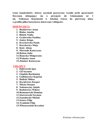 Lista kandydatów, którzy uzyskali pozytywne wyniki prób sprawności fizycznej ubiegający się o przyjęcie do Gimnazjum nr 1 im. Tadeusza Kościuszki w Jeleniej Górze do pierwszej klasy o profilu piłka koszykowa dziewcząt i chłopców. DZIEWCZĘTA 1. Bankiewicz Anna 2. Białas Amelia 3. Biniek Nadia 4. Grabowska Paulina 5. Joniec Kinga 6. Krzykowska Paula 7. Kuryłowicz Maja 8. Kuty Alicja 9. Morenda Katarzyna 10.Raban Julia 11.Ranecka Małgorzata 12.Wałęska Anna 13.Zimmer Katarzyna CHŁOPCY 1. Dąbrowski Igor 2. Gil Szymon 3. Glądała Bartłomiej 4. Gulbinowicz Kajetan 5. Halicki Miłosz 6. Koralewicz Kacper 7. Mścisz Kacper 8. Nakoneczny Jakub 9. Rodziewicz Wiktor 10.Romanowski Damian 11.Starczewski Szymon 12.Szandurski Michał 13.Szturo Filip 14.Tymiński Filip 15.Włoszczyński Krystian Komisja rekrutacyjna