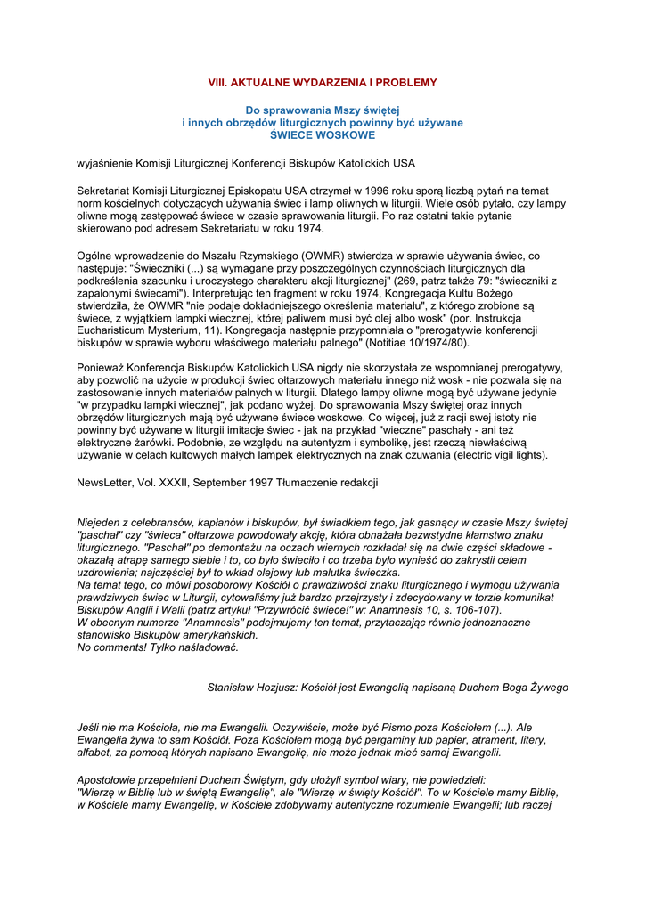 VIII. AKTUALNE WYDARZENIA I PROBLEMY Do sprawowania Mszy świętej i innych obrzędów liturgicznych powinny być używane ŚWIECE WOSKOWE wyjaśnienie Komisji Liturgicznej Konferencji Biskupów Katolickich USA Sekretariat Komisji Liturgicznej Episkopatu USA otrzymał w 1996 roku sporą liczbą pytań na temat norm kościelnych dotyczących używania świec i lamp oliwnych w liturgii. Wiele osób pytało, czy lampy oliwne mogą zastępować świece w czasie sprawowania liturgii. Po raz ostatni takie pytanie skierowano pod adresem Sekretariatu w roku 1974. Ogólne wprowadzenie do Mszału Rzymskiego (OWMR) stwierdza w sprawie używania świec, co następuje: "Świeczniki (...) są wymagane przy poszczególnych czynnościach liturgicznych dla podkreślenia szacunku i uroczystego charakteru akcji liturgicznej" (269, patrz także 79: "świeczniki z zapalonymi świecami"). Interpretując ten fragment w roku 1974, Kongregacja Kultu Bożego stwierdziła, że OWMR "nie podaje dokładniejszego określenia materiału", z którego zrobione są świece, z wyjątkiem lampki wiecznej, której paliwem musi być olej albo wosk" (por. Instrukcja Eucharisticum Mysterium, 11). Kongregacja następnie przypomniała o "prerogatywie konferencji biskupów w sprawie wyboru właściwego materiału palnego" (Notitiae 10/1974/80). Ponieważ Konferencja Biskupów Katolickich USA nigdy nie skorzystała ze wspomnianej prerogatywy, aby pozwolić na użycie w produkcji świec ołtarzowych materiału innego niż wosk - nie pozwala się na zastosowanie innych materiałów palnych w liturgii. Dlatego lampy oliwne mogą być używane jedynie "w przypadku lampki wiecznej", jak podano wyżej. Do sprawowania Mszy świętej oraz innych obrzędów liturgicznych mają być używane świece woskowe. Co więcej, już z racji swej istoty nie powinny być używane w liturgii imitacje świec - jak na przykład "wieczne" paschały - ani też elektryczne żarówki. Podobnie, ze względu na autentyzm i symbolikę, jest rzeczą niewłaściwą używanie w celach kultowych małych lampek elektrycznych na znak czuwania (electric vigil lights). NewsLetter, Vol. XXXII, September 1997 Tłumaczenie redakcji Niejeden z celebransów, kapłanów i biskupów, był świadkiem tego, jak gasnący w czasie Mszy świętej "paschał" czy "świeca" ołtarzowa powodowały akcję, która obnażała bezwstydne kłamstwo znaku liturgicznego. "Paschał" po demontażu na oczach wiernych rozkładał się na dwie części składowe okazałą atrapę samego siebie i to, co było świeciło i co trzeba było wynieść do zakrystii celem uzdrowienia; najczęściej był to wkład olejowy lub malutka świeczka. Na temat tego, co mówi posoborowy Kościół o prawdziwości znaku liturgicznego i wymogu używania prawdziwych świec w Liturgii, cytowaliśmy już bardzo przejrzysty i zdecydowany w torzie komunikat Biskupów Anglii i Walii (patrz artykuł "Przywrócić świece!" w: Anamnesis 10, s. 106-107). W obecnym numerze "Anamnesis" podejmujemy ten temat, przytaczając równie jednoznaczne stanowisko Biskupów amerykańskich. No comments! Tylko naśladować. Stanisław Hozjusz: Kościół jest Ewangelią napisaną Duchem Boga Żywego Jeśli nie ma Kościoła, nie ma Ewangelii. Oczywiście, może być Pismo poza Kościołem (...). Ale Ewangelia żywa to sam Kościół. Poza Kościołem mogą być pergaminy lub papier, atrament, litery, alfabet, za pomocą których napisano Ewangelię, nie może jednak mieć samej Ewangelii. Apostołowie przepełnieni Duchem Świętym, gdy ułożyli symbol wiary, nie powiedzieli: "Wierzę w Biblię lub w świętą Ewangelię", ale "Wierzę w święty Kościół". To w Kościele mamy Biblię, w Kościele mamy Ewangelię, w Kościele zdobywamy autentyczne rozumienie Ewangelii; lub raczej sam Kościół jest Ewangelię napisaną nie atramentem, ale Duchem Boga żywego, nie na tablicach kamiennych, ale na tablicach cielesnego serca. Sługa Boży Stanisław Kard. Hozjusz, "Opera omnia", Kolonia 1584, t. I, s. 321