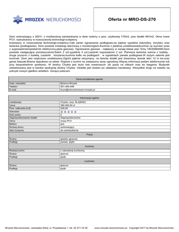 Oferta nr MRO-DS-270 Dom wolnostojący z 2001r. z możliwością zamieszkania w dwie rodziny o pow. użytkowej 170m2, pow działki 691m2. Okna nowe PCV. wybudowany w nowoczesnej technologii-ocieplony. budowany w nowoczesnej technologii-ocieplony.Cały parter ogrzewanie podłogowe,na piętrze sypialnie kaloryfery, korytarz oraz łazienka (podłogówka). Dom posiada instalację alarmową z monitoringiem.Kuchnia z jadalnią umeblowane(kuchnia na wymiar) wraz z wyposażeniem(piekarnik elektryczny,płyta gazowa). Ogrzewanie gazowe - najlepszy w swojej klasie piec firmy VIESSMANN.Dom posiada następujące pomieszczenia:Salon 2 szt.sypialnie 4 szt.Łazienki wyposażone 2 szt. Pierwsza łazienka wanna z toaletą , druga prysznic z toaletą. Łazienki , korytarze,kuchnia kafle na podłogach , w sypialniach panele podłogowe.W dużym salonie jest kominek .Dom jest częściowo umeblowany.Ogród pięknie utrzymany, na terenie działki jest drewniany domek letni 12 m kw.oraz garaż blaszak.Brama wjazdowa na pilota. Wyjście z kuchni na zadaszony taras ogrodowy.Więcej informacji podam telefonicznie lub przy bezpośrednim spotkaniu. W okolicy Chybia jest dużo tras rowerowych ,do jazdy na rolkach oraz do biegania. Budynek zlokalizowany jest w bardzo spokojnej okolicy Chybia. Osiedle jest świeżo po układaniu kanalizacji .Wszystkie drogi na osiedlu są pokryte nowym gładkim asfaltem. Gorąco polecam Dane kontaktowe agenta Imię i nazwisko Telefon E-mail Bożena Mrozek 501-494-409 [email protected] Informacje ogólne Lokalizacja Cena Pow. całkowita [m2] Standard Ilość pokoi Zagospodarowanie działki Okna Balkon Rodzaj domu Stan budynku Chybie, (woj. ŚLĄSKIE) 385 000,00 zł 230,00 5 Zagospodarowana nowe PCV jest wolnostojący do zamieszkania Pokój Ściany Podłogi gładzie gipsowe panele, płytki Kuchnia Rodzaj kuchni Ściany Podłogi z zabudową kuchenną glazura płytki Łazienka Ściany Podłogi glazura płytki Mrozek Nieruchomości, Jastrzębie-Zdrój, ul. Przykładowa 1, tel. 32 471 23 45 www.mrozek-nieruchomosci.pl Copyright 2017 by Mrozek Nieruchomości