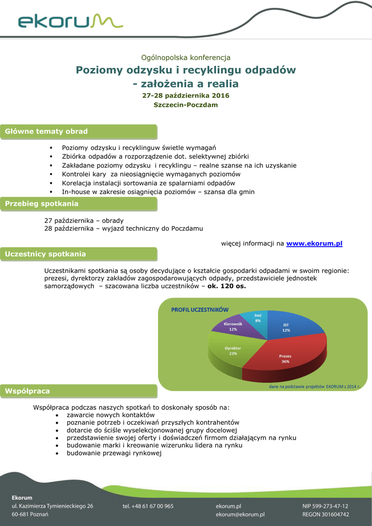 Ogólnopolska konferencja Poziomy odzysku i recyklingu odpadów - założenia a realia 27-28 października 2016 Szczecin-Poczdam Główne tematy obrad Poziomy odzysku i recyklingu w świetle wymagań Zbiórka odpadów a rozporządzenie dot. selektywnej zbiórki Zakładane poziomy odzysku i recyklingu – realne szanse na ich uzyskanie Kontrolei kary za nieosiągnięcie wymaganych poziomów Korelacja instalacji sortowania ze spalarniami odpadów In-house w zakresie osiągnięcia poziomów – szansa dla gmin Przebieg spotkania 27 października – obrady 28 października – wyjazd techniczny do Poczdamu więcej informacji na www.ekorum.pl Uczestnicy spotkania Uczestnikami spotkania są osoby decydujące o kształcie gospodarki odpadami w swoim regionie: prezesi, dyrektorzy zakładów zagospodarowujących odpady, przedstawiciele jednostek samorządowych – szacowana liczba uczestników – ok. 120 os. Współpraca Współpraca podczas naszych spotkań to doskonały sposób na: zawarcie nowych kontaktów poznanie potrzeb i oczekiwań przyszłych kontrahentów dotarcie do ściśle wyselekcjonowanej grupy docelowej przedstawienie swojej oferty i doświadczeń firmom działającym na rynku budowanie marki i kreowanie wizerunku lidera na rynku budowanie przewagi rynkowej ZOSTAŃ PARTNEREM Dla firm chcących współpracować z nami jako partner przygotowaliśmy pakiety, zawierające naszym zdaniem optymalne formy prezentacji. Są to nasze propozycje, które możemy dostosować do potrzeb partnera. Oferta ważna do dnia 17 października 2016 r., po tym terminie zakres pakietów może ulec zmianie. Możliwość realizacji pakietów będzie potwierdzana przez organizatora. Pakiet Partner główny wystąpienie podczas obrad (15 min.) powierzchnia wystawiennicza (ok 2.m2) bezpłatny udział 2 os. (bez koszów noclegu) referat w materiałach (do 8 str., druk cz-b) reklama w materiałach (1 str. druk kolor, okładka) rozdanie materiałów partnera rabat 10% na udział 4 gości partnera Zamieszczenie logo: zaproszenie drukowane (opcja do 14.09.16.) zaproszenie mailowe materiały konferencyjne prezentacja otwierająca program spotkania identyfikatory konferencyjne strona internetowa organizatora Kwota do ustalenia Pakiet Partner wystąpienie podczas obrad (10 min.) powierzchnia wystawiennicza (ok 2.m2) bezpłatny udział 1 os. (bez koszów noclegu) referat w materiałach (do 6 str., druk cz-b) reklama w materiałach (1 str. druk kolor) rozdanie materiałów partnera rabat 10% na udział 2 gości partnera Zamieszczenie logo: zaproszenie drukowane (opcja do 14.09.16.) zaproszenie mailowe materiały konferencyjne prezentacja otwierająca program spotkania strona internetowa organizatora Kwota do ustalenia Pakiet przedstawienie partnera kolacji bezpłatny udział 2 os. (bez koszów noclegu oraz wyjazdu zagr.) opcje prezentacji partnera podczas kolacji – do indywidualnego omówienia Pakiet Partner kolacji Dostępność pakietu do potwierdzenia Kwota do ustalenia Wystawca powierzchnia wystawiennicza (ok 2.m2) bezpłatny udział 1 os. (bez koszów noclegu oraz wyjazdu zagr.) rozdanie materiałów firmowych 1 600 zł netto Pakiet Reklama reklama w materiałach konf. (1 str. druk kolor) lub rozdanie materiałów firmowych 500 zł netto Ogólnopolska konferencja Poziomy odzysku i recyklingu odpadów 27-28 października 2016 Szczecin-Poczdam Formularz zamówienia Zgłoszenie wyślij skanem na e-maila [email protected] WARUNKI UCZESTNICTWA: Zamawiam Pakiet: Partner główny …………...………………………zł Partner ……………………………………zł Partner kolacji ……………………………………zł Wystawca ……………………………………zł Reklama/Foldery ……………………………………zł Całkowity koszt oferty brutto (z 23% VAT) ………....................... zł Osoby zgłoszone w ramach pakietu: Imię ……………………………… Imię ……………………………… Nazwisko ……………………………… Nazwisko ……………………………… Stanowisko ……………………………… Stanowisko ……………………………… E-mail ……………………………… E-mail ……………………………… Rezerwację hotelu prosimy potwierdzić przesyłając standardową kartę zgłoszenia do udziału w spotkaniu ……………………………………………………………………… ……………………………………………………………………… Adres ……………………………………………………………………… NIP: ……………………………………………………………………… Osoba do kontaktu ……………………………………………………………………… Tel ……………………………………………………………………… Fax ……………………………………………………………………… E-mail ……………………………………………………………………… Komu jeszcze Pani/Pana zdaniem przesłać informacje o tym spotkaniu: Imię i nazwisko Firma Tel/e-mail 2.Anulacji powyższego zgłoszenia można dokonać mailowo do dni 17 października 2016 r. Rezygnacja po tym terminie zobowiązuje do zapłaty. Przy rezygnacji ze współpracy a przy realizacji części pakietu zobowiązuję się do pokrycia kosztów z tym związanych. 3.W razie niewykorzystania wcześniej zarezerwowanego noclegu zobowiązuję się do zapłaty za ten nocleg. 4.Wszelkie spory mogące wynikać z tytułu niniejszego zlecenia rozpatrywane będą wg prawa polskiego i przez Sąd właściwy dla siedziby zleceniobiorcy. Prosimy o wystawienie faktury pro forma Nazwa firmy 1.Karta zgłoszenia stanowi akceptację warunków zawartych w informacjach organizacyjnych, Ogólnych Warunków Uczestnictwa w imprezach organizowanych przez firmę Ekorum z Poznania, dostępnych na www.ekorum.pl, oraz zobowiązu