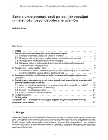 Szko∏a umiej´tnoÊci, czyli po co i jak rozwijaç umiej´tnoÊci psychospo∏eczne uczniów? Szkoła umiejętności, czyli po co i jak rozwijać umiejętności psychospołeczne uczniów Izabella Lutze Spis treści 1.Wstęp . . . . . . . . . . . . . . . . . . . . . . . . . . . . . . . . . . . . . . . . . . . . . . . . . . . . . . . . . . 1 2.Rola i znaczenie umiejętności psychospołecznych . . . . . . . . . . . . . . . . . . . . . 3 2.1.Samoświadomość, poczucie własnej wartości . . . . . . . . . . . . . . . . . . . . . . . 3 2.2.Umiejętności krytycznego myślenia oraz podejmowania decyzji . . . . . . . . . 3 2.3.Umiejętności interpersonalne/komunikacyjne . . . . . . . . . . . . . . . . . . . . . . . . 4 2.4.Radzenie sobie w sytuacjach trudnych oraz umiejętności związane z planowaniem swojego życia . . . . . . . . . . . . . . . . . . . . . . . . . . . . . . . . . . . . 6 3.Nauczyciel – obserwator i lider . . . . . . . . . . . . . . . . . . . . . . . . . . . . . . . . . . . . . 6 3.1.Podstawy formalno-prawne organizacji zajęć wspierających umiejętności psychospołeczne ucznia szkoły podstawowej . . . . . . . . . . . . . . . . . . . . . . . 7 4.Zatrzymać chwilę, czyli kiedy rozwijać umiejętności psychospołeczne uczniów . . . . . . . . . . . . . . . . . . . . . . . . . . . . . . . . . . . . . . . . . . . . . . . . . . . . . . . . . 14 5.Projektujemy współpracę, czyli praca projektami a rozwijanie umiejętności psychospołecznych uczniów . . . . . . . . . . . . . . . . . . . . . . . . . . . . . . . . . . . . . . . 15 5.1.Jakie są korzyści wynikające ze stosowania metody projektu w szkole? . . 16 5.2.Krok 1 – Przygotowanie do realizacji . . . . . . . . . . . . . . . . . . . . . . . . . . . . . . . 18 5.3.Krok 2 – Realizacja projektu . . . . . . . . . . . . . . . . . . . . . . . . . . . . . . . . . . . . . . 21 5.4.Krok 3 – Podsumowanie projektu . . . . . . . . . . . . . . . . . . . . . . . . . . . . . . . . . 22 6.Podsumowanie . . . . . . . . . . . . . . . . . . . . . . . . . . . . . . . . . . . . . . . . . . . . . . . . . . . 24 7.Bibliografia . . . . . . . . . . . . . . . . . . . . . . . . . . . . . . . . . . . . . . . . . . . . . . . . . . . . . . 24 Załącznik nr 1 – Pomysł na atrakcyjne zajęcia z wykorzystaniem metody projektu – scenariusz . . . . . . . . . . . . . . . . . . . . . . . . . . . . . . . . . . . . . . . . . . . . . . . . 27 1. Wstęp Światowa Organizacja Zdrowia (WHO) określa umiejętności życiowe (psychospołeczne) jako umiejętności umożliwiające człowiekowi pozytywne zachowania przystosowawcze, dzięki którym może skutecznie radzić sobie z zadaniami (wymaganiami) i wyzwaniami codziennego życia. Barbara Woynarowska1 (za WHO) wyróżnia dwie grupy umiejętności psychospołecznych. 1