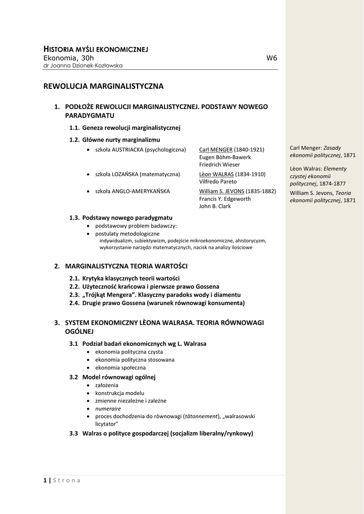 HISTORIA MYŚLI EKONOMICZNEJ Ekonomia, 30h W6 dr Joanna Dzionek-Kozłowska REWOLUCJA MARGINALISTYCZNA 1. PODŁOŻE REWOLUCJI MARGINALISTYCZNEJ. PODSTAWY NOWEGO PARADYGMATU 1.1. Geneza rewolucji marginalistycznej 1.2. Główne nurty marginalizmu Carl MENGER (1840-1921) Eugen Böhm-Bawerk Friedrich Wieser szkoła LOZAŃSKA (matematyczna) Lèon WALRAS (1834-1910) Vilfredo Pareto Lèon Walras: Elementy czystej ekonomii politycznej, 1874-1877 szkoła ANGLO-AMERYKAŃSKA William S. JEVONS (1835-1882) Francis Y. Edgeworth John B. Clark William S. Jevons, Teoria ekonomii politycznej, 1871 1.3. Podstawy nowego paradygmatu podstawowy problem badawczy: postulaty metodologiczne indywidualizm, subiektywizm, podejście mikroekonomiczne, ahistorycyzm, wykorzystanie narzędzi matematycznych, nacisk na analizy ilościowe 2. MARGINALISTYCZNA TEORIA WARTOŚCI 2.1. 2.2. 2.3. 2.4. Krytyka klasycznych teorii wartości Użyteczność krańcowa i pierwsze prawo Gossena „Trójkąt Mengera”. Klasyczny paradoks wody i diamentu Drugie prawo Gossena (warunek równowagi konsumenta) 3. SYSTEM EKONOMICZNY LÈONA WALRASA. TEORIA RÓWNOWAGI OGÓLNEJ 3.1 Podział badań ekonomicznych wg L. Walrasa ekonomia polityczna czysta ekonomia polityczna stosowana ekonomia społeczna 3.2 Model równowagi ogólnej założenia konstrukcja modelu zmienne niezależne i zależne numeraire proces dochodzenia do równowagi (tâtonnement), „walrasowski licytator” 3.3 Walras o polityce gospodarczej (socjalizm liberalny/rynkowy) 1|Strona Carl Menger: Zasady ekonomii politycznej, 1871 szkoła AUSTRIACKA (psychologiczna) 4. WYBRANE KONCEPCJE EKONOMICZNE VILFREDO PARETO 4.1 Teoria wyboru konsumenta jako alternatywa wobec teorii wartości opartej na pojęciu użyteczności krańcowej 4.2 Optimum w sensie Pareta 5. AUSTRIACKA TEORIA PROCENTU 5.1 Klasyfikacja czynników produkcji 5.2 Przyczyny istnienia procentu (dlaczego stopa procentowa jest dodatnia?) Eugen Böhm-Bawerk: Kapitał i zysk z kapitału, 1884; Pozytywna teoria kapitału, 1888; czynniki psychologiczne czynnik technologiczny 5.3 Stopa procentowa a okrężne metody produkcji 6. TEORIA PODZIAŁU OPARTA NA POJĘCIU PRODUKCYJNOŚCI KRAŃCOWEJ 6.1 Prawo malejącej produkcyjności krańcowej. Funkcja produkcji 6.2 Podział dochodu narodowego (wyznaczanie wynagrodzeń poszczególnych czynników produkcji) 2|Strona John Bates Clark: Podział bogactwa, 1899