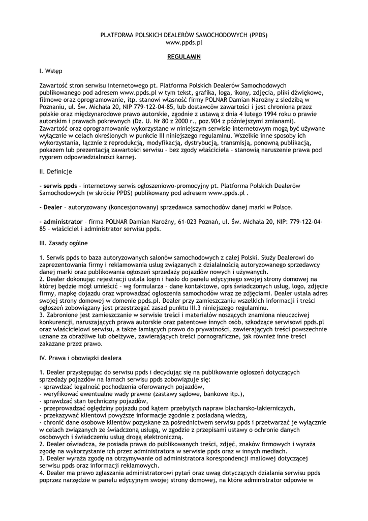 PLATFORMA POLSKICH DEALERÓW SAMOCHODOWYCH (PPDS) www.ppds.pl REGULAMIN I. Wstęp Zawartość stron serwisu internetowego pt. Platforma Polskich Dealerów Samochodowych publikowanego pod adresem www.ppds.pl w tym tekst, grafika, loga, ikony, zdjęcia, pliki dźwiękowe, filmowe oraz oprogramowanie, itp. stanowi własność firmy POLNAR Damian Narożny z siedzibą w Poznaniu, ul. Św. Michała 20, NIP 779-122-04-85, lub dostawców zawartości i jest chroniona przez polskie oraz międzynarodowe prawo autorskie, zgodnie z ustawą z dnia 4 lutego 1994 roku o prawie autorskim i prawach pokrewnych (Dz. U. Nr 80 z 2000 r., poz.904 z późniejszymi zmianami). Zawartość oraz oprogramowanie wykorzystane w niniejszym serwisie internetowym mogą być używane wyłącznie w celach określonych w punkcie III niniejszego regulaminu. Wszelkie inne sposoby ich wykorzystania, łącznie z reprodukcją, modyfikacją, dystrybucją, transmisją, ponowną publikacją, pokazem lub prezentacją zawartości serwisu – bez zgody właściciela – stanowią naruszenie prawa pod rygorem odpowiedzialności karnej. II. Definicje - serwis ppds – internetowy serwis ogłoszeniowo-promocyjny pt. Platforma Polskich Dealerów Samochodowych (w skrócie PPDS) publikowany pod adresem www.ppds.pl . - Dealer – autoryzowany (koncesjonowany) sprzedawca samochodów danej marki w Polsce. - administrator – firma POLNAR Damian Narożny, 61-023 Poznań, ul. Św. Michała 20, NIP: 779-122-0485 – właściciel i administrator serwisu ppds. III. Zasady ogólne 1. Serwis ppds to baza autoryzowanych salonów samochodowych z całej Polski. Służy Dealerowi do zaprezentowania firmy i reklamowania usług związanych z działalnością autoryzowanego sprzedawcy danej marki oraz publikowania ogłoszeń sprzedaży pojazdów nowych i używanych. 2. Dealer dokonując rejestracji ustala login i hasło do panelu edycyjnego swojej strony domowej na której będzie mógł umieścić – wg formularza – dane kontaktowe, opis świadczonych usług, logo, zdjęcie firmy, mapkę dojazdu oraz wprowadzać ogłoszenia samochodów wraz ze zdjęciami. Dealer ustala adres swojej strony domowej w domenie ppds.pl. Dealer przy zamieszczaniu wszelkich informacji i treści ogłoszeń zobowiązany jest przestrzegać zasad punktu III.3 niniejszego regulaminu. 3. Zabronione jest zamieszczanie w serwisie treści i materiałów noszących znamiona nieuczciwej konkurencji, naruszających prawa autorskie oraz patentowe innych osób, szkodzące serwisowi ppds.pl oraz właścicielowi serwisu, a także łamiących prawo do prywatności, zawierających treści powszechnie uznane za obraźliwe lub obelżywe, zawierających treści pornograficzne, jak również inne treści zakazane przez prawo. IV. Prawa i obowiązki dealera 1. Dealer przystępując do serwisu ppds i decydując się na publikowanie ogłoszeń dotyczących sprzedaży pojazdów na łamach serwisu ppds zobowiązuje się: - sprawdzać legalność pochodzenia oferowanych pojazdów, - weryfikować ewentualne wady prawne (zastawy sądowe, bankowe itp.), - sprawdzać stan techniczny pojazdów, - przeprowadzać oględziny pojazdu pod kątem przebytych napraw blacharsko-lakierniczych, - przekazywać klientowi powyższe informacje zgodnie z posiadaną wiedzą, - chronić dane osobowe klientów pozyskane za pośrednictwem serwisu ppds i przetwarzać je wyłącznie w celach związanych ze świadczoną usługą, w zgodzie z przepisami ustawy o ochronie danych osobowych i świadczeniu usług drogą elektroniczną. 2. Dealer oświadcza, że posiada prawa do publikowanych treści, zdjęć, znaków firmowych i wyraża zgodę na wykorzystanie ich przez administratora w serwisie ppds oraz w innych mediach. 3. Dealer wyraża zgodę na otrzymywanie od administratora korespondencji mailowej dotyczącej serwisu ppds oraz informacji reklamowych. 4. Dealer ma prawo zgłaszania administratorowi pytań oraz uwag dotyczących działania serwisu ppds poprzez narzędzie w panelu edycyjnym swojej strony domowej, na które administrator odpowie w terminie nie dłuższym niż 5 dni roboczych od daty ich otrzymania. 5. Dealer ma możliwość samodzielnego aktualizowania i edytowania swoich danych osobowych. 6. Dealer ma prawo żądać od administratora całkowitego usunięcia swoich danych z bazy serwisu ppds. V. Prawa i obowiązki administratora 1. Administrator nie odpowiada za treść informacji zamieszczanych przez Dealera na stronie domowej oraz za treść zamieszczanych ogłoszeń. 2. Administrator dokłada wszelkich starań aby serwis funkcjonował bezawaryjnie, jednak nie ponosi odpowiedzialności za przerwy w funkcjonowaniu wynikające z działań podmiotów trzecich, jak np. dostawcy usług internetowych, dzierżawcy łączy itp. 3. Administrator zastrzega sobie prawo do całkowitego lub czasowego wyłączenia serwisu ppds, w celu jego modernizacji lub konserwacji. O czasie wyłączenia administrator powiadomi Dealera z minimum dwudniowym wyprzedzeniem. 4. Dane osobowe Dealera nie będą przetwarzane przez administratora do celów innych niż związane ze świadczoną usługą. Przetwarzanie zbieranych danych będzie się odbywało zgodnie z przepisami ustawy o ochronie danych osobowych i ustawy o świadczeniu usług drogą elektroniczną. 5. Administrator jest zobowiązany do usunięcia danych Dealera na jego żądanie wyrażone drogą elektroniczną lub pocztą tradycyjną. VI. Warunki współpracy 1. Zaakceptowanie niniejszego regulaminu w procesie rejestracji Dealera jest równoznaczne z przyjęciem i akceptacją warunków w nim opisanych i nie wymaga podpisania dodatkowej umowy. 2. Zarejestrowanie Dealera i utrzymywanie wpisu (adres strony w domenie ppds.pl, opis firmy, dane kontaktowe, logo, zdjęcie salonu, mapka) w bazie serwisu ppds jest bezpłatne. 3. Publikowanie przez Dealera nieograniczonej liczby ogłoszeń samochodów ze zdjęciami z podziałem na nowe i używane jest bezpłatne. VII. Ustalenia końcowe 1. Adm