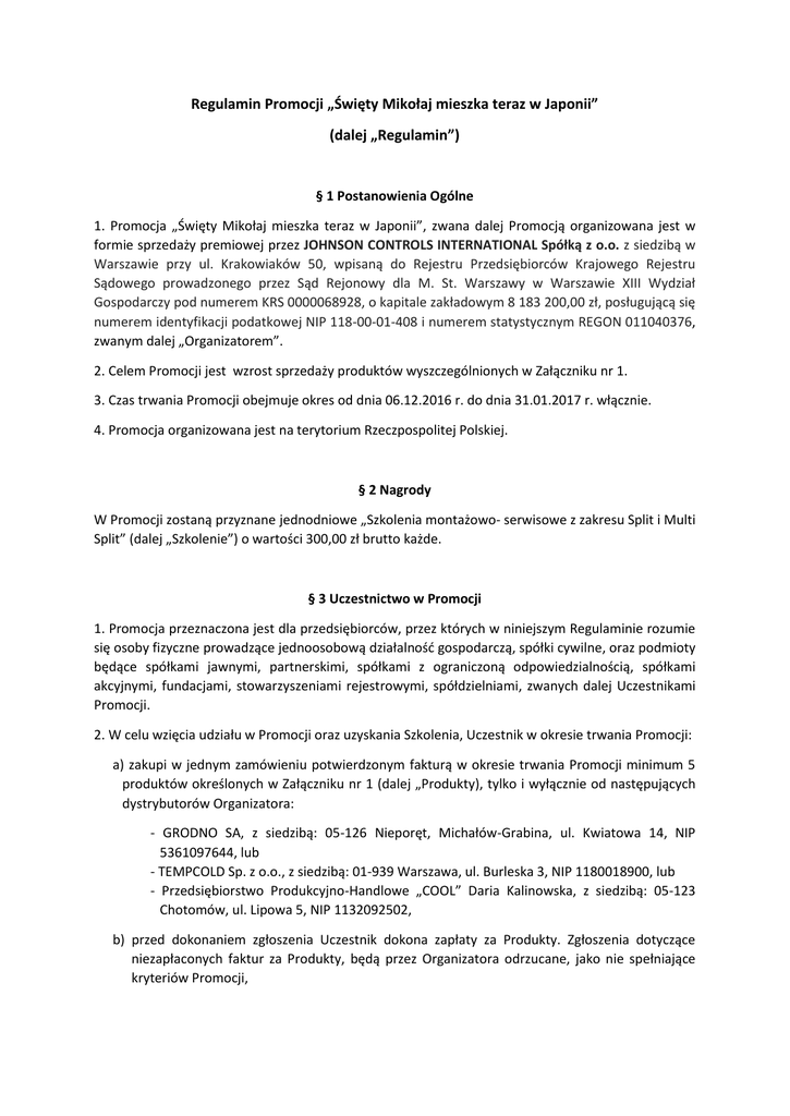 Regulamin Promocji „Święty Mikołaj mieszka teraz w Japonii” (dalej „Regulamin”) § 1 Postanowienia Ogólne 1. Promocja „Święty Mikołaj mieszka teraz w Japonii”, zwana dalej Promocją organizowana jest w formie sprzedaży premiowej przez JOHNSON CONTROLS INTERNATIONAL Spółką z o.o. z siedzibą w Warszawie przy ul. Krakowiaków 50, wpisaną do Rejestru Przedsiębiorców Krajowego Rejestru Sądowego prowadzonego przez Sąd Rejonowy dla M. St. Warszawy w Warszawie XIII Wydział Gospodarczy pod numerem KRS 0000068928, o kapitale zakładowym 8 183 200,00 zł, posługującą się numerem identyfikacji podatkowej NIP 118-00-01-408 i numerem statystycznym REGON 011040376, zwanym dalej „Organizatorem”. 2. Celem Promocji jest wzrost sprzedaży produktów wyszczególnionych w Załączniku nr 1. 3. Czas trwania Promocji obejmuje okres od dnia 06.12.2016 r. do dnia 31.01.2017 r. włącznie. 4. Promocja organizowana jest na terytorium Rzeczpospolitej Polskiej. § 2 Nagrody W Promocji zostaną przyznane jednodniowe „Szkolenia montażowo- serwisowe z zakresu Split i Multi Split” (dalej „Szkolenie”) o wartości 300,00 zł brutto każde. § 3 Uczestnictwo w Promocji 1. Promocja przeznaczona jest dla przedsiębiorców, przez których w niniejszym Regulaminie rozumie się osoby fizyczne prowadzące jednoosobową działalność gospodarczą, spółki cywilne, oraz podmioty będące spółkami jawnymi, partnerskimi, spółkami z ograniczoną odpowiedzialnością, spółkami akcyjnymi, fundacjami, stowarzyszeniami rejestrowymi, spółdzielniami, zwanych dalej Uczestnikami Promocji. 2. W celu wzięcia udziału w Promocji oraz uzyskania Szkolenia, Uczestnik w okresie trwania Promocji: a) zakupi w jednym zamówieniu potwierdzonym fakturą w okresie trwania Promocji minimum 5 produktów określonych w Załączniku nr 1 (dalej „Produkty), tylko i wyłącznie od następujących dystrybutorów Organizatora: - GRODNO SA, z siedzibą: 05-126 Nieporęt, Michałów-Grabina, ul. Kwiatowa 14, NIP 5361097644, lub - TEMPCOLD Sp. z o.o., z siedzibą: 01-939 Warszawa, ul. Burleska 3, NIP 1180018900, lub - Przedsiębiorstwo Produkcyjno-Handlowe „COOL” Daria Kalinowska, z siedzibą: 05-123 Chotomów, ul. Lipowa 5, NIP 1132092502, b) przed dokonaniem zgłoszenia Uczestnik dokona zapłaty za Produkty. Zgłoszenia dotyczące niezapłaconych faktur za Produkty, będą przez Organizatora odrzucane, jako nie spełniające kryteriów Promocji, c) w okresie określonym w § 1 ust. 3 wysłać do Organizatora drogą elektroniczną na adres e-mail: [email protected] zgłoszenie zakupu Produktów o których i w ilościach nie niższych o jakich mowa w lit. a), z podaniem następujących informacji: dane osobowe pracownika Uczestnika delegowanego przez Uczestnika na Szkolenie, dane kontaktowe (numer telefonu, adres e-mail) wraz z podaniem numeru i daty wystawienia faktury potwierdzającej zakup Produktów, listy zakupionych Produktów, ceny netto oraz danych dystrybutora Organizatora u którego dokonał zakupu Produktów, d) Organizator w terminie 7 dni od otrzymania zgłoszenia Uczestnika potwierdzi w przypadku zgłoszenia spełniającego kryteria Promocji wraz z podaniem informacji o terminie w jakim będzie przeprowadzone Szkolenie, albo odrzuci zgłoszenie jako niespełniające kryteriów Promocji. 3. W przypadku dokonania przez Uczestnika zwrotu zakupionych Produktów – niezależnie od powodu, Uczestnikowi nie przysługuje prawo do wzięcia udziału w Promocji, a dokonane zgłoszenia zostaną przez Organizatora odrzucone. W przypadku gdy Uczestnik dokonał zwrotu Produktów już po wzięciu udziału w Szkoleniu, Uczestnik zobowiązany jest do zapłaty kwoty określonej w § 2 za udział osoby delegowanej w Szkoleniu na podstawie otrzymanego wezwania. 4. Z udziału w Promocji wyłączeni są pracownicy Organizatora. 5. Udział w Promocji i podanie związanych z udziałem danych jest dobrowolne. 6. Uczestnik może dokonać wielu zgłoszeń, każde na podstawie odrębnej faktury zgodnie z kryteriami określonymi w niniejszym paragrafie. § 4 Reklamacje 1. Wszelkie reklamacje dotyczące sposobu przeprowadzenia Promocji Uczestnicy winni zgłaszać Organizatorowi drogą elektroniczną na adres e-mail: [email protected] 2. Reklamacja powinna zawierać: imię i nazwisko Uczestnika Promocji, dokładny adres Uczestnika, dokładny opis i uzasadnienie reklamacji. 3. Reklamacje rozpatrywane będą przez Organizatora w terminie do 14 dni od daty ich otrzymania. W uzasadnionych przypadkach dopuszcza się możliwość przedłużenia przez Organizatora terminu rozpatrzenia reklamacji pod warunkiem poinformowania składającego reklamację o prowadzonym postępowaniu wyjaśniającym i o przewidywanym terminie ostatecznej odpowiedzi. 4. O wyniku postępowania reklamacyjnego Uczestnik Promocji zostanie powiadomiony drogą elektroniczną na adres e-mail z którego Uczestnik wysłał reklamację. 5. Decyzja Organizatora w przedmiocie rozpatrywanej reklamacji nie wyłącza ani nie ogranicza uprawnień Uczestnika Promocji do dochodzenia swoich roszczeń przed sądem powszechnym. § 5 Postanowienia końcowe 1. Johnson Controls Sp. z o.o. jest administratorem danych osobowych Uczestników Promocji w rozumieniu przepisów ustawy z dnia 29 sierpnia 1997 r. o ochronie danych osobowych z dnia 29 sierpnia 1997 r. (Dz.U. 2016 r. poz. 922) i przetwarza je w zakresie i celu przeprowadzenia niniejszej Promocji. 2. Uczestnikowi Promocji, przysługuje prawo dostępu do dotyczących go danych osobowych oraz ich poprawiania, a także prawo żądania usunięcia danych osobowych przetwarzanych przez Organizatora w związku z niniejszą Promocją. Żądanie Uczestnika do usunięcia jego danych osobowych do chwili przeprowadzenia Szkolenia jest tożsame z rezygnacją Uczestnika w Promocji. 3. Treść niniejszego Regulaminu jest dostępna w siedzibie Organizatora oraz na stronie internetowej www.klimatyzacjahitachi.pl 4. Niniejszy Regulamin