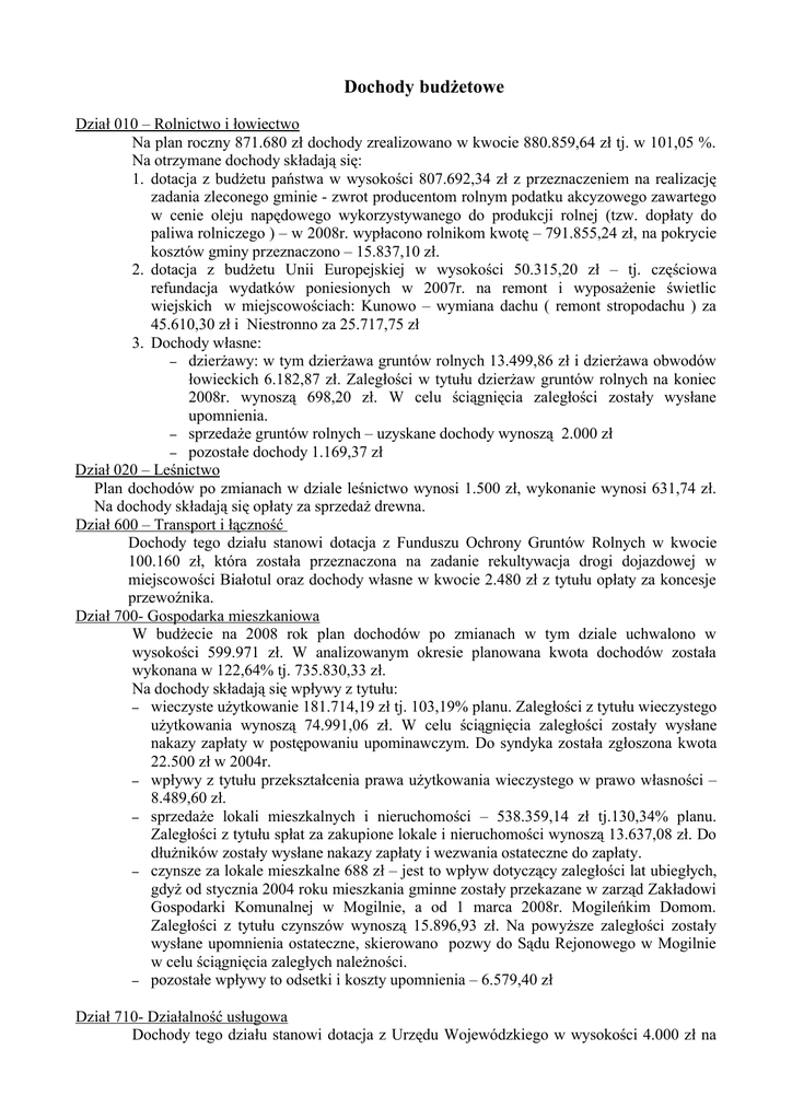 Dochody budżetowe Dział 010 – Rolnictwo i łowiectwo Na plan roczny 871.680 zł dochody zrealizowano w kwocie 880.859,64 zł tj. w 101,05 %. Na otrzymane dochody składają się: 1. dotacja z budżetu państwa w wysokości 807.692,34 zł z przeznaczeniem na realizację zadania zleconego gminie - zwrot producentom rolnym podatku akcyzowego zawartego w cenie oleju napędowego wykorzystywanego do produkcji rolnej (tzw. dopłaty do paliwa rolniczego ) – w 2008r. wypłacono rolnikom kwotę – 791.855,24 zł, na pokrycie kosztów gminy przeznaczono – 15.837,10 zł. 2. dotacja z budżetu Unii Europejskiej w wysokości 50.315,20 zł – tj. częściowa refundacja wydatków poniesionych w 2007r. na remont i wyposażenie świetlic wiejskich w miejscowościach: Kunowo – wymiana dachu ( remont stropodachu ) za 45.610,30 zł i Niestronno za 25.717,75 zł 3. Dochody własne: – dzierżawy: w tym dzierżawa gruntów rolnych 13.499,86 zł i dzierżawa obwodów łowieckich 6.182,87 zł. Zaległości w tytułu dzierżaw gruntów rolnych na koniec 2008r. wynoszą 698,20 zł. W celu ściągnięcia zaległości zostały wysłane upomnienia. – sprzedaże gruntów rolnych – uzyskane dochody wynoszą 2.000 zł – pozostałe dochody 1.169,37 zł Dział 020 – Leśnictwo Plan dochodów po zmianach w dziale leśnictwo wynosi 1.500 zł, wykonanie wynosi 631,74 zł. Na dochody składają się opłaty za sprzedaż drewna. Dział 600 – Transport i łączność Dochody tego działu stanowi dotacja z Funduszu Ochrony Gruntów Rolnych w kwocie 100.160 zł, która została przeznaczona na zadanie rekultywacja drogi dojazdowej w miejscowości Białotul oraz dochody własne w kwocie 2.480 zł z tytułu opłaty za koncesje przewoźnika. Dział 700- Gospodarka mieszkaniowa W budżecie na 2008 rok plan dochodów po zmianach w tym dziale uchwalono w wysokości 599.971 zł. W analizowanym okresie planowana kwota dochodów została wykonana w 122,64% tj. 735.830,33 zł. Na dochody składają się wpływy z tytułu: – wieczyste użytkowanie 181.714,19 zł tj. 103,19% planu. Zaległości z tytułu wieczystego użytkowania wynoszą 74.991,06 zł. W celu ściągnięcia zaległości zostały wysłane nakazy zapłaty w postępowaniu upominawczym. Do syndyka została zgłoszona kwota 22.500 zł w 2004r. – wpływy z tytułu przekształcenia prawa użytkowania wieczystego w prawo własności – 8.489,60 zł. – sprzedaże lokali mieszkalnych i nieruchomości – 538.359,14 zł tj.130,34% planu. Zaległości z tytułu spłat za zakupione lokale i nieruchomości wynoszą 13.637,08 zł. Do dłużników zostały wysłane nakazy zapłaty i wezwania ostateczne do zapłaty. – czynsze za lokale mieszkalne 688 zł – jest to wpływ dotyczący zaległości lat ubiegłych, gdyż od stycznia 2004 roku mieszkania gminne zostały przekazane w zarząd Zakładowi Gospodarki Komunalnej w Mogilnie, a od 1 marca 2008r. Mogileńkim Domom. Zaległości z tytułu czynszów wynoszą 15.896,93 zł. Na powyższe zaległości zostały wysłane upomnienia ostateczne, skierowano pozwy do Sądu Rejonowego w Mogilnie w celu ściągnięcia zaległych należności. – pozostałe wpływy to odsetki i koszty upomnienia – 6.579,40 zł Dział 710- Działalność usługowa Dochody tego działu stanowi dotacja z Urzędu Wojewódzkiego w wysokości 4.000 zł na zadania bieżące realizowane przez gminę na podstawie porozumień z organami administracji rządowej związane z utrzymaniem, remontami, konserwacją kwater i cmentarzy wojennych. Dotacja została przeznaczona na dofinansowanie remontu pomnika Powstańców Wielkopolskich – wykonanie i montaż poręczy metalowej. Dział 750 – Administracja publiczna Dochody administracji publicznej zaplanowano w wysokości 353.915 zł, a zrealizowane zostały w 104,18 % tj. w wysokości 368.725,84 zł. Na dochody tego działu składają się: – dotacja z Urzędu Wojewódzkiego na realizację zadań zleconych w wysokości 249,400 zł – dochody własne: • wpływ za mandaty 37.963,85 zł • różne opłaty – 1.833,84 zł (złomowanie samochodu Polonez Truck, opłaty za kwit mazalny, zwrot za koszt założenia hipoteki, koszty upomnienia ) • wpływ za wynajem lokali użytkowych – 68.695,23 zł • różne dochody - 3.708,22 zł (w tym wpływ refundacji z Urzędu Pracy za 2007r., zwrot kosztów postępowania sądowego ) Dział 751- Urzędy naczelnych organów władzy państwowej Na plan roczny 3.514 zł dochody tego działu zrealizowano w 100%. Jest to to dotacja z Krajowego Biura Wyborczego Delegatura w Bydgoszczy na: • prowadzenie stałego rejestru wyborców – 3.354 zł • na niszczenie dokumentów z wyborów parlamentarnych – 160 zł. Dział 754 – Bezpieczeństwo publiczne i ochrona przeciwpożarowa Dochody tego działu w kwocie 9.801 zł pochodzą z nastepujacych źródeł: – zwrot z Wojewódzkiego Urzędu Pracy za wypłacone wynagrodzenie za odbywaną służbę zastepczą za 2007r. 1.280 zł – odszkodowanie za uszkodzoną kamerę monitorigu miejskiego 8.521 zł. Dział 756- Dochody od osób prawnych, od osób fizycznych i od innych jednostek nieposiadających osobowości prawnej oraz wydatki związane z ich poborem Wykonane dochody tego działu w kwocie 27.298.768 zł stanowią 47,93% realizacji całego budżetu dochodów za 2008r. Uchwalone w budżecie dochody w dziale 756 w kwocie 24.488.792 zł, w trakcie realizacji zostały zwiększone do kwoty 25.961.549 zł, a zrealizowane zostały w wysokości 27.298.768 zł tj. w 105,15%. Największy udział w dochodach z podatków i opłat zajmuje podatek od nieruchomości – 11.731.253,56 zł tj. 20,60% całego budżetu dochodów. Najmniejszy z dochodów w grupie podatków gmina osiągnęła z podatku leśnego – 23.882,10 zł i opłaty od posiadania psów – 23.048,35zł. Udziały we wpływach w podatku dochodowym od osób fizycznych zostały zrealizowane w kwocie 9.188.131 zł tj.110,91% planu ( co stanowi 16,13% całego budż