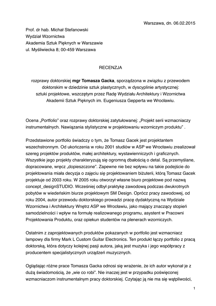 Warszawa, dn. 06.02.2015 Prof. dr hab. Michał Stefanowski Wydział Wzornictwa Akademia Sztuk Pięknych w Warszawie ul. Myśliwiecka 8; 00-459 Warszawa RECENZJA rozprawy doktorskiej mgr Tomasza Gacka, sporządzona w związku z przewodem doktorskim w dziedzinie sztuk plastycznych, w dyscyplinie artystycznej: sztuki projektowe, wszczętym przez Radę Wydziału Architektury i Wzornictwa Akademii Sztuk Pięknych im. Eugeniusza Gepperta we Wrocławiu. Ocena „Portfolio” oraz rozprawy doktorskiej zatytułowanej: „Projekt serii wzmacniaczy instrumentalnych. Nawiązania stylistyczne w projektowaniu wzorniczym produktu” . Przedstawione portfolio świadczy o tym, że Tomasz Gacek jest projektantem wszechstronnym. Od ukończenia w roku 2001 studiów w ASP we Wrocławiu zrealizował szereg projektów produktów, małej architektury, wystawienniczych i graficznych. Wszystkie jego projekty charakteryzują się ogromną dbałością o detal. Są przemyślane, dopracowane, wręcz „dopieszczone”. Zapewne nie bez wpływu na takie podejście do projektowania miała decyzja o zajęciu się projektowaniem biżuterii, którą Tomasz Gacek projektuje od 2003 roku. W 2005 roku otworzył własne biuro projektowe pod nazwą concept_designSTUDIO. Wcześniej odbył praktykę zawodową podczas dwukrotnych pobytów w wiedeńskim biurze projektowym SM Design. Oprócz pracy zawodowej, od roku 2004, autor przewodu doktorskiego prowadzi pracę dydaktyczną na Wydziale Wzornictwa i Architektury Wnętrz ASP we Wrocławiu, jako mający znaczący stopień samodzielności i wpływ na formułę realizowanego programu, asystent w Pracowni Projektowania Produktu, oraz opiekun studentów na plenerach wzorniczych. Ostatnim z zaprojektowanych produktów pokazanych w portfolio jest wzmacniacz lampowy dla firmy Mark L Custom Guitar Electronics. Ten produkt łączy portfolio z pracą doktorską, która dotyczy kolejnej pasji autora, jaką jest muzyka i jego współpracy z producentem specjalistycznych urządzeń muzycznych. Oglądając różne prace Tomasza Gacka odnosi się wrażenie, że ich autor wykonał je z dużą świadomością, że „wie co robi”. Nie inaczej jest w przypadku poświęconej wzmacniaczom instrumentalnym pracy doktorskiej. Czytając ją nie ma się wątpliwości, 1 że autor wie o czym pisze. Odnosi się też wrażenie, że mimo opisywanych perturbacji, autor lubi to co robi, że jest to jego pasją. Jako gitarzysta i współzałożyciel działającego w latach 2000-2005 kłodzkiej formacji multimedialnej kunstbande SLA poznał w praktyce zagadnienie, które później stało się przedmiotem jego pracy projektowej. W przewodzie doktorskim w przystępny i ciekawy sposób opisana została historia wzmacniaczy instrumentalnych i uwarunkowania mające wpływ na ich wygląd i funkcjonowanie. Czytałem tę część pracy z zaciekawieniem i dużo się z niej dowiedziałem. Jako projektant, a jednocześnie praktykujący muzyk, Tomasz Gacek, zna środowisko użytkowników opisywanych urządzeń i w przekonujący sposób uzasadnia dlaczego nie mogą one wychodzić poza zaakceptowane konwencje. Urządzenia te skierowane są do hermetycznego, specyficznego środowiska muzyków. Do świata, w którym jakość, tradycja, „dusza” przedmiotów są ważniejsze niż nowoczesność, innowacyjność, tworzenie rozwiązań rewolucyjnych. Zwłaszcza, jeśli, tak jak było w tym przypadku, projekt miał zaistnieć na prawdziwym rynku, a nie pozostać w fazie koncepcyjnych marzeń projektanta. Tomasz Gacek opisuje w pracy swoje pierwsze podejście do projektu serii wzmacniaczy. W ciekawy sposób opisuje trzy obrane drogi oraz inspiracje nurtami steampunk i dieselpunk. Choć otaczająca nas rzeczywistość nie zawsze pozwala na stuprocentowy życiowy optymizm, to osobiście nie podzielam aż tak głębokiego pesymizmu autora dotyczącego nadchodzącej przyszłości, którym między innymi uzasadnia swoje decyzje projektowe, zwrot ku nostalgii i reinterpretacji dawnych wzorów. Uważam, że są sytuacje, w których inspirowanie się przeszłością jest uzasadnione i może przynieść znakomite efekty, ale mimo niepewności kierunku, w jakim zmierza współczesny świat, uprawnione jest również podejście nowatorskie, przełamujące istniejące schematy. Autor podjął decyzję o podjęciu dialogu z tradycją, przekonująco ją uzasadniając. Rozumiem tę decyzję i ją akceptuję. Porównując jego pierwsze projekty koncepcyjne, do produktów, które ostatecznie znalazły się na rynku początkowo poczułem niedosyt, żal, że atrakcyjne pomysły zostały okrojone i zredukowane. Jednak szczegółowy opis współpracy z producentem urządzeń muzycznych, kolejnych etapów przekonywania, dostosowywania projektu do dostępnych technologii i wpisywania się w panujące na docelowym rynku trendy, w przekonujący sposób wyjaśnia podjęte decyzje projektowe. Część opisująca kolejne fazy przełamywania nieufności producenta jest, moim zdaniem jednym z ważniejszych elementów omawianego przewodu doktorskiego. Praca projektantów funkcjonujących na prawdziwym rynku związana jest z kompromisami. Ważna jest świadomość granicy kompromisu, której nie powinno się przekroczyć. Tomasz Gacek tej granicy nie przekracza. Udaje mu się zachować sens pierwotnej idei i przekonać do swojej wizji producenta. Jest powszechnie znaną prawdą, że bardzo trudno jest przekonać producenta do współpracy z projektantem, ale conajmniej równie trudne jest przekonanie producenta do kontynuacji współpracy. Jeśli to się udaje, to można mówić o rzeczywistym sukcesie projektanta. A tak się wydarzyło w przypadku 2 współpracy Tomasza Gacka z firmą Mark L Custom Guitar Electronics. Firma nie tylko wyprodukowała projektowane urządzenie, ale podjęła decyzję o wdrożeniu we współpracy z projektantem kolejnych, a także o przeprojektowaniu wszystkich dotychczas wytwarzanych urządzeń. Autorowi można tylko pogratulować