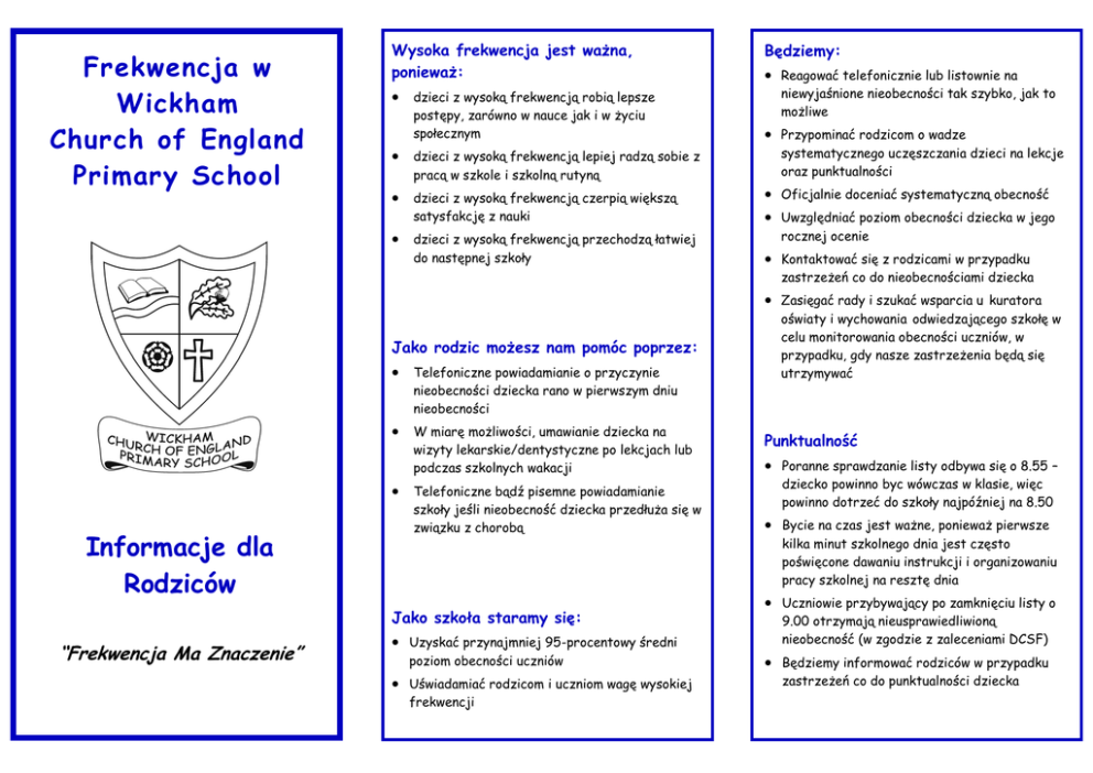 Frekwencja w Wickham Church of England Primary School Wysoka frekwencja jest ważna, ponieważ: dzieci z wysoką frekwencją robią lepsze postępy, zarówno w nauce jak i w życiu społecznym dzieci z wysoką frekwencją lepiej radzą sobie z pracą w szkole i szkolną rutyną dzieci z wysoką frekwencją czerpią większą satysfakcję z nauki dzieci z wysoką frekwencją przechodzą łatwiej do następnej szkoły Będziemy: Reagować telefonicznie lub listownie na niewyjaśnione nieobecności tak szybko, jak to możliwe Przypominać rodzicom o wadze systematycznego uczęszczania dzieci na lekcje oraz punktualności Oficjalnie doceniać systematyczną obecność Uwzględniać poziom obecności dziecka w jego rocznej ocenie Kontaktować się z rodzicami w przypadku zastrzeżeń co do nieobecnościami dziecka Zasięgać rady i szukać wsparcia u kuratora Jako rodzic możesz nam pomóc poprzez: Telefoniczne powiadamianie o przyczynie nieobecności dziecka rano w pierwszym dniu nieobecności W miarę możliwości, umawianie dziecka na wizyty lekarskie/dentystyczne po lekcjach lub podczas szkolnych wakacji Telefoniczne bądź pisemne powiadamianie Informacje dla Rodziców szkoły jeśli nieobecność dziecka przedłuża się w związku z chorobą Jako szkoła staramy się: “Frekwencja Ma Znaczenie” Uzyskać przynajmniej 95-procentowy średni poziom obecności uczniów Uświadamiać rodzicom i uczniom wagę wysokiej frekwencji oświaty i wychowania odwiedzającego szkołę w celu monitorowania obecności uczniów, w przypadku, gdy nasze zastrzeżenia będą się utrzymywać Punktualność Poranne sprawdzanie listy odbywa się o 8.55 – dziecko powinno byc wówczas w klasie, więc powinno dotrzeć do szkoły najpóźniej na 8.50 Bycie na czas jest ważne, ponieważ pierwsze kilka minut szkolnego dnia jest często poświęcone dawaniu instrukcji i organizowaniu pracy szkolnej na resztę dnia Uczniowie przybywający po zamknięciu listy o 9.00 otrzymają nieusprawiedliwioną nieobecność (w zgodzie z zaleceniami DCSF) Będziemy informować rodziców w przypadku zastrzeżeń co do punktualności dziecka Usprawiedliwione nieobecności Wpływ frekwencji Informacja prawna Nieobecności, których nie da się uniknąć, lub na które wyrażona została zgoda dyrekcji, to 'nieobecności usprawiedliwione' i są oznaczone jako takie. Mogą one mieć miejsce w przypadku choroby dziecka lub, w rzadkich przypadkach, kiedy wystąpi problem sprawiający, że nieobecność dziecka jest konieczna. Prosimy o powiadamianie nas o takich sytuacjach a podejdziemy do nich ze zrozumieniem. Dbamy o jak najwyższą frekwencję uczniów. Obowiązkiem rodziców jest dopilnowanie, aby dziecko regularnie uczęszczało do szkoły, do której jest zapisane (Section 7, Education Act 1996). Jeśli dziecko opuszcza szkołę a nieobecności są nieusprawiedliwione, rodzic popełnia wykroczenie i może podlegać karze grzywny lub być ścigany sądownie. Nieobecności nieusprawiedliwione Każda nieobecność, która nie jest konieczna albo nie uzyskała aprobaty dyrekcji, będzie odznaczona jako 'nieobecność nieusprawiedliwiona'. Chociaż 90-procentowa frekwencja może się wydawać wysoka, jest ona równoważna z cotygodniową nieobecnością dziecka przez pół dnia. W czasie całego roku szkolnego równa się to 4 tygodniom nieobecności. Kontynuując 90-procentową frekwencję, w ciągu pięciu lat uczeń/uczennica opuszcza równoważność pół roku nauki. Wsparcie rodziców jest bardzo ważne dla utrzymania wysokich standardów. “Każda lekcja się liczy” “Każdy dzień się liczy…” Przykłady 'nieobecności nieusprawiedliwionych': Rodzinne wyjście Odsypianie zarwanej nocy Urodziny dziecka Wyjście na zakupy lub do fryzjera Oczekiwanie na dostawę przesyłki Wakacje w czasie semestru, na które nie została wyrażona zgoda dyrekcji Jakakolwiek nieobecność, która nie została wyjaśniona, lub gdy wyjaśnienie nie jest uznane za wystarczające przez dyrekcję Wszystkie nieobecności są monitorowane przez kuratora i w przypadku nadmiaru nieobecności nieusprawiedliwionych mogą zostać podjęte kroki prawne. “każda lekcja szkolna jest ważna, a dzieci, które często opuszczają szkołę, często mają problem z nadrabianiem zaległości I robieniem postępów w szkole” DCSF 2006 Swanmore Pyramid of Schools Summer 2010