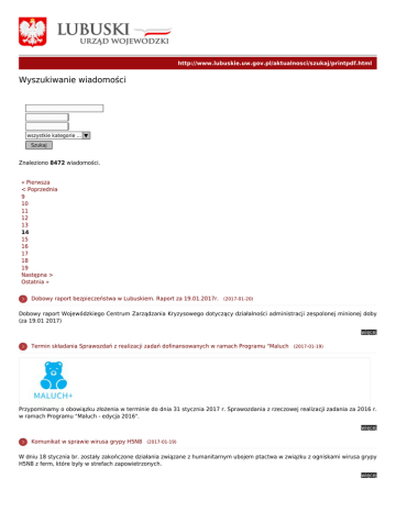 http://www.lubuskie.uw.gov.pl/aktualnosci/szukaj/printpdf.html Wyszukiwanie wiadomości wszystkie kategorie ... ▼ Szukaj Znaleziono 8472 wiadomości. « Pierwsza < Poprzednia 9 10 11 12 13 14 15 16 17 18 19 Następna > Ostatnia » Dobowy raport bezpieczeństwa w Lubuskiem. Raport za 19.01.2017r. (2017-01-20) Dobowy raport Wojewódzkiego Centrum Zarządzania Kryzysowego dotyczący działalności administracji zespolonej minionej doby (za 19.01 2017) więcej Termin składania Sprawozdań z realizacji zadań dofinansowanych w ramach Programu "Maluch (2017-01-19) Przypominamy o obowiązku złożenia w terminie do dnia 31 stycznia 2017 r. Sprawozdania z rzeczowej realizacji zadania za 2016 r. w ramach Programu "Maluch - edycja 2016". więcej Komunikat w sprawie wirusa grypy H5N8 (2017-01-19) W dniu 18 stycznia br. zostały zakończone działania związane z humanitarnym ubojem ptactwa w związku z ogniskami wirusa grypy H5N8 z ferm, które były w strefach zapowietrzonych. więcej Spotkanie z nowym Dyrektorem Oddziału GDDKiA w Zielonej Górze (2017-01-19) Wojewoda Lubuski Władysław Dajczak spotkał się z nowym Dyrektorem Oddziału GDDKiA w Zielonej Górze Markiem Langerem. więcej Dobowy raport bezpieczeństwa w Lubuskiem. Raport za 18.01.2017r. (2017-01-19) Dobowy raport Wojewódzkiego Centrum Zarządzania Kryzysowego dotyczący działalności administracji zespolonej minionej doby (za 18.01 2017) więcej Dobowy raport bezpieczeństwa w Lubuskiem. Raport za 17.01.2017r. (2017-01-18) Dobowy raport Wojewódzkiego Centrum Zarządzania Kryzysowego dotyczący działalności administracji zespolonej minionej doby (za 17.01 2017) więcej Wojewoda z wizytą w Tuplicach (2017-01-18) Wojewoda Lubuski Władysław Dajczak odwiedził wczoraj gminę Tuplice. Swoją wizytę rozpoczął od spotkania z Katarzyną Kromp, wójtem gminy. więcej Pomoc pokrzywdzonym przestępstwem (2017-01-17) Ministerstwo Sprawiedliwości rozstrzygnęło konkurs na pomoc osobom pokrzywdzonym ze środków Funduszu Pomocy Pokrzywdzonym oraz Pomocy Postpenitencjarnej w 2017 roku. więcej Nowi obywatele (2017-01-17) W Lubuskim Urzędzie Wojewódzkim w Gorzowie Wlkp. odbyły się nadania i uznania polskiego obywatelstwa. Akty prawne nowym obywatelom wręczył Wicewojewoda Lubuski Robert Paluch. więcej Dobowy raport bezpieczeństwa w Lubuskiem. Raport za 16.01.2017r. (2017-01-17) Dobowy raport Wojewódzkiego Centrum Zarządzania Kryzysowego dotyczący działalności administracji zespolonej minionej doby (za 16.01 2017) więcej « Pierwsza < Poprzednia 9 10 11 12 13 14 15 16 17 18 19 Następna > Ostatnia »