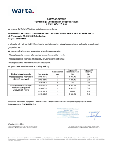 ZAŚWIADCZENIE o przebiegu ubezpieczeń gospodarczych w TUiR WARTA S.A. W imieniu TUiR WARTA S.A. zaświadczam, że firma: WOJEWÓDZKI SZPITAL DLA NERWOWO I PSYCHICZNIE CHORYCH W BOLESŁAWCU ul. Tysiąclecia 30, 59-700 Bolesławiec Regon: 000294190 w okresie od 1 stycznia 2014 r. do dnia dzisiejszego br. ubezpieczona jest w zakresie ubezpieczeń gospodarczych. W tym przedziale czasu posiadała ubezpieczone ryzyka: - Ubezpieczenie sprzętu elektronicznego od wszystkich ryzyk; - Ubezpieczenie mienia od kradzieży z włamaniem i rabunku; - Ubezpieczenie mienia od zdarzeń losowych; W tym czasie zarejestrowane zostały szkody: Wysokość odszkodowania PLN Wysokość rezerwy PLN Rodzaj ubezpieczenia Data szkody Liczba szkód szt. Ubezpieczenie mienia od zdarzeń losowych 2015-05-12 1 8 965,46 0,00 2016-03-07 1 4 899,49 0,00 2016-03-21 1 0,00 0,00 2014-07-21 1 6 213,96 0,00 2014-07-21 1 4 428,00 0,00 2015-02-16 1 922,00 0,00 2016-05-23 1 7 340,64 0,00 Ubezpieczenie sprzętu elektronicznego od wszystkich ryzyk Powyższe informacje są zgodne z dokumentacją ubezpieczeniowo-szkodową znajdującą się w systemie informatycznym TUiR WARTA S.A. Wrocław, 2016-10-24 ……..........................…………………… …………………………………………….. (miejsce i data wystawienia zaświadczenia) ( podpis osoby wystawiającej zaświadczenie ) Towarzystwo Ubezpieczeń i Reasekuracji WARTA S.A., 00-805 Warszawa ul. Chmielna 85/87. Sąd Rejonowy dla m.st. Warszawy XII Wydział Gospodarczy Krajowego Rejestru Sądowego pod nr KRS: 0000016432. Kapitał zakładowy: 187 938 580,00 zł, w tym kapitał wpłacony 187 938 580,00 zł, NIP: 521-04-20-047