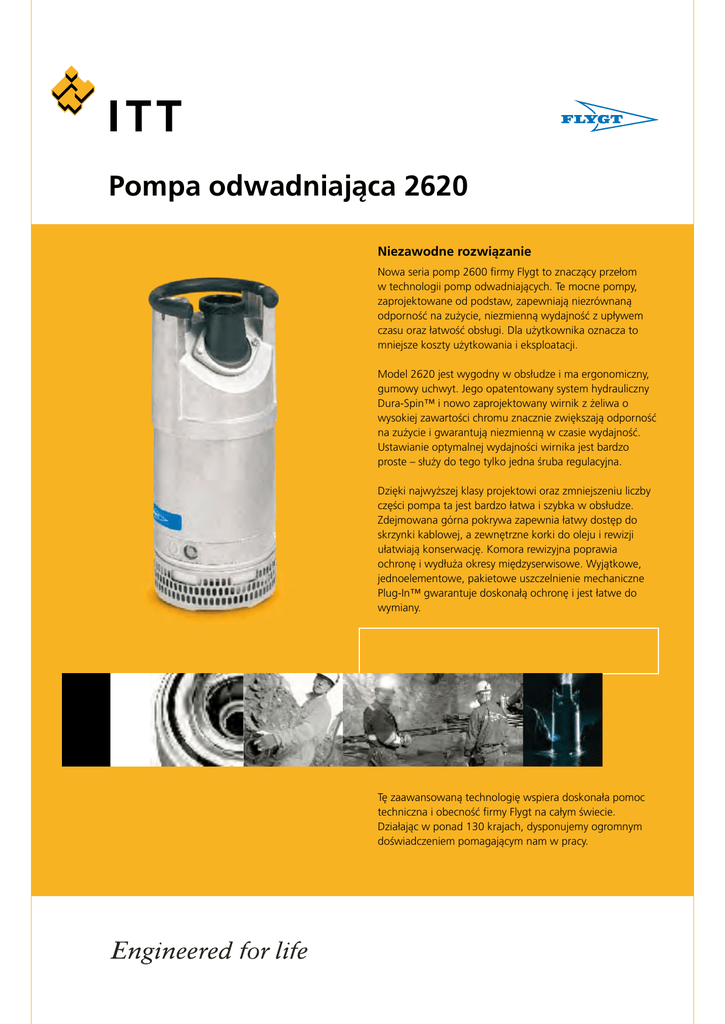 Pompa odwadniająca 2620 Niezawodne rozwiązanie Nowa seria pomp 2600 firmy Flygt to znaczący przełom w technologii pomp odwadniających. Te mocne pompy, zaprojektowane od podstaw, zapewniają niezrównaną odporność na zużycie, niezmienną wydajność z upływem czasu oraz łatwość obsługi. Dla użytkownika oznacza to mniejsze koszty użytkowania i eksploatacji. Model 2620 jest wygodny w obsłudze i ma ergonomiczny, gumowy uchwyt. Jego opatentowany system hydrauliczny Dura-Spin™ i nowo zaprojektowany wirnik z żeliwa o wysokiej zawartości chromu znacznie zwiększają odporność na zużycie i gwarantują niezmienną w czasie wydajność. Ustawianie optymalnej wydajności wirnika jest bardzo proste – służy do tego tylko jedna śruba regulacyjna. Dzięki najwyższej klasy projektowi oraz zmniejszeniu liczby części pompa ta jest bardzo łatwa i szybka w obsłudze. Zdejmowana górna pokrywa zapewnia łatwy dostęp do skrzynki kablowej, a zewnętrzne korki do oleju i rewizji ułatwiają konserwację. Komora rewizyjna poprawia ochronę i wydłuża okresy międzyserwisowe. Wyjątkowe, jednoelementowe, pakietowe uszczelnienie mechaniczne Plug-In™ gwarantuje doskonałą ochronę i jest łatwe do wymiany. Tę zaawansowaną technologię wspiera doskonała pomoc techniczna i obecność firmy Flygt na całym świecie. Działając w ponad 130 krajach, dysponujemy ogromnym doświadczeniem pomagającym nam w pracy. 2620.170 50 Hz Zdejmowana pokrywa – Łatwy dostęp do elementów elektrycznych Jedna śruba regulacyjna – Łatwość ustawiania optymalnej wydajności Specjalnie zaprojektowany wirnik o dużej zawartości chromu – Wysoka efektywność i odporność na zużycie Uszczelnienie pakietowe Plug-In™ – Łatwość serwisu, podwójna ochrona Odrzutnik Spin-Out™ – Ogranicza do minimum zapychanie i zużycie uszczelnienia Dura-Spin™ – Ogranicza do minimum zużycie wirnika Zewnętrzne korki oleju i rewizyjny – Łatwość inspekcji i serwisu Obracane sito ze stali nierdzewnej – Odporność na korozję i uderzenia Dane robocze Temperatura cieczy maks. +40°C Głębokość zanurzenia maks. 20 m Gęstość cieczy maks. 1100 kg/m³ Wymiary otworu sita 7 mm x 16 mm Opcjonalna wersja odporna na zapychanie – Powiększone otwory przy obróconym sicie Odczyn pH pompowanej cieczy pH 5–8 Silnik elektryczny Klatkowy, jednofazowy lub trójfazowy silnik indukcyjny Częstotliwość 50 Hz Klasa izolacji F (+155°C) Zmienność napięcia – praca ciągła maks. ± 5% – praca przerywana maks. ± 10% Niezrównoważenie napięcia między fazami maks. 2% Liczba uruchomień na godzinę maks. 30 Gumowe amortyzatory – Odporność na uderzenia Kable SUBCAB® NSSHÖU Kabel do pomp głębinowych Gumowy kabel „heavy duty” do pomp głębinowych Wyposażenie monitorujące Temperatura zadziałania styków termicznych +125°C Materiały Obudowa zewnętrzna Stop aluminium Wirnik Żeliwo białe o wysokiej zawartości chromu Części zużywające się Kauczuk nitrylowy, żeliwo wysokochromowe Obudowa stojana Stal nierdzewna Sito Stal nierdzewna Wał Stal nierdzewna Pierścienie uszczelniające Kauczuk nitrylowy Uszczelnienie mechaniczne Wewnętrzne węglik wolframu/ceramika Zewnętrzne węglik wolframu/węglik wolframu Masa Całkowita (bez kabla) wirnik odporny na wycieranie: 30 kg Całkowita (bez kabla) wirnik odporny na zapychanie (opcja): 28 kg www.flygt.pl B 226 MT K 234 MT K 233 MT Wydajność [l/s] MT = Srednia wysokosc słupa wody B= Wirnik odporny na wycieranie K= Wirnik odporny na zapychanie (opcja) Wymiary Wysokość Średnica 617 mm 240 mm Opcje Wersja do cieczy gorących Szybkozłączki Startery Anody cynkowe max. +70°C 6”, 4” Akcesoria Adaptery, złącza do węży i inne akcesoria mechaniczne. Akcesoria elektryczne, takie jak sterownik pompy, panele sterowania i przekaźniki monitorujące. Parametry znamionowe 1~ faza, 3~ fazy Moc znamionowa 1~ 1,5 kW, 3~ 2,2 kW Prędkość obrotowa 1~ 2830 obr./min 3~ 2800 obr./min ~ Napięcie Prąd Prąd znamio- rozruchu nowy V A A 1~ 1~ 1~ 3~ 3~ 3~ 3~ 3~ 3~ 3~ 220 230 240 220 D 230 D 380 Y 400 Y 415 Y 500 Y 550 Y 8,7 8,4 8,3 8,1 8,1 4,7 4,7 4,7 3,7 3,9 31 32 34 44 47 25 27 28 21 24 2620.04.01.Pol.09.06 896451 Trosa Tryckeri AB 56815 (opcjonalnie dostępny wirnik odporny na zapychanie) Oznaczenie Kod produktu 2620.170 Typ instalacji Przenośna Charakterystyka wirnika Średnia wysokość słupa wody Odporny na wycieranie Odporny na zapychanie (opcja) Złącze wylotowe 3” Wysokość podnoszenia [m] Wbudowane kondensatory – Łatwa obsługa Komora rewizyjna – Lepsza ochrona 2620.170 Pompa zatapialna do odwadniania placów budowy, kopalni, usuwania wody z obszarów zalanych i innych podobnych zastosowań, w których pompowane medium może zawierać cząstki ścierne. Parametry