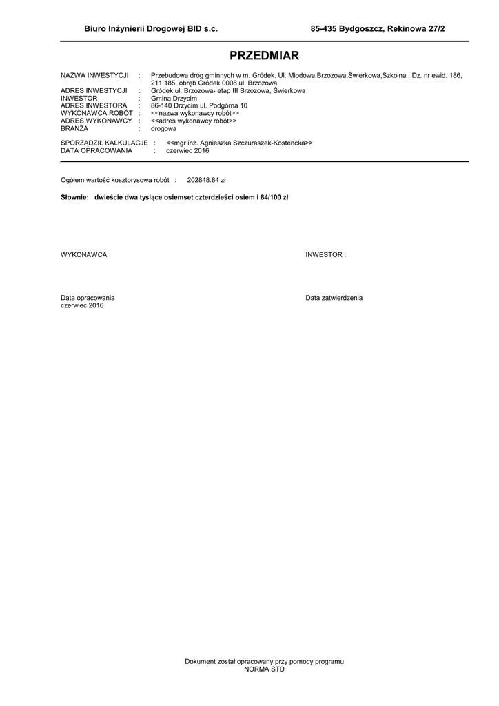 Biuro Inżynierii Drogowej BID s.c. 85-435 Bydgoszcz, Rekinowa 27/2 PRZEDMIAR NAZWA INWESTYCJI : ADRES INWESTYCJI INWESTOR ADRES INWESTORA WYKONAWCA ROBÓT ADRES WYKONAWCY BRANŻA : : : : : : Przebudowa dróg gminnych w m. Gródek. Ul. Miodowa,Brzozowa,Świerkowa,Szkolna . Dz. nr ewid. 186, 211,185, obręb Gródek 0008 ul. Brzozowa Gródek ul. Brzozowa- etap III Brzozowa, Świerkowa Gmina Drzycim 86-140 Drzycim ul. Podgórna 10 <<nazwa wykonawcy robót>> <<adres wykonawcy robót>> drogowa SPORZĄDZIŁ KALKULACJE : DATA OPRACOWANIA : <<mgr inż. Agnieszka Szczuraszek-Kostencka>> czerwiec 2016 Ogółem wartość kosztorysowa robót : 202848.84 zł Słownie: dwieście dwa tysiące osiemset czterdzieści osiem i 84/100 zł WYKONAWCA : INWESTOR : Data opracowania czerwiec 2016 Data zatwierdzenia Dokument został opracowany przy pomocy programu NORMA STD Gródek ul. Brzozowa PRZEDMIAR Lp. Nr spec.techn. Opis i wyliczenia Przebudowa dróg gminnychw m. Gródek -ul. Brzozowa 1 D 01.00.00 ROBOTY PRZYGOTOWAWCZE 1.1 D 01.01.00 ROBOTY POMIAROWE 1.1.1 Odtworzenie trasy i punktów wysokościowych 1 D 01.01.01a Odtworzenie trasy i punktów wysokościowych przy liniowych d.1.1.1 robotach ziemnych (drogi) w terenie równinnym. 0.237 1.2 1.2.1 2 D 01.02.02 d.1.2.1 2' D.01.02.02 d.1.2.1 1.2.2 1.2.2.1 1.2.2.1. 1 3 D 02.01.01 d.1.2.2. 1.1 4 D 02.01.01 d.1.2.2. 1.1 1.2.2.2 1.2.2.2. 1 5 D 02.03.01 d.1.2.2. 2.1 2 2.1 2.1.1 6 D 04.01.01 d.2.1.1 2.3 2.3.1 8 D 04.04.02b d.2.3.1 8' D 04.04.02b d.2.3.1 Poszcz Razem km km D 01.02.00 ROBOTY ROZBIÓRKOWE Usunięcie warstwy humusu Usunięcie warstwy ziemi urodzajnej (humusu) na odl. do 30 m, m3 grubość warstwy do 15 cm 232.10 m3 Nakłady uzupełn.za każde dalsze rozp. 0.5 km transportu po- m3 nad 1 km samochodami samowyładowczymi po drogach utwardzonych ziemi kat.III-IV Krotność = 4.5 poz.2 m3 0.237 RAZEM 0.237 232.100 RAZEM 232.100 232.100 RAZEM 232.100 10.590 RAZEM 10.590 190.020 RAZEM 190.020 10.590 RAZEM 10.590 D 02.00.00 ROBOTY ZIEMNE D 02.01.01 WYKOPY Wykopy wykonywane mechanicznie Wykopy (bez transportu) wykonywane mechanicznie na w gruncie kat. III - grunt z ukopu do wbudowania w nasyp m3 10.59 m3 Wykonanie wykopów mechanicznie w gruncie kat. III-IV z m3 transportem urobku na odkład samochodami na odl. 6 km wraz z uformowaniem i wyrównaniem skarp na odkładzie- wywóz nadmiaru gruntu z wykopów 200.61-10.59 m3 D 02.03.01 NASYPY Nasypy wykonywane mechanicznie Roboty ziemne poprzeczne z wbudowaniem ziemi w nasyp, w m3 gruncie kat. III wraz z zagęszczeniem i zwilżeniem w miarę potrzeby warstw zagęszczanych wodą- grunt z wykopu 10.59 m3 D 04.00.00 PODBUDOWY D 04.01.00 KORYTO Z PROFILOWANIEM I ZAGESZCZENIEM PODŁOZA Koryto, Profilowanie i zageszczenie podłoza Profilowanie i zagęszczenie podłoża pod warstwy konstrukcyj- m2 ne nawierzchni wykonane mechanicznie w gruncie kat. II-IV zjazdy, jezdnia, opaska jezdni 242.30+810.0+220.40 A (obliczenia pomocnicze) m2 poz.A 2.2 2.2.1 7 D 04.02.01 d.2.2.1 j.m. D 04.02.00 WARSTWY ODSĄCZAJĄCE Warstwy odsaczajace z piasku Wykonanie i zagęszczanie mechanicznie warstwy odsączającej z piasku CBR min 25% o wodoprzepuszczalności K> 8m/ dobę , grubość warstwy 6 cm. Konstrukcja pod nawierzcnie jezdnia , opaska jezdni 810.0+220.40 -2- Norma STD Wersja 4.27 Licencja: 9110 dla BID s.c. RAZEM 1272.700 1030.400 RAZEM 1030.400 1272.700 RAZEM 1272.700 m2 m2 D 04.04.00 PODBUDOWA Z MIESZANKI KRUSZYWA NIEZWIĄZANEGO D 04.04.02 Podbudowa z kruszyw kamiennych Podbudowa zasadnicza z mieszanki kruszywa niezwiązanego( m2 stabilizowanego mechanicznie) - kruszywo 0/31,5 mm.Grubośc po zagęszczeniu 15 cm. projektowana grubośc 20 cm - konstrukcja nawierzchni na zjazdach, jezdnia, opaska jezdni 242.30+810.0+220.40 m2 Podbudowa z mieszanki kruszywa niezwiazanego - za każdy dalszy 1 cm grubości po zagęszczeniu Krotność = 5 poz.8 1272.700 ========== 1272.700 1272.700 m2 m2 1272.700 Gródek ul. Brzozowa Lp. PRZEDMIAR Nr spec.techn. 3 3.1 3.1.1 9 D 05.03.23a d.3.1.1 10 D 05.03.23a d.3.1.1 11 D 05.03.23a d.3.1.1 12 D 05.03.23a d.3.1.1 4 4.1 4.1.1 13 D 06.01.01 d.4.1.1 13' D 06.01.01 d.4.1.1 5 6 6.1 14 D 07.02.01 d.6.1 15 D 07.02.01 d.6.1 7 7.1 7.1.1 16 D 08.01.01b d.7.1.1 17 D 08.01.01 b d.7.1.1 18 D 08.01.01 d.7.1.1 8 19 D 01.01.01a d.8 Opis i wyliczenia j.m. D 05.00.00 NAWIERZCHNIE D 05.03.00 NAWIERZCHNIE ULEPSZONE D 05.03.23 Nawierzchnie z kostki brukowej betonowej Nawierzchnia z kostki brukowej betonowej kształt behation- ty- m2 pu DOMINO_EKO fazowana , szara, grub. 8 cm , na podsypce piaskowej, spoiny wypełnione piaskiem- nawierzchnia jezdni 810.0 m2 Rozścielenie- wypełnienie wolnych przestrzeni między kostka- m2 mi betonowymi DOMINO-EKO grysem bazaltowym 2/8 mm grubośc wypełnienia 8 cm . Powierzchnia wypełnienia 10% powierzchni nawierzchni jezdni 810*0.1 m2 Nawierzchnia z kostki brukowej betonowej kształt behation-ty- m2 pu DOMINO fazowana , szara, grub. 8 cm , na podsypce piaskowej, spoiny wypełnione piaskiem- nawierzchnia opaski jezdni 220.40 m2 Nawierzchnia z kostki brukowej grafit , kształt behation typu DOMINO , grub. 8 cm na podsypce cementowo-piaskowej grub 5 cm, spoiny wypełnione zaprawą cem-piaskową - nawierzchnia zjazdów 242.30 m2 m2 Przymocowanie tablic znaków drogowych TYP D mini folia typ szt. 1 2.0 szt. D 08.00.00 ELEMENTY ULIC D 08.01.00 KRAWEŻNIKI Krawężniki betonowe na ławie betonowej Wykonanie ławy betonowej z oporem z betonu C12/15 (B-15) m3 5.694+31.662 m3 Ustawienie -krawężniki betonowe wjazdowe o wymiarach 15x22 cm na podsypce cementowo-piaskowej i uprzednio wykonanej ławie betonowej . 94.90 m m Ustawienie - opornik betonowy 12x25 cm na podsypce cemen- m towo-piaskowej i upzednio wykonanej ławie betonowej z oporem 527.70 m -3- Norma STD Wersja 4.27 Licencja: 9110 dla BID s.c. 810.000 RAZEM 810.000 81.000 RAZEM 81.000 220.400 RAZEM 220.400 242.300 RAZEM 242.300 105.400 RAZEM 105.400 105.400 RAZEM 105.400 2.000 RAZEM 2.000 2.000 RAZEM 2.000 37.356 RAZEM 37.356 94.900 RAZEM 94.900 
