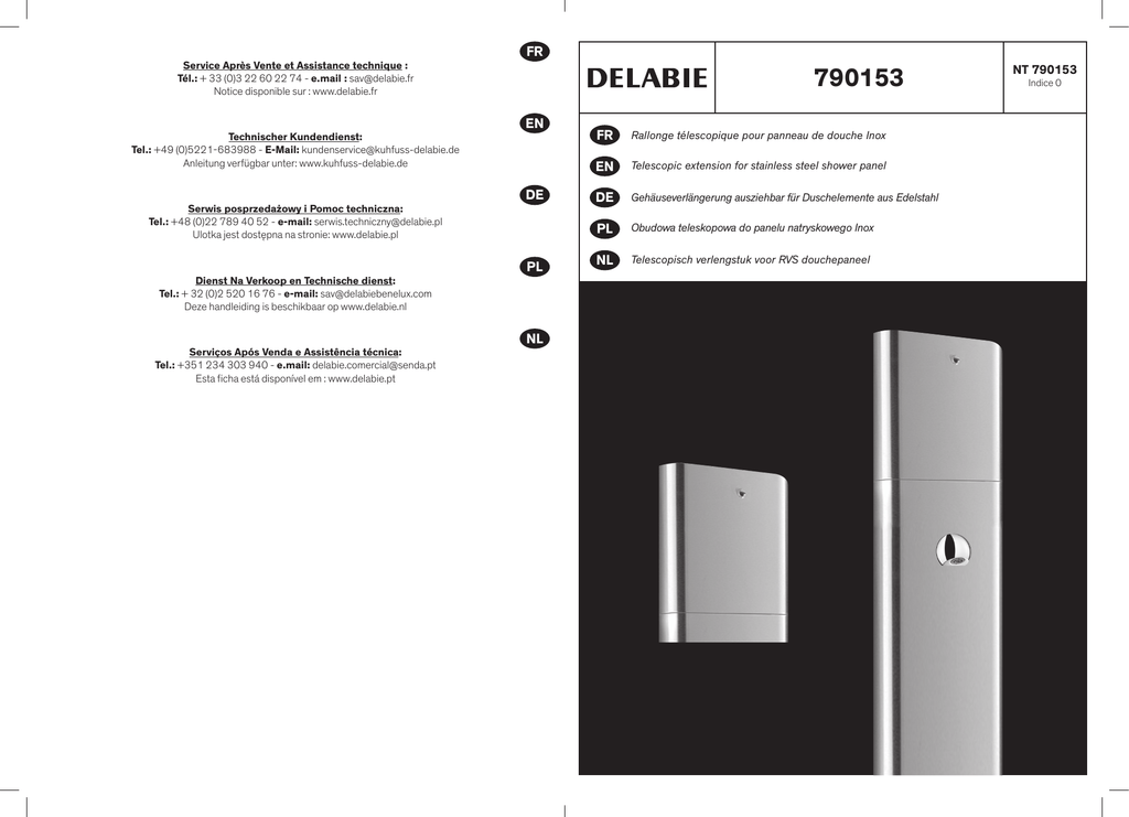 Service Après Vente et Assistance technique : Tél.: + 33 (0)3 22 60 22 74 - e.mail : [email protected] Notice disponible sur : www.delabie.fr Technischer Kundendienst: Tel.: +49 (0)5221-683988 - E-Mail: [email protected] Anleitung verfügbar unter: www.kuhfuss-delabie.de Serwis posprzedażowy i Pomoc techniczna: Tel.: +48 (0)22 789 40 52 - e-mail: [email protected] Ulotka jest dostępna na stronie: www.delabie.pl Dienst Na Verkoop en Technische dienst: Tel.: + 32 (0)2 520 16 76 - e-mail: [email protected] Deze handleiding is beschikbaar op www.delabie.nl Serviços Após Venda e Assistência técnica: Tel.: +351 234 303 940 - e.mail: [email protected] Esta ficha está disponível em : www.delabie.pt FR 790153 EN DE PL NL FR Rallonge télescopique pour panneau de douche Inox EN Telescopic extension for stainless steel shower panel DE Gehäuseverlängerung ausziehbar für Duschelemente aus Edelstahl PL Obudowa teleskopowa do panelu natryskowego Inox NL Telescopisch verlengstuk voor RVS douchepaneel NT 790153 Indice 0 A 44 44 B 44 Ø8 C Ø8 Ø8 D