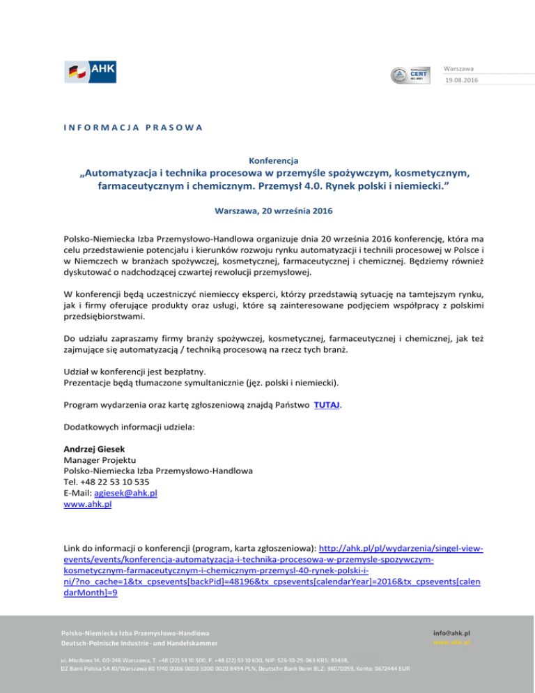 Warszawa 19.08.2016 INFORMACJA PRASOWA Konferencja „Automatyzacja i technika procesowa w przemyśle spożywczym, kosmetycznym, farmaceutycznym i chemicznym. Przemysł 4.0. Rynek polski i niemiecki.” Warszawa, 20 września 2016 Polsko-Niemiecka Izba Przemysłowo-Handlowa organizuje dnia 20 września 2016 konferencję, która ma celu przedstawienie potencjału i kierunków rozwoju rynku automatyzacji i technili procesowej w Polsce i w Niemczech w branżach spożywczej, kosmetycznej, farmaceutycznej i chemicznej. Będziemy również dyskutować o nadchodzącej czwartej rewolucji przemysłowej. W konferencji będą uczestniczyć niemieccy eksperci, którzy przedstawią sytuację na tamtejszym rynku, jak i firmy oferujące produkty oraz usługi, które są zainteresowane podjęciem współpracy z polskimi przedsiębiorstwami. Do udziału zapraszamy firmy branży spożywczej, kosmetycznej, farmaceutycznej i chemicznej, jak też zajmujące się automatyzacją / techniką procesową na rzecz tych branż. Udział w konferencji jest bezpłatny. Prezentacje będą tłumaczone symultanicznie (jęz. polski i niemiecki). Program wydarzenia oraz kartę zgłoszeniową znajdą Państwo TUTAJ. Dodatkowych informacji udziela: Andrzej Giesek Manager Projektu Polsko-Niemiecka Izba Przemysłowo-Handlowa Tel. +48 22 53 10 535 E-Mail: [email protected] www.ahk.pl Link do informacji o konferencji (program, karta zgłoszeniowa): http://ahk.pl/pl/wydarzenia/singel-viewevents/events/konferencja-automatyzacja-i-technika-procesowa-w-przemysle-spozywczymkosmetycznym-farmaceutycznym-i-chemicznym-przemysl-40-rynek-polski-ini/?no_cache=1&tx_cpsevents[backPid]=48196&tx_cpsevents[calendarYear]=2016&tx_cpsevents[calen darMonth]=9 ..