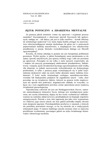 EDUKACJA FILOZOFICZNA Vol. 32 2001 ROZPRAWY I ARTYKUŁY JANUSZ JUSIAK UMCS w Lublinie JĘZYK POTOCZNY A ZDARZENIA MENTALNE Za pomocą jakich terminów winno się opisywać i wyjaśniać procesy mentalne? Zaczerpniętych z obserwacji zjawisk fizycznych lub społecznych, nadając im – tak dalece, jak jest to tylko możliwe – kształt zbliżony do terminologii naukowej? Czy może lepiej byłoby polegać na nazewnictwie odzwierciedlającym intuicje dochodzące do głosu już w potocznych pojmowaniach ludzkiej umysłowości, a znajdujących swe uduchowione przedłużenia w poezji, literacko wymodelowanym dialogu czy filozofii egzystencjalnej? Kwestia, do której odsyłają te pytania nie jest bynajmniej problemem pozornym. Wybór języka, w jakim formułujemy nasze przekonania co do natury zjawisk umysłowych, jest sprawą wielkiej wagi i nikt nie powinien jej ignorować. Przesądza on nie tylko o stylu naszych wypowiedzi, ale i stopniu ich precyzji gwarantującej adekwatność przedmiotową. Subiektywny i niejasny język dwudziestowiecznego egzystencjalizmu miał wielką siłę ekspresji, co jednak zaowocowało wykształceniem się dyskusyjnego przekonania, iż tylko z pomocą pojęć wymykających się w pełni racjonalnemu dyskursowi udać się może trafne ukazanie natury ludzkiej świadomości. Z kolei sucha terminologia cechująca naturalistyczno-behawioralne lub funkcjonalne podejście do zagadnienia umysł – ciało, choć powołuje się na świadectwo faktów, których na gruncie ściśle empirycznym nie sposób dziś podważyć, dogmatycznie zakłada, że wszystko, co łączy się z tym zagadnieniem powinno zostać sprawdzone przez naukową świadomość gnozeologiczną. Najwidoczniej człowiek nie jest ani Heideggerowskim Dasein, samotnie zamieszkującym domostwo bycia, którego jest nostalgicznym pasterzem, ani czystą cielesnością, dającą się bez reszty wytłumaczyć oddziaływaniem na centralny układ nerwowy przekładalnych na bioprądy impulsów energetycznych. Prawda o tym, kim naprawdę jest jako twór wyposażony we właściwy jego istocie umysł, nie leży gdzieś pośrodku między dwoma tymi skrajnymi ujęciami. Prawdopodobnie przebywa w rejonach, o których nie potrafimy powiedzieć niczego, co by się mieściło się w tradycyjnych schematach pojęć. O naturze ludzkiego umysłu możemy mieć co najwyżej przybliżone wyobrażenie, powstające gdzieś na styku świadomego doznawania i obrazowego myślenia. Janusz Jusiak 49 1. Zdroworozsądkowe podstawy komunikacji. Aparatura pojęciowa wyspecjalizowanych tematycznie dyscyplin naukowych nierzadko składa się z terminów zaczerpniętych z języka potocznego. Terminy te pełnią podobne role, jak hasła czy zawołania wywołujące – w określonych sytuacjach – te same treści, skojarzenia czy uczucia. Są zwornikami naszych rozbieganych myśli, zredukowanymi do miniatury schematami komunikacji. Schematy te są wszechobecne. Przenikają również do nauki i filozofii. Co więcej, nie dają się w żaden sposób wyrugować, ani zastąpić pojęciami czysto teoretycznymi. Funkcjonują jako słowa-klucze, których sens, jak się nam wydaje, znamy od dziecka. Zakładamy przeto, że również inni ludzie, jeśli posługują się nimi w ten sam sposób, mają na myśli to samo co my, gdy za ich pośrednictwem formułujemy swe przekonania czy pragnienia. Jesteśmy głęboko przekonani o pierwszorzędnej roli takich słów. Trudno wszakże sobie wyobrazić, by sprawny przekaz myśli mógł się bez nich obejść. Zarazem jednak prawdopodobnie za niepotrzebną stratę czasu uznalibyśmy usiłowania zmierzające do nadania tego rodzaju wyrażeniom precyzyjnego znaczenia. Słowa-klucze już z samej powszechności swego stosowania – z milczącego uznawania ich niezbędności – zdają się czerpać treści, jakie odsłaniają przeciętnemu użytkownikowi języka. W odruchu bezrefleksyjnej obrony ich sensotwórczej roli wyobrażamy sobie, że każda próba przełożenia terminu podstawowego na język abstrakcyjnych kategorii nauki czy filozofii doprowadzić by musiała do uszczuplenia bogactwa znaczeń kryjących się w ich potocznym, przednaukowym wykorzystaniu. Terminem takim jest bez wątpienia „zdarzenie”. Jest to słowo, bez użycia którego trudno sobie wyobrazić sprawnie działający język współczesnej fizyki czy biologii. Także dzisiejsza psychologia chętnie sięga po ten jakże swojsko brzmiący wyraz. Słyszymy wszak nieraz, iż zjawiska zachodzące w umysłach ludzi (doznawanie wrażeń, żywienie przeświadczeń lub pragnień, zdawanie sobie sprawy z upływu czasu oraz sutków, jakie fakt ów rodzi w naszym życiu itp.) można opisywać przy założeniu, że są one pewnymi zdarzeniami, mentalnymi procesami uwarunkowanymi przyczynowo i dokonującymi się podobnie jak zdarzenia fizyczne. Również historyk stara się wyodrębnić z potoku dziejów fakty, które bez narażenia się na poważniejsze zarzuty nazywać może zdarzeniami. Nawet krytyk literacki czy filmowy mógłby niektóre dokonania pisarskie lub aktorskie określać tym słowem, jakkolwiek zapewne lepiej byłoby w takich przypadkach mówić nie tyle o zdarzeniach, co raczej o wydarzeniach artystycznych. A jednak i tu, w dziedzinie działalności czysto ludzkiej, mamy do czynienia ze zdarzeniami. Wydarzenie, jakim jest opublikowanie znakomitej powieści, jest wszakże zdarzeniem, w którym ogół zainteresowanych nim ludzi rozpoznaje urzeczywistnienie pewnej szczególnie cennej wartości. 50 Język potoczny a zdarzenie mentalne 2. Zagadnienie definiowalności terminu „zdarzenie”. Lecz jakie skojarzenia semantyczne niesie z sobą termin „zdarzenie”, skoro znajduje tak szerokie zastosowanie – zarówno w nauce, jak i życiu codziennym, w myśleniu o tzw. faktach, jak i w ocenie tzw. wartości? Czy zdarzenie, jakim jest wybicie z płytki metalu elektronu przez padający na nią foton, ma coś wspólnego ze zdarzeniem, jakim była