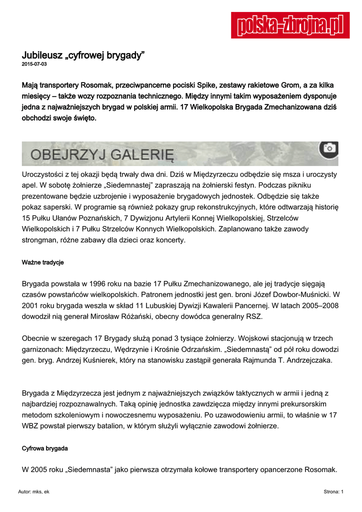 Jubileusz „cyfrowej brygady” 2015-07-03 Mają transportery Rosomak, przeciwpancerne pociski Spike, zestawy rakietowe Grom, a za kilka miesięcy – także wozy rozpoznania technicznego. Między innymi takim wyposażeniem dysponuje jedna z najważniejszych brygad w polskiej armii. 17 Wielkopolska Brygada Zmechanizowana dziś obchodzi swoje święto. Uroczystości z tej okazji będą trwały dwa dni. Dziś w Międzyrzeczu odbędzie się msza i uroczysty apel. W sobotę żołnierze „Siedemnastej” zapraszają na żołnierski festyn. Podczas pikniku prezentowane będzie uzbrojenie i wyposażenie brygadowych jednostek. Odbędzie się także pokaz saperski. W programie są również pokazy grup rekonstrukcyjnych, które odtwarzają historię 15 Pułku Ułanów Poznańskich, 7 Dywizjonu Artylerii Konnej Wielkopolskiej, Strzelców Wielkopolskich i 7 Pułku Strzelców Konnych Wielkopolskich. Zaplanowano także zawody strongman, różne zabawy dla dzieci oraz koncerty. Ważne tradycje Brygada powstała w 1996 roku na bazie 17 Pułku Zmechanizowanego, ale jej tradycje sięgają czasów powstańców wielkopolskich. Patronem jednostki jest gen. broni Józef Dowbor-Muśnicki. W 2001 roku brygada weszła w skład 11 Lubuskiej Dywizji Kawalerii Pancernej. W latach 2005–2008 dowodził nią generał Mirosław Różański, obecny dowódca generalny RSZ. Obecnie w szeregach 17 Brygady służą ponad 3 tysiące żołnierzy. Wojskowi stacjonują w trzech garnizonach: Międzyrzeczu, Wędrzynie i Krośnie Odrzańskim. „Siedemnastą” od pół roku dowodzi gen. bryg. Andrzej Kuśnierek, który na stanowisku zastąpił generała Rajmunda T. Andrzejczaka. Brygada z Międzyrzecza jest jednym z najważniejszych związków taktycznych w armii i jedną z najbardziej rozpoznawalnych. Taką opinię jednostka zawdzięcza między innymi prekursorskim metodom szkoleniowym i nowoczesnemu wyposażeniu. Po uzawodowieniu armii, to właśnie w 17 WBZ powstał pierwszy batalion, w którym służyli wyłącznie zawodowi żołnierze. Cyfrowa brygada W 2005 roku „Siedemnasta” jako pierwsza otrzymała kołowe transportery opancerzone Rosomak. Autor: mks, ek Strona: 1 Dzisiaj jest ich w brygadowych jednostkach około 140. Żołnierze korzystają też z nowoczesnych moździerzy 60 mm i granatników MK-19, PPK Spike oraz zestawów rakietowych Grom. – Jest to najnowocześniejszy sprzęt z posiadanego przez jednostki wojskowe w Polsce – mówi gen. bryg. Andrzej Kuśnierek. Prócz tego brygada ma bojowe wozy piechoty, armatohaubice Dana, armaty przeciwlotnicze ZU-23-2. Żołnierze posiadają też m.in. karabinki szturmowe Beryl i pistolety maszynowe MP-84 Glauberyt. W grudniu 2015 roku do jednostki trafią pierwsze wozy rozpoznania technicznego Rosomak. To w tej brygadzie powstała pierwsza w polskiej armii szkoła strzelców wyborowych. W Wędrzynie żołnierze szkolą się w strzelaniu precyzyjnym. – Nasi strzelcy wyborowi wyposażeni są w najnowocześniejszą broń przystosowaną do specyfiki ich działania – zapewnia dowódca jednostki. 17 Brygada Zmechanizowana posiada również siatki Berberys, czyli specjalistyczny sprzęt umożliwiający kamuflaż i maskowanie pojazdów. – Berberys zatrzymuje wydzielane przez sprzęt i wozy ciepło oraz fale radiowe, dzięki czemu jest najlepszym elementem maskowania – wyjaśnia gen. Kuśnierek. Dowódca brygady podkreśla, że „Siedemnasta” podąża za najnowocześniejszymi rozwiązaniami technologicznymi. Dlatego też brygada od kilku lat jest określana mianem „cyfrowa”. – Wynika to z tego, że wykorzystujemy systemy komputerowe w szkoleniu i w codziennej działalności brygady – mówi generał. To właśnie w 17 Brygadzie Zmechanizowanej podczas jednego z ćwiczeń taktycznych pierwszy raz w historii polskiej armii użyto cyfrowych systemów symulacji pola walki JCATS (Joint Conflict and Tactical Simulation) i JTLS (Joint Theatre Level System). Szkolenie w kraju, test na misji Żołnierze 17 BZW wielokrotnie wyjeżdżali na misje poza granice kraju. Byli m.in. w Afganistanie, Iraku i Czadzie. W Afganistanie byli główną siłą bojową podczas I, II i IX zmiany polskiego kontyngentu. W operacji pod Hindukuszem wzięło udział około 2500 żołnierzy. W pierwszej połowie 2013 roku wojskowi pełnili dyżur w Grupie Bojowej Unii Europejskiej. Dowódcą Grupy był generał Andrzejczak. Żołnierze byli gotowi do interwencji w sytuacjach kryzysowych w dowolnym miejscu na świecie, w promieniu 6 tysięcy kilometrów od Brukseli. W ostatnich miesiącach brygada odbywa intensywne szkolenia w kraju. Żołnierze wzięli udział m.in. w ćwiczeniach: „Gronostaj’ 15”, „Gepard’ 15”, „Borsuk’ 15” i „Noble Jump’ 15”. Obecnie brygada przygotowuje się do październikowego ćwiczenia „Dragon’15”. Autor: mks, ek Strona: 2