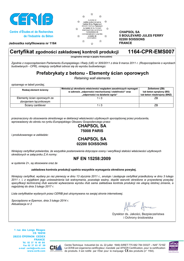 Centre d’Études et de Recherches de l’Industrie du Béton CHAPSOL SA 5 BOULEVARD JULES FERRY 02200 SOISSONS FRANCE Jednostka notyfikowana nr 1164 Certyfikat zgodności zakładowej kontroli produkcji 1164-CPR-EMS007 (oryginalna wersja w języku francuskim) Zgodnie z rozporządzeniem Parlamentu Europejskiego i Rady (UE) nr 305/2011 z dnia 9 marca 2011 r. (Rozporządzenie o wyrobach budowlanych - CPR), niniejszy certyfikat odnosi się do wyrobu budowlanego: Prefabrykaty z betonu - Elementy ścian oporowych Retaining wall elements opisanego w tabeli poniżej, Rodzaj element ścienny Metoda(-y) określania właściwości względem zasadniczych wymagań w zakresie „odporności mechanicznej i stabilności“ oraz „odporności na działanie ognia“ Żelbetowe (ZB) lub beton sprężony (BS) lub beton niezbrojony (BNZ) 1i3 ZB 1i3 ZB Elementy ścian oporowych ze zbrojeniem łącznikowym Ściany cantilever przeznaczony do stosowania określonego w deklaracji właściwości użytkowych sporządzonej przez producenta, wprowadzony do obrotu na rynku Europejskiego Obszaru Gospodarczego przez: CHAPSOL SA 75008 PARIS i produkowanego w zakładzie: CHAPSOL SA 02200 SOISSONS Niniejszy certyfikat potwierdza, że wszystkie postanowienia dotyczące oceny i weryfikacji stałości właściwości użytkowych określonych w załączniku Z.A normy: NF EN 15258:2009 w systemie 2+, są stosowane oraz że zakładowa kontrola produkcji spełnia wszystkie wymagania określone powyżej. Niniejszy certyfikat, wydany po raz pierwszy w dniu 13 stycznia 2011 r., anuluje i zastępuje certyfikat przedłużony w dniu 3 lutego 2011 r. i, z wyjątkiem jego unieważnienia lub wstrzymania, pozostaje ważny, dopóki warunki określone w przywołanej powyżej specyfikacji technicznej i/lub warunki wytwarzania wyrobu i/lub sama zakładowa kontrola produkcji nie ulegną istotnej zmianie, a najpóźniej do dnia 3 lutego 2017 r. Lista certyfikatów wydanych przez CERIB jest utrzymywana na swojej stronie internetowej. Sporządzono w Epernon, dnia 3 lutego 2014 r. Aktualizacja nr 2 Dyrektor ds. Jakości, Bezpieczeństwa i Ochrony środowiska 1 rue des Longs Réages CS 10010 28233 ÉPERNON CEDEX FRANCE Tél. 02 37 18 48 00 Fax 02 37 83 67 39 e-mail [email protected] www.cerib.com Centre Technique Industriel (loi du 22 juillet 1948) SIRET 775 682 784 00027 – NAF 7219Z Le CERIB est organisme certificateur, mandaté par AFNOR Certification, pour la certification de produits. Il est notifié par l’État pour le marquage des produits (n° 1164). F o r m a t i o n Études et Recherches
