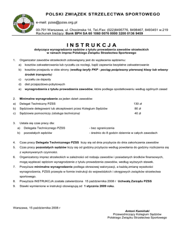 POLSKI ZWIĄZEK STRZELECTWA SPORTOWEGO e-mail: [email protected] 00-791 Warszawa, ul. Chocimska 14, Tel./Fax: (022)8495776, 8498467, 8493451 w.219 Rachunek bieżący: Bank BPH SA 60 1060 0076 0000 3200 0136 9459 INSTRUKCJA dotycząca wynagradzania sędziów z tytułu prowadzenia zawodów strzeleckich w ramach imprez Polskiego Związku Strzelectwa Sportowego 1. Organizator zawodów strzeleckich zobowiązany jest do wypłacenia sędziemu: a) kosztów zakwaterowania lub ryczałtu za noclegi, bądź zapewnia bezpłatne zakwaterowanie b) kosztów przejazdu w obie strony (według taryfy PKP - pociąg pośpieszny pierwszej klasy lub własny środek transportu) c) ryczałtu za dojazdy d) diet przejazdowo-pobytowych e) wynagrodzenia z tytułu prowadzenia zawodów, które podlega opodatkowaniu według ogólnych zasad 2. Minimalne wynagrodzenie za jeden dzień zawodów: a) Delegat Techniczny PZSS 130 zł b) Sędziowie delegowani lub akceptowani przez Kolegium Sędziów 80 zł c) Sędziowie pomocniczy (obsługa techniczna) 40 zł 3. Ustala się czas pracy dla: a) Delegata Technicznego PZSS - bez ograniczenia b) pozostałych sędziów - średnio do 8 godzin dziennie w całych zawodach 4. Czas pracy Delegata Technicznego PZSS liczy się od dnia przybycia do dnia zakończenia zawodów 5. Czas pracy pozostałych sędziów liczy się od godziny przybycia według powołania do godziny rozliczenia się z wykonywanych czynności. 6. Organizatorzy imprez strzeleckich w zależności od rodzaju zawodów i posiadanych środków finansowych, mogą wypłacać sędziom wynagrodzenie z tytułu prowadzenia zawodów, według wyższych stawek. 7. Powyższe minimalne wynagrodzenie podlega okresowej waloryzacji, a każdą zmianę wysokości wynagrodzenia, PZSS przesyła w formie instrukcji do wojewódzkich i okręgowych związków strzelectwa sportowego. 8. Powyższa INSTRUKCJA została zatwierdzona 15 października 2008 r Uchwałą Zarządu PZSS 9. Stawki wymienione w instrukcji obowiązują od 1 stycznia 2009 roku. Warszawa, 15 października 2008 r Antoni Kamiński Przewodniczący Kolegium Sędziów Polskiego Związku Strzelectwa Sportowego