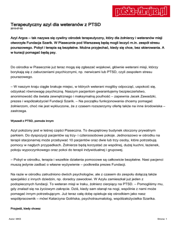 Terapeutyczny azyl dla weteranów z PTSD 2015-07-02 Azyl Argos – tak nazywa się cywilny ośrodek terapeutyczny, który dla żołnierzy i weteranów misji otworzyła Fundacja Szarik. W Piasecznie pod Warszawą będą mogli leczyć m.in. zespół stresu pourazowego. Pobyt i terapia są bezpłatne. Można przyjechać, kiedy się chce, bez skierowania. A w kuracji pomagać będą psy. Do ośrodka w Piasecznie już teraz mogą się zgłaszać wojskowi, głównie weterani misji, którzy borykają się z zaburzeniami psychicznymi, np. nerwicami lub PTSD, czyli zespołem stresu pourazowego. – W naszym kraju ciągle brakuje miejsc, w których weterani mogliby odpocząć, uspokoić się, odzyskać równowagę psychiczną. Naszym pacjentom gwarantujemy bezpieczeństwo, anonimowość dla świata zewnętrznego i maksymalną poufność – zapewnia Jacek Zawadzki, prezes i współzałożyciel Fundacji Szarik. – Na początku funkcjonowania chcemy pomagać żołnierzom, choć nie jest wykluczone, że z czasem rozszerzymy ofertę także na inne środowiska – zastrzega. Wyszedł z PTSD, pomoże innym Azyl położony jest w leśnej części Piaseczna. To dwupiętrowy budynek otoczony prywatnym parkiem. Do dyspozycji pacjentów są trzy- i czteroosobowe pokoje. Jednorazowo w ośrodku na terapii stacjonarnej może przebywać 10 pacjentów oraz dwie lub trzy osoby, które potrzebują pomocy w nagłych przypadkach. Żołnierze będą korzystać ze wspólnej, dużej kuchni, łazienek, pokoju wypoczynkowego oraz pokoi do terapii indywidualnej i grupowej. – Pobyt w ośrodku, terapia i wszelkie działania pomocowe są całkowicie bezpłatne. Nasi pacjenci muszą jedynie zadbać o własne wyżywienie – podkreśla prezes Fundacji. Na razie w ośrodku zatrudniono dwóch psychologów, ale z czasem do zespołu dołączą także specjaliści z innych dziedzin, np. doradcy zawodowi. W Azylu zamieszkał już jeden z podopiecznych fundacji. To weteran misji w Iraku, żołnierz cierpiący na PTSD. – Pomogliśmy mu, gdy znalazł się na życiowym zakręcie. Dziś, kiedy sam stanął na nogi, wspólnie z nami może pomagać innym potrzebującym. Już teraz całą dobę opiekuje się ośrodkiem jako nasz współpracownik – mówi Katarzyna Golińska, psychotraumatolog, współzałożycielka Szarika. Przyjedź, kiedy chcesz Autor: MKS Strona: 1 Jak będzie wyglądać terapia? Program zajęć dostosowywany jest do potrzeb pacjentów. Wiadomo jednak, że skorzystają z terapii indywidualnej, grupowej oraz psychoedukacji i terapii zajęciowej. Żołnierze i weterani w Azylu Argos będą mogli się leczyć ambulatoryjnie, ale też przyjechać na kilkutygodniową kurację. – Nie będziemy organizować turnusów terapeutycznych. Weterani mogą zgłaszać się w dowolnych terminach. Nikomu też nie chcemy narzucać, że ma spędzić w Azylu konkretną liczbę dni lub tygodni – zaznacza Katarzyna Gawlińska. – Każdy pacjent będzie przez nas diagnozowany, tu nie można generalizować. Jednemu żołnierzowi wystarczą dwa dni lub dwa tygodnie, a inny może potrzebować kilkutygodniowej stałej psychoterapii – dodaje. Azyl Argos nie jest placówką publicznej służby zdrowia i nie zawiera kontraktów z Narodowym Funduszem Zdrowia na świadczenie usług zdrowotnych. Oznacza to, że pacjenci, żeby trafić do ośrodka, nie potrzebują skierowania lekarskiego. Ale też to, że lekarze tam pracujący nie mogą wystawiać zwolnień lekarskich ZUS-ZLA, orzekających o niezdolności do pracy. Ośrodek powstał w ramach projektu „Misja: PTSD”, współfinansowanego z funduszy Europejskiego Obszaru Gospodarczego. W jego ramach fundacja otrzymała dotację na utrzymanie placówki i prowadzenie działań terapeutycznych przez 10 miesięcy, czyli do kwietnia 2016 roku. Później Azyl będzie finansowany ze środków statutowych Fundacji Szarik. Podaj łapę Stałym elementem terapii wszystkich pacjentów Azylu będą zajęcia z psami. Owczarek niemiecki Ciri oraz labradory Porter i Impuls, trzy pracujące w fundacji psy terapeutyczne, będą brały udział i w zajęciach indywidualnych, i grupowych. – Psy będą wspierać prowadzoną przez nas terapię. To coś więcej niż klasyczna dogoterapia, bo pies nie jest dla nas narzędziem, a raczej pomocnikiem – tłumaczy Gawlińska. Jesienią fundacja chce nawet adoptować kilka psów ze schroniska dla zwierząt. Czworonogi zamieszkają w Azylu, a zajmować się nimi będą weterani. Jak podkreślają psychologowie, jest to sprawdzona w wielu krajach metoda terapeutyczna. – Żołnierz cierpiący na PTSD skupia uwagę na psie, pokonuje swoje psychiczne bariery i lęki. Musi być silny, bo staje się za kogoś odpowiedzialny – tłumaczy prezes Szarika. Podczas zajęć psycholog i pies tworzą zespół. – Pracujemy równocześnie. Ja prowadzę Autor: MKS Strona: 2 klasyczną terapię, mając przy sobie psa, dzięki któremu pacjent łatwiej okazuje swoje emocje – opisuje Gawlińska. Dodaje, że psy doskonale demaskują nastrój chorych, zwłaszcza podczas zajęć grupowych. – Pies jest szybszy od terapeuty, który czasami zajmuje się jednocześnie dziesięcioma pacjentami. Zwierzę bezbłędnie wskazuje osoby, którym trzeba poświęcić dodatkową uwagę. Czasami rozładowuje się negatywne emocje pacjenta zwykłym przytuleniem go – dodaje. Pionierski Szarik Fundacja Szarik jest jedyną w kraju organizacją, która specjalizuje się w terapii stresu pourazowego, a w leczeniu wykorzystuje czworonogi. Istnieje od lipca 2013 roku. Jej założycielami są psychologowie, specjaliści od prewencji stresu: Jacek Zawadzki i Katarzyna Gawlińska. W fundacji pracują także Dominika Miłek, Bartosz Cichocki, Łukasz Witkowicz, weteran misji w Afganistanie. Szarik od 2014 roku organizuje akcję „Kawa dla weterana”. W jej ramach zbiera pieniądze, które przeznacza co miesiąc na prowadzenie terapii dla weteranów i funkcjonariuszy służb mundurowych, a także na utrz