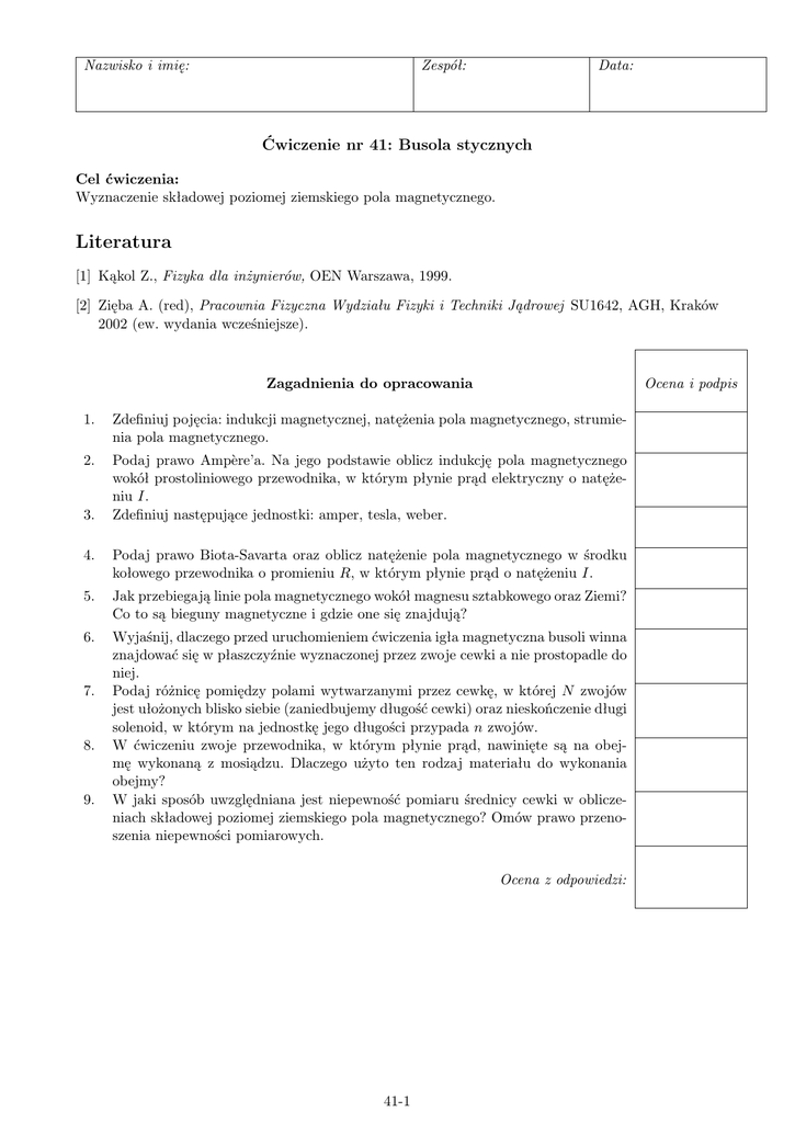 Nazwisko i imię: Zespół: Data: Ćwiczenie nr 41: Busola stycznych Cel ćwiczenia: Wyznaczenie składowej poziomej ziemskiego pola magnetycznego. Literatura [1] Kąkol Z., Fizyka dla inżynierów, OEN Warszawa, 1999. [2] Zięba A. (red), Pracownia Fizyczna Wydziału Fizyki i Techniki Jądrowej SU1642, AGH, Kraków 2002 (ew. wydania wcześniejsze). Ocena i podpis Zagadnienia do opracowania 1. Zdefiniuj pojęcia: indukcji magnetycznej, natężenia pola magnetycznego, strumienia pola magnetycznego. 2. Podaj prawo Ampère’a. Na jego podstawie oblicz indukcję pola magnetycznego wokół prostoliniowego przewodnika, w którym płynie prąd elektryczny o natężeniu I. Zdefiniuj następujące jednostki: amper, tesla, weber. 3. 4. Podaj prawo Biota-Savarta oraz oblicz natężenie pola magnetycznego w środku kołowego przewodnika o promieniu R, w którym płynie prąd o natężeniu I. 5. Jak przebiegają linie pola magnetycznego wokół magnesu sztabkowego oraz Ziemi? Co to są bieguny magnetyczne i gdzie one się znajdują? 6. Wyjaśnij, dlaczego przed uruchomieniem ćwiczenia igła magnetyczna busoli winna znajdować się w płaszczyźnie wyznaczonej przez zwoje cewki a nie prostopadle do niej. Podaj różnicę pomiędzy polami wytwarzanymi przez cewkę, w której N zwojów jest ułożonych blisko siebie (zaniedbujemy długość cewki) oraz nieskończenie długi solenoid, w którym na jednostkę jego długości przypada n zwojów. W ćwiczeniu zwoje przewodnika, w którym płynie prąd, nawinięte są na obejmę wykonaną z mosiądzu. Dlaczego użyto ten rodzaj materiału do wykonania obejmy? W jaki sposób uwzględniana jest niepewność pomiaru średnicy cewki w obliczeniach składowej poziomej ziemskiego pola magnetycznego? Omów prawo przenoszenia niepewności pomiarowych. 7. 8. 9. Ocena z odpowiedzi: 41-1 1 Opracowanie ćwiczenia Opracuj i opisz zagadnienia nr i podpis: 41-2 2 Oznaczenia, podstawowe definicje i wzory Stosowane oznaczenia: B H I 2R tesla [T] weber [Wb] radian [rad] µ0 = 4π · 10−7 Wb/(Am) – – – – – – – – indukcja magnetyczna, B = µ0 H natężenie pola magnetycznego natężenie prądu elektrycznego średnica cewki jednostka indukcji magnetycznej, 1 T = 1 Wb/m2 jednostka strumienia pola magnetycznego, 1 Wb = 1 V s miara łukowa kąta, 1 rad = 57,29578◦ = (360/2π)◦ stała magnetyczna Indukcja pola magnetycznego Bc wewnątrz cewki o n zwojach, promieniu R, w której płynie prąd o natężeniu I wynosi Bc = µ0 nI 2R Składowa pozioma indukcji magnetycznej ziemskiego pola magnetycznego w Krakowie wynosi 21µT. Układ pomiarowy Rysunek 41-1: Schemat układu pomiarowego. Rysunek 41-2: Pola magnetyczne w cewce, przez którą płynie prąd. 41-3 Składową poziomą indukcji magnetycznej ziemskiego pola magnetycznego obliczamy ze wzoru (por. rys.41-2): B= 3 Bc µ0 nI = . tg α 2R tg α (1) Wykonanie ćwiczenia W pomiarach ziemskiego pola magnetycznego istotną rzeczą jest zminimalizowanie wpływu innych, zaburzających pomiar, pól magnetycznych. W tym celu należy umieścić cewkę ze znajdującą się wewnątrz niej busolą możliwie daleko od przewodników z prądem oraz materiałów ferromagnetycznych (jak np. elementy żelazne). Następnie należy wypoziomować busolę i ustawić ją w taki sposób, aby igła magnetyczna znajdowała się w płaszczyźnie wyznaczonej przez zwoje cewki (busola jest zamocowana obrotowo). Przed zestawieniem obwodu należy starannie zapoznać się z budową przełącznika zmiany kierunku płynącego przez obwód prądu. Po sprawdzeniu obwodu przez prowadzącego zajęcia można przystąpić do dalszego wykonywania ćwiczenia. Wariant do wykonania (określa prowadzący zajęcia): Wykonaj pomiary dla : ilości zwojów cewki: ....... i ...... i ...... oraz kątów wychylenia igły magnetycznej od położenia zerowego: ....... i ....... i ....... i ....... i ....... i ..... . podpis: 4 Wyniki pomiarów i α1 α2 α I[A] n Bi [µT] – – – – – – – kolejny numer pomiaru, kąt wychylenia igły magnetycznej w lewo, kąt wychylenia igły magnetycznej w prawo, średni kąt wychylenie igły magnetycznej, natężenie prądu płynącego przez cewkę, ilość zwojów cewki, obliczona składowa pozioma indukcji magnetycznej Ziemi. 41-4 Tabela 1: Wyniki pomiarów n i α1 α2 α I Bi 2 (B i − B̄) 1 2 3 4 5 6 7 8 9 10 11 12 13 14 15 16 17 18 19 20 B̄ = klasa amperomierza – . . . . . . . . . średnica cewki – . . . . . . . . . ...... niepewność pomiaru średnicy cewki – . . . . . . . . . ...... podpis: 5 Opracowanie wyników pomiarów 1. Dla każdego pomiaru oblicz składową poziomą ziemskiego pola magnetycznego Bi . 2. Jako wartość składowej poziomej indukcji ziemskiego pola magnetycznego przyjmij B̄ – średnią arytmetyczną z wielkości Bi . Obliczanie niepewności pomiarowych Oblicz niepewność pomiaru typu A (dla serii pomiarów) pomiaru składowej poziomej ziemskiego pola magnetycznego (odchylenie standardowe pojedynczego pomiaru S(B) oraz niepewność standardową typu A, µA (B)). W poniższych wzorach N jest liczbą wykonanych pomiarów. s S(B) = 2 ΣN i=1 (B i − B̄) = ...... N −1 S(B) µA (B) = √ = ...... N 41-5 ... ... Praktycznie wszystkie uzyskane wartości Bi powinny zawierać się w przedziale ( B̄−3S(B), B̄+3S(B)). Jeżeli jakiś wynik nie leży w tym przedziale, to można podejrzewać, że pomiar ten został źle wykonany lub jego wynik źle opracowany. Przeanalizuj pod tym kątem tabelę z wynikami pomiarów i sformułuj odpowiednie wnioski. Oblicz niepewność złożoną pomiaru: uc (B) pomiaru składowej poziomej ziemskiego pola magnetycznego (związaną z dokładnością użytych w ćwiczeniu przyrządów pomiarowych). Obliczona powyżej niepewność typu A uświadamia nam, że rozrzut mierzonej wielkości może być dość znaczny. Wielkość ta – w określonym punkcie kuli ziemskiej i przy stałej konfiguracji stanowiska pomiarowego! – jest jednak stałą! Dlatego war