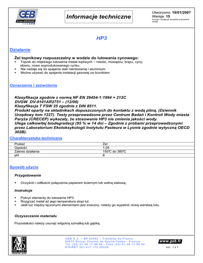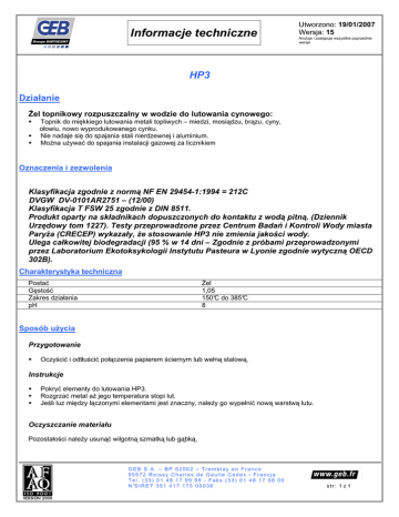 Informacje techniczne Utworzono: 19/01/2007 Wersja: 15 Anuluje i zastępuje wszystkie poprzednie wersje HP3 Działanie Żel topnikowy rozpuszczalny w wodzie do lutowania cynowego: Topnik do miękkiego lutowania metali topliwych – miedzi, mosiądzu, brązu, cyny, ołowiu, nowo wyprodukowanego cynku. Nie nadaje się do spajania stali nierdzewnej i aluminium. Można używać do spajania instalacji gazowej za licznikiem Oznaczenia i zezwolenia Klasyfikacja zgodnie z normą NF EN 29454-1:1994 = 212C DVGW DV-0101AR2751 – (12/00) Klasyfikacja T FSW 25 zgodnie z DIN 8511. Produkt oparty na składnikach dopuszczonych do kontaktu z wodą pitną. (Dziennik Urzędowy tom 1227). Testy przeprowadzone przez Centrum Badań i Kontroli Wody miasta Paryża (CRECEP) wykazały, że stosowanie HP3 nie zmienia jakości wody. Ulega całkowitej biodegradacji (95 % w 14 dni – Zgodnie z próbami przeprowadzonymi przez Laboratorium Ekotoksykologii Instytutu Pasteura w Lyonie zgodnie wytyczną OECD 302B). Charakterystyka techniczna Postać Gęstość Zakres działania pH Żel 1,05 150°C do 385°C 8 Sposób użycia Przygotowanie Oczyścić i odtłuścić połączenia papierem ściernym lub wełną stalową. Instrukcje Pokryć elementy do lutowania HP3. Rozgrzać metal aż jego temperatura stopi lut. Jeśli luz między łączonymi elementami jest znaczny, należy go wypełnić nową warstwą lutu. Oczyszczanie materiału Pozostałości należy usunąć wilgotną szmatką lub gąbką. GEB S.A. – BP 62062 – Tremblay en France 95972 Roissy Charles de Gaulle Cédex - Francja Tel. (33) 01 48 17 99 99 - Faks (33) 01 48 17 98 00 N °S I R E T 3 5 1 4 1 7 1 7 5 0 0 0 3 8 str: 1 z 1 Przechowywanie Przechowywać w temperaturze między 5°C i +40°C. W temperaturze 20°C czas przechowywania produktu w oryginalnym zamkniętym opakowaniu wynosi 18 miesięcy. Uwagi Pozwala na szybsze połączenie elementów, nie wydziela niemiłych oparów, nie szczypie podczas stosowania. Nie powoduje późniejszego rdzewienia instalacji przed i za miejscem lutowania. Dane dotyczące bezpieczeństwa są dostępne w Internecie na stronie www.quickfds.com Informacje zawarte w niniejszych informacjach technicznych podane są w dobrej wierze i wynikają z pomiarów dokonanych w naszych laboratoriach. Biorąc pod uwagę różnorodność materiałów, różnice jakości i różnorodność metod, zalecamy użytkownikom wykonanie wstępnych prób w rzeczywistych warunkach stosowania. Niniejszy dokument może być modyfikowany bez uprzedzenia w zależności od zmian w produktach lub stanie naszej wiedzy. Zalecamy upewnienie się przed zastosowaniem, że korzystają Państwo z najnowszej wersji. GEB S.A. – BP 62062 – Tremblay en France 95972 Roissy Charles de Gaulle Cédex - Francja Tel. (33) 01 48 17 99 99 - Faks (33) 01 48 17 98 00 N °S I R E T 3 5 1 4 1 7 1 7 5 0 0 0 3 8 str: 2 z 2