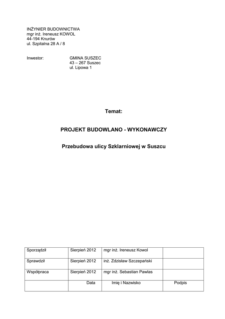 INŻYNIER BUDOWNICTWA mgr inż. Ireneusz KOWOL 44-194 Knurów ul. Szpitalna 28 A / 8 Inwestor: GMINA SUSZEC 43 – 267 Suszec ul. Lipowa 1 Temat: PROJEKT BUDOWLANO - WYKONAWCZY Przebudowa ulicy Szklarniowej w Suszcu Sporządził Sierpień 2012 mgr inż. Ireneusz Kowol Sprawdził Sierpień 2012 inż. Zdzisław Szczepański Współpraca Sierpień 2012 mgr inż. Sebastian Pawlas Data Imię i Nazwisko Podpis Inżynier Budownictwa Ireneusz Kowol 44-194 Knurów, ul. Szpitalna 28A/8 tel. 604-816-870 WYKAZ ZAŁĄCZNIKÓW DO PROJEKTU BUDOWLANO - WYKONAWCZEGO Przebudowa ulicy Szklarniowej w Suszcu 1. Opis techniczny. 2. Oświadczenie projektanta i sprawdzającego o wykonaniu projektu zgodnie z obowiązującymi przepisami 3. Uprawnienia budowlane do projektowania projektanta. 4. Zaświadczenie o członkostwie projektanta w Śląskiej Okręgowej Izbie Inżynierów Budownictwa. 5. Pismo Przedsiębiorstwa Gospodarki Komunalnej nr PGK/UZG/105/12 – warunki techniczne remontu nawierzchni ul. Szklarniowej w Suszcu pod względem przebiegu sieci wodociągowej i kanalizacji sanitarnej. 6. Pismo Górnośląskiej Spółki Gazownictwa – uzgodnienie lokalizacji, wydanie warunków zabezpieczenia w związku z projektem remontu ulicy Szklarniowej w Suszcu. 7. Wypis i wyrys z miejscowego planu zagospodarowania przestrzennego. 8. Rysunek Nr 1 – Orientacja. 9. Rysunek Nr 2 – Plan sytuacyjny w skali 1: 1000, sporządzony na kopii mapy zasadniczej. 10. Rysunek Nr 3 – Plan sytuacyjny w skali 1: 1000, sporządzony na kopii mapy ewidencyjnej. 11. Rysunek Nr 4 – Przekrój konstrukcyjny. 12. Rysunek Nr 5 – Profil podłużny. 13. Profil podłużny 14. Plan sytuacyjny w skali 1:500 15. Uprawnienia budowlane do projektowania projektanta i sprawdzającego 16. Zaświadczenie o członkostwie projektanta i sprawdzającego w Śląskiej Okręgowej Izbie Inżynierów Budownictwa 17. Oświadczenie projektanta i sprawdzającego o wykonaniu projektu zgodnie z obowiązującymi przepisami Projekt budowlano – wykonawczy „Przebudowa ul. Szklarniowej w Suszcu” Strona 2 / 5 Inżynier Budownictwa Ireneusz Kowol 44-194 Knurów, ul. Szpitalna 28A/8 tel. 604-816-870 OPIS TECHNICZNY PROJEKTU BUDOWLANO - WYKONAWCZEGO. Przebudowa ul. Szklarniowej w Suszcu. I. PODSTAWA OPRACOWANIA. 1. Rozporządzenie MT i GM z dnia 2 marca 1999 r. poz. 430 (Dz. U. Nr 43) w sprawie warunków technicznych, jakim powinny odpowiadać drogi publiczne i ich usytuowanie. 2. PN-S-96025: 2000 Drogi samochodowe i lotniskowe. Nawierzchnie asfaltowe. Wymagania. 3. Wizja lokalna w terenie. 4. Pomiary geodezyjne uzupełniające. II. PARAMETRY TECHNICZNE. 2.1. Długość projektowanego odcinka od km 0+000 do km 0+176 – 176 mb. 2.2. Projektowana szerokość przebudowanej drogi – 3,00 m. 2.3. Projektowane pobocze. Obustronne pobocze z żużla wielkopiecowego o szerokości 0,50 m. 2.4. Spadek poprzeczny jezdni jednostronny: 2,0 %. III. STAN ISTNIEJĄCY. 3.1. Lokalizacja. Projektowana droga, ulica Szklarniowa w Suszcu jest drogą wewnętrzną gminną stanowiącą dojazd do posesji i pól. Początek ulicy stanowi skrzyżowanie z drogą powiatową (ul. Baranowicką). Obecnie droga posiada nawierzchnię z kruszywa naturalnego o szerokości ok. 3,00 m. 3.2. Teren. Projektowana droga znajduje się na terenie mało intensywnej jednorodzinnej zabudowy wiejskiej, w obrębie terenu zabudowanego w rozumieniu przepisów o ruchu drogowym. 3.3. Odwodnienie terenu. Odwodnienie jezdni powierzchniowe odbywa się poprzez spływ wody opadowej na pobocze ziemne z uwzględnieniem naturalnej retencji. Brak odwodnienia wgłębnego. 3.4. Stan własnościowy. Droga zlokalizowana jest w całości na nieruchomości nr 129/2 stanowiącej własność Gminy Suszec. Projekt budowlano – wykonawczy „Przebudowa ul. Szklarniowej w Suszcu” Strona 3 / 5 Inżynier Budownictwa Ireneusz Kowol 44-194 Knurów, ul. Szpitalna 28A/8 3.5. tel. 604-816-870 Uzbrojenie pasa drogowego. W km 0+050 poprzecznie do osi drogi ul. Szklarniowej przebiega sieć wodociągowa. Zakres robót budowlanych związanych z przebudową nie obejmuje prowadzenia robót ziemnych wobec czego nie dojdzie do kolizji z istniejącą infrastrukturą techniczną zlokalizowaną w pasie drogowym. IV. STAN PROJEKTOWANY. 4.1. Zakres opracowania. Długość odcinka przeznaczonego do przebudowy wynosi 176,0 mb (od km 0+000 do km 0+176) 4.2. Roboty rozbiórkowe i podłoże . 1. Po obu stronach projektowanej drogi wykonać ścięcie istniejących poboczy na głębokości 5 cm. 2. Na całym projektowanym odcinku oczyścić istniejącą nawierzchnię z kruszywa łamanego. 3. Nadmiar mas ziemnych odwieźć na wysypisko i zutylizować. 4.3. Podbudowa. 1. Zaprojektowano wyrównanie istniejącej podbudowy mieszanką mineralno bitumiczną o średniej grubości 2 cm (0-4 cm) 2. Przed ułożeniem warstwy wyrównawczej z mieszanki mineralno bitumicznej należy uprzednio przygotowaną podbudowę skropić emulsją asfaltową dla poprawy przyczepności. 4.4. Konstrukcja nawierzchni. Projektuje się wykonanie nawierzchni jezdni z mieszanki mineralno – bitumicznej w dwóch następujących warstwach: a. Warstwa wiążąca gr. 4 cm. b. Warstwa ścieralna gr. 4 cm. 4.5. Profil podłużny drogi. Niweletę projektowanej drogi należy wykonać zgodnie z rysunkiem nr 6 „Profil podłużny drogi”. 4.6. Spadek poprzeczny. Zaprojektowano jednostronny spadek poprzeczny drogi o wartości 2 %. 4.7. Pobocza. Wzdłuż całego projektowanego odcinka należy wykonać obustronne pobocze o szerokości 0,50 m z żużla wielkopiecowego gr. 15 cm. Projekt budowlano – wykonawczy „Przebudowa ul. Szklarniowej w Suszcu” Strona 4 / 5 Inżynier Budownictwa Ireneusz Kowol 44-194 Knurów, ul. Szpitalna 28A/8 tel. 604-816-870 V. Zalecenia końcowe. 5.1. Wszystkie roboty budowlane prowadzić w oparciu o „Specyfikację Techniczną Wykonania i Odbioru Robót Budowlanych”. 5.2. Należy przestrzegać zasad BHP podczas prowadzenia robot drogowych. 5.3. Użyte materiały muszą