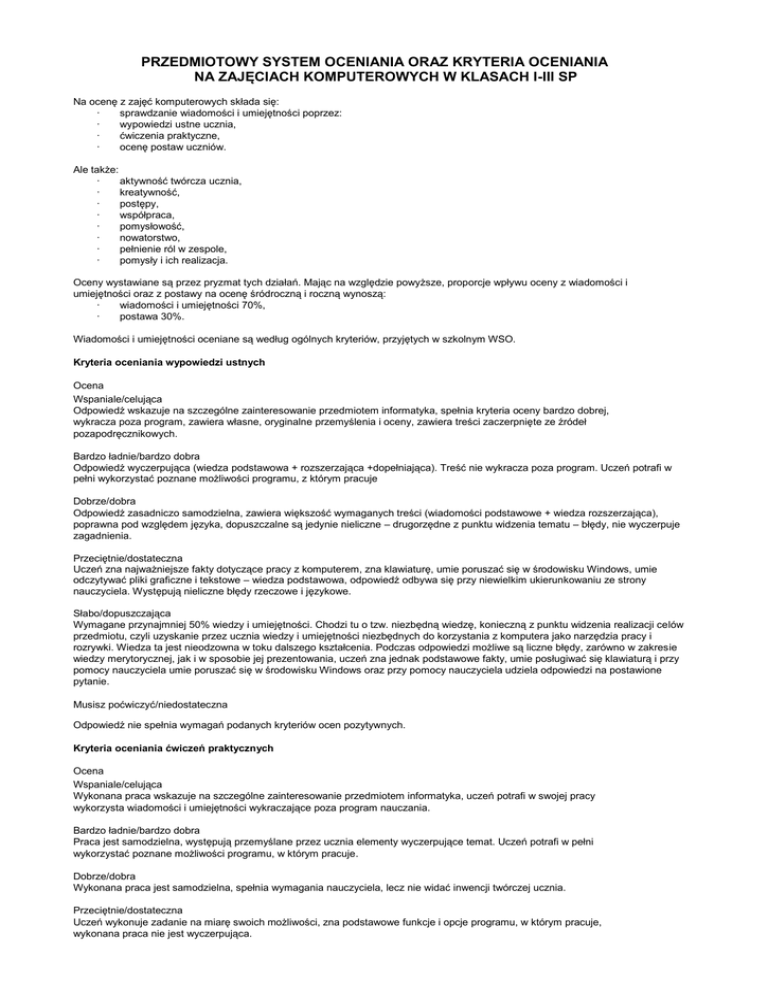 PRZEDMIOTOWY SYSTEM OCENIANIA ORAZ KRYTERIA OCENIANIA NA ZAJĘCIACH KOMPUTEROWYCH W KLASACH I-III SP Na ocenę z zajęć komputerowych składa się: · sprawdzanie wiadomości i umiejętności poprzez: · wypowiedzi ustne ucznia, · ćwiczenia praktyczne, · ocenę postaw uczniów. Ale także: · aktywność twórcza ucznia, · kreatywność, · postępy, · współpraca, · pomysłowość, · nowatorstwo, · pełnienie ról w zespole, · pomysły i ich realizacja. Oceny wystawiane są przez pryzmat tych działań. Mając na względzie powyższe, proporcje wpływu oceny z wiadomości i umiejętności oraz z postawy na ocenę śródroczną i roczną wynoszą: · wiadomości i umiejętności 70%, · postawa 30%. Wiadomości i umiejętności oceniane są według ogólnych kryteriów, przyjętych w szkolnym WSO. Kryteria oceniania wypowiedzi ustnych Ocena Wspaniale/celująca Odpowiedź wskazuje na szczególne zainteresowanie przedmiotem informatyka, spełnia kryteria oceny bardzo dobrej, wykracza poza program, zawiera własne, oryginalne przemyślenia i oceny, zawiera treści zaczerpnięte ze źródeł pozapodręcznikowych. Bardzo ładnie/bardzo dobra Odpowiedź wyczerpująca (wiedza podstawowa + rozszerzająca +dopełniająca). Treść nie wykracza poza program. Uczeń potrafi w pełni wykorzystać poznane możliwości programu, z którym pracuje Dobrze/dobra Odpowiedź zasadniczo samodzielna, zawiera większość wymaganych treści (wiadomości podstawowe + wiedza rozszerzająca), poprawna pod względem języka, dopuszczalne są jedynie nieliczne – drugorzędne z punktu widzenia tematu – błędy, nie wyczerpuje zagadnienia. Przeciętnie/dostateczna Uczeń zna najważniejsze fakty dotyczące pracy z komputerem, zna klawiaturę, umie poruszać się w środowisku Windows, umie odczytywać pliki graficzne i tekstowe – wiedza podstawowa, odpowiedź odbywa się przy niewielkim ukierunkowaniu ze strony nauczyciela. Występują nieliczne błędy rzeczowe i językowe. Słabo/dopuszczająca Wymagane przynajmniej 50% wiedzy i umiejętności. Chodzi tu o tzw. niezbędną wiedzę, konieczną z punktu widzenia realizacji celów przedmiotu, czyli uzyskanie przez ucznia wiedzy i umiejętności niezbędnych do korzystania z komputera jako narzędzia pracy i rozrywki. Wiedza ta jest nieodzowna w toku dalszego kształcenia. Podczas odpowiedzi możliwe są liczne błędy, zarówno w zakresie wiedzy merytorycznej, jak i w sposobie jej prezentowania, uczeń zna jednak podstawowe fakty, umie posługiwać się klawiaturą i przy pomocy nauczyciela umie poruszać się w środowisku Windows oraz przy pomocy nauczyciela udziela odpowiedzi na postawione pytanie. Musisz poćwiczyć/niedostateczna Odpowiedź nie spełnia wymagań podanych kryteriów ocen pozytywnych. Kryteria oceniania ćwiczeń praktycznych Ocena Wspaniale/celująca Wykonana praca wskazuje na szczególne zainteresowanie przedmiotem informatyka, uczeń potrafi w swojej pracy wykorzysta wiadomości i umiejętności wykraczające poza program nauczania. Bardzo ładnie/bardzo dobra Praca jest samodzielna, występują przemyślane przez ucznia elementy wyczerpujące temat. Uczeń potrafi w pełni wykorzystać poznane możliwości programu, w którym pracuje. Dobrze/dobra Wykonana praca jest samodzielna, spełnia wymagania nauczyciela, lecz nie widać inwencji twórczej ucznia. Przeciętnie/dostateczna Uczeń wykonuje zadanie na miarę swoich możliwości, zna podstawowe funkcje i opcje programu, w którym pracuje, wykonana praca nie jest wyczerpująca. Słabo/dopuszczająca Praca mało związana z tematem, uczeń nie potrafi wykorzysta podanych przez nauczyciela wiadomości, przejawia wręcz niechęć do większego zaangażowania we właściwe wykonanie zadania. Musisz poćwiczyć/niedostateczna Uczeń nie wykonał większości zadań. Kryteria oceniania w zakresie postaw uczniów Ocenianie postawy poprzez analizę działalności ucznia w następujących obszarach: · aktywność, · systematyczność, · praca w grupie, · umiejętność współpracy, · prezentacja pracy, · samodzielność pracy, · przygotowanie do lekcji, · praca domowa. Ocena Wspaniale/celująca · Podczas wykonywania zadań wykazuje się dużą starannością i sumiennością. · Dąży do samodoskonalenia i twórczego rozwoju własnych uzdolnień. · Przygotowuje dodatkowe informacje na zajęcia, wykonuje prace długoterminowe. · Samodzielnie wykonuje wszystkie zadania teoretyczne i praktyczne przewidziane programem oraz wykazuje operatywność w wykorzystaniu wiadomości i umiejętności do rozwiązywania zadań trudnych, w nowych sytuacjach. · Zaangażowany emocjonalnie w pracę klasy, grupy, bardzo aktywny, motywuje innych uczestników zajęć do pokonywania trudności. · Przestrzega wszelkich zasad bezpieczeństwa, higieny i organizacji pracy. · Przejawia inicjatywę, nauczyciel może na niego zawsze liczyć. · Odnosi sukcesy w konkursach informatycznych. Bardzo · · · · · · ładnie/bardzo dobra Podczas wykonywania zadań wykazuje się dużą starannością i sumiennością. Podczas wykonywania zadań teoretycznych i praktycznych stara się być samodzielny. Zaangażowany w pracę klasy, grupy, stara się być aktywny i odpowiedzialny. Zachęca do dobrej komunikacji w grupie, okazuje szacunek innym członkom grupy. Efektywnie wykorzystuje czas pracy. Dostosowuje się do obowiązujących zasad bezpiecznej i higienicznej pracy z komputerem. Dobrze/dobra · Podczas wykonywania zadań teoretycznych i praktycznych stara się być samodzielny, jednak brak mu jeszcze staranności i systematyczności w działaniu. · Zaangażowany w pracę klasy, grupy, stara się być aktywny. · Nie zawsze okazuje szacunek innym członkom grupy. · Niezbyt efektywnie wykorzystuje czas pracy. · Dostosowuje się do obowiązujących zasad bezpiecznej i higienicznej pracy z komputerem. Przeciętnie/dostateczna · Podczas wykonywania zadań teoretycznych i praktycznych wymaga czasami mob