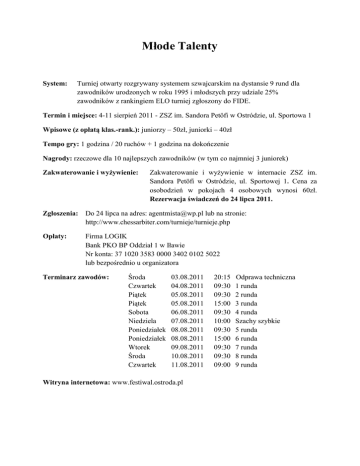 Młode Talenty System: Turniej otwarty rozgrywany systemem szwajcarskim na dystansie 9 rund dla zawodników urodzonych w roku 1995 i młodszych przy udziale 25% zawodników z rankingiem ELO turniej zgłoszony do FIDE. Termin i miejsce: 4-11 sierpień 2011 - ZSZ im. Sandora Petöfi w Ostródzie, ul. Sportowa 1 Wpisowe (z opłatą klas.-rank.): juniorzy – 50zł, juniorki – 40zł Tempo gry: 1 godzina / 20 ruchów + 1 godzina na dokończenie Nagrody: rzeczowe dla 10 najlepszych zawodników (w tym co najmniej 3 juniorek) Zakwaterowanie i wyżywienie: Zakwaterowanie i wyżywienie w internacie ZSZ im. Sandora Petöfi w Ostródzie, ul. Sportowej 1. Cena za osobodzień w pokojach 4 osobowych wynosi 60zł. Rezerwacja świadczeń do 24 lipca 2011. Zgłoszenia: Do 24 lipca na adres: [email protected] lub na stronie: http://www.chessarbiter.com/turnieje/turnieje.php Opłaty: Firma LOGIK Bank PKO BP Oddział 1 w Iławie Nr konta: 37 1020 3583 0000 3402 0102 5022 lub bezpośrednio u organizatora Terminarz zawodów: Środa Czwartek Piątek Piątek Sobota Niedziela Poniedziałek Poniedziałek Wtorek Środa Czwartek 03.08.2011 04.08.2011 05.08.2011 05.08.2011 06.08.2011 07.08.2011 08.08.2011 08.08.2011 09.08.2011 10.08.2011 11.08.2011 Witryna internetowa: www.festiwal.ostroda.pl 20:15 09:30 09:30 15:00 09:30 10:00 09:30 15:00 09:30 09:30 09:00 Odprawa techniczna 1 runda 2 runda 3 runda 4 runda Szachy szybkie 5 runda 6 runda 7 runda 8 runda 9 runda