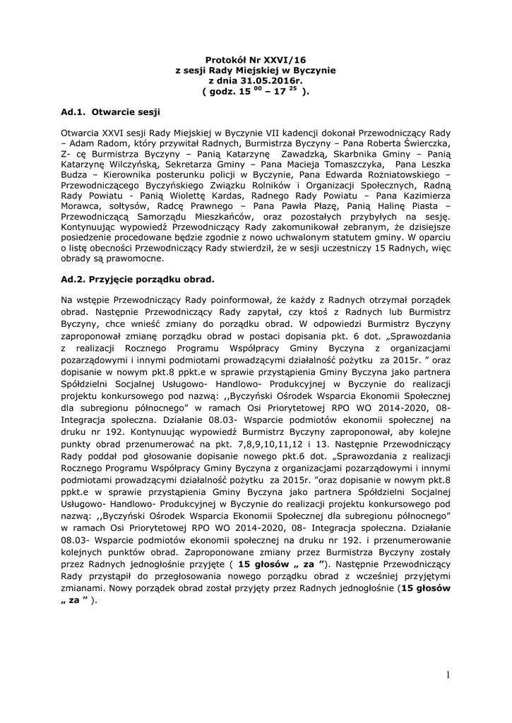 Protokół Nr XXVI/16 z sesji Rady Miejskiej w Byczynie z dnia 31.05.2016r. ( godz. 15 00 – 17 25 ). Ad.1. Otwarcie sesji Otwarcia XXVI sesji Rady Miejskiej w Byczynie VII kadencji dokonał Przewodniczący Rady – Adam Radom, który przywitał Radnych, Burmistrza Byczyny – Pana Roberta Świerczka, Z- cę Burmistrza Byczyny – Panią Katarzynę Zawadzką, Skarbnika Gminy – Panią Katarzynę Wilczyńską, Sekretarza Gminy – Pana Macieja Tomaszczyka, Pana Leszka Budza – Kierownika posterunku policji w Byczynie, Pana Edwarda Rożniatowskiego – Przewodniczącego Byczyńskiego Związku Rolników i Organizacji Społecznych, Radną Rady Powiatu - Panią Wiolettę Kardas, Radnego Rady Powiatu – Pana Kazimierza Morawca, sołtysów, Radcę Prawnego – Pana Pawła Płazę, Panią Halinę Piasta – Przewodniczącą Samorządu Mieszkańców, oraz pozostałych przybyłych na sesję. Kontynuując wypowiedź Przewodniczący Rady zakomunikował zebranym, że dzisiejsze posiedzenie procedowane będzie zgodnie z nowo uchwalonym statutem gminy. W oparciu o listę obecności Przewodniczący Rady stwierdził, że w sesji uczestniczy 15 Radnych, więc obrady są prawomocne. Ad.2. Przyjęcie porządku obrad. Na wstępie Przewodniczący Rady poinformował, że każdy z Radnych otrzymał porządek obrad. Następnie Przewodniczący Rady zapytał, czy ktoś z Radnych lub Burmistrz Byczyny, chce wnieść zmiany do porządku obrad. W odpowiedzi Burmistrz Byczyny zaproponował zmianę porządku obrad w postaci dopisania pkt. 6 dot. „Sprawozdania z realizacji Rocznego Programu Współpracy Gminy Byczyna z organizacjami pozarządowymi i innymi podmiotami prowadzącymi działalność pożytku za 2015r. ” oraz dopisanie w nowym pkt.8 ppkt.e w sprawie przystąpienia Gminy Byczyna jako partnera Spółdzielni Socjalnej Usługowo- Handlowo- Produkcyjnej w Byczynie do realizacji projektu konkursowego pod nazwą: ,,Byczyński Ośrodek Wsparcia Ekonomii Społecznej dla subregionu północnego” w ramach Osi Priorytetowej RPO WO 2014-2020, 08Integracja społeczna. Działanie 08.03- Wsparcie podmiotów ekonomii społecznej na druku nr 192. Kontynuując wypowiedź Burmistrz Byczyny zaproponował, aby kolejne punkty obrad przenumerować na pkt. 7,8,9,10,11,12 i 13. Następnie Przewodniczący Rady poddał pod głosowanie dopisanie nowego pkt.6 dot. „Sprawozdania z realizacji Rocznego Programu Współpracy Gminy Byczyna z organizacjami pozarządowymi i innymi podmiotami prowadzącymi działalność pożytku za 2015r. ”oraz dopisanie w nowym pkt.8 ppkt.e w sprawie przystąpienia Gminy Byczyna jako partnera Spółdzielni Socjalnej Usługowo- Handlowo- Produkcyjnej w Byczynie do realizacji projektu konkursowego pod nazwą: ,,Byczyński Ośrodek Wsparcia Ekonomii Społecznej dla subregionu północnego” w ramach Osi Priorytetowej RPO WO 2014-2020, 08- Integracja społeczna. Działanie 08.03- Wsparcie podmiotów ekonomii społecznej na druku nr 192. i przenumerowanie kolejnych punktów obrad. Zaproponowane zmiany przez Burmistrza Byczyny zostały przez Radnych jednogłośnie przyjęte ( 15 głosów „ za ”). Następnie Przewodniczący Rady przystąpił do przegłosowania nowego porządku obrad z wcześniej przyjętymi zmianami. Nowy porządek obrad został przyjęty przez Radnych jednogłośnie (15 głosów „ za ” ). 1 Pierwotny porządek obrad przedstawiał się następująco: 1. 2. 3. 4. 5. 6. 7. 8. 9. 10. 11. 12. Otwarcie sesji. Przyjęcie porządku obrad. Wybór Sekretarza obrad. Przyjęcie protokołu z XXV sesji. Sprawozdanie Burmistrza z podejmowanych działań i decyzji w okresie międzysesyjnym. Interpelacje i zapytania radnych. Podjęcie uchwał w sprawie: a) wyboru ławników w wyborach uzupełniających do Sądu Rejonowego w Kluczborku na kadencję lat 2016 – 2019 ( druk nr 188 ), b) wyrażenia zgody Burmistrzowi Byczyny na wydzierżawienie nieruchomości gruntowych ( druk nr 189 ), c) zmian w budżecie gminy na 2016 rok ( druk nr 190 ), d) zmiany Wieloletniej Prognozy Finansowej Gminy Byczyna na lata 2016 – 2034 ( druk nr 191 ). Informacja Burmistrza o umorzeniach oraz o zastosowanych ulgach i zwolnieniach w podatkach gminnych w 2015r. Odpowiedzi na zgłoszone interpelacje i zapytania radnych. Wolne wnioski i zapytania. Komunikaty. Zakończenie sesji. Nowy porządek obrad przedstawiał się następująco: 1. 2. 3. 4. 5. 6. 7. 8. 9. Otwarcie sesji. Przyjęcie porządku obrad. Wybór Sekretarza obrad. Przyjęcie protokołu z XXV sesji. Sprawozdanie Burmistrza z podejmowanych działań i decyzji w okresie międzysesyjnym. Sprawozdanie z realizacji Rocznego Programu Współpracy Gminy Byczyna z organizacjami pozarządowymi i innymi podmiotami prowadzącymi działalność pożytku za 2015r. Interpelacje i zapytania radnych. Podjęcie uchwał w sprawie: a) wyboru ławników w wyborach uzupełniających do Sądu Rejonowego w Kluczborku na kadencję lat 2016 – 2019 ( druk nr 188 ), b) wyrażenia zgody Burmistrzowi Byczyny na wydzierżawienie nieruchomości gruntowych ( druk nr 189 ), c) zmian w budżecie gminy na 2016 rok ( druk nr 190 ), d) zmiany Wieloletniej Prognozy Finansowej Gminy Byczyna na lata 2016 – 2034 ( druk nr 191 ), e) przystąpienia Gminy Byczyna jako partnera Spółdzielni Socjalnej UsługowoHandlowo- Produkcyjnej w Byczynie do realizacji projektu konkursowego pod nazwą: ,,Byczyński Ośrodek Wsparcia Ekonomii Społecznej dla subregionu północnego” w ramach Osi Priorytetowej RPO WO 2014-2020, 08- Integracja społeczna. Działanie 08.03- Wsparcie podmiotów ekonomii społecznej ( druk nr 192 ). Informacja Burmistrza o umorzeniach oraz o zastosowanych ulgach i zwolnieniach w podatkach gminnych w 2015r. 2 10. Odpowiedzi na zgłoszone interpelacje i zapytania radnych. 11. Wolne wnioski i zapytania. 12. Komunikaty. 13. Zakończenie sesji. Ad.3. Wybór Sekretarza obrad. Przewodniczący Rady wskazał, aby Sekretarzem obrad został Wiceprzewodniczący Rady – Jerzy Pluta. Nastę