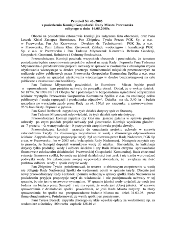 Protokół Nr 46 /2005 z posiedzenia Komisji Gospodarki Rady Miasta Przeworska odbytego w dniu 16.05.2005r. Obecni na posiedzeniu członkowie komisji jak załączona lista obecności, oraz Pana Leszek Kisiel Zastępca Burmistrza, Pan Zbigniew Tytuła Prezes PGK Sp. z o.o. w Przeworsku, Pan Jan Krzywonos Dyrektor ds. Technicznych PGK Sp. z o.o. w Przeworsku, Pani Liliana Kluz Kierownik Zakładu wodociągów i kanalizacji PGK Sp. z o.o. w Przeworsku i Pan Tadeusz Młynarczuk Kierownik Referatu Geodezji, Gospodarki Gruntami, Rolnictwa i Ochrony Środowiska. Przewodnicząca Komisji powitała wszystkich obecnych i powiedziała, że tematem posiedzenia będzie zaopiniowanie projektów uchwał na sesje Rady. Poprosiła Pana Tadeusza Młynarczuka o przedstawienie projektu uchwały w sprawie w zwolnienia z obowiązku zbycia użytkowania wieczystego w drodze przetargu nieruchomości miejskich przeznaczonych na realizację celów publicznych przez Przeworską Gospodarkę Komunalną Spółka z o.o, oraz wyrażenia zgody na sprzedaż użytkowania wieczystego w drodze bezprzetargowej na cele publiczne z zastosowaniem bonifikaty. Pan Tadeusz Młynarczuk powiedział, że Burmistrz Miasta będzie prosił o wprowadzenie tego projektu uchwały do porządku obrad. Dodał, że o wykup działek Nr 187/4, Nr 190 i Nr 191 Obrębu Nr 1 położonych w bezpośrednim sąsiedztwie oczyszczalni ścieków wystąpiła Przeworska Gospodarka Komunalna Spółka z o.o. na realizację celów publicznych / stacja segregacji i przeładunku odpadów/. Działka ma ok. 3,40 ha i będzie sprzedana po wyrażeniu zgody przez Radę za ok. 350zł po szacunku z zastosowaniem 95 % bonifikaty. Poprosił o pytania. Pan Karol Benbenek zapytał czy tych działek dotyczy spór ze Starostą. Pan Tadeusz Młynarczuk odpowiedział, że tych działek spór nie dotyczy. Przewodnicząca komisji zapytała czy ktoś ma jeszcze pytania w sprawie projektu uchwały po czym poddała projekt uchwały pod głosowanie. Komisja wynikiem głosów: za- 7 przeciw – 0, wstrzymało się – 0 pozytywnie zaopiniowała projekt chwały. Przewodnicząca komisji przeszła do omawiania projektu uchwały w sprawie zatwierdzenia Taryfy dla zbiorowego zaopatrzenia w wodę i zbiorowego odprowadzania ścieków. Zapytała dlaczego propozycja taryfy był opiniowana przez Radę Nadzorczą PGK Sp z o.o. w Przeworsku , bo w 2003 roku była opinia Rady Nadzorczej. Następnie zapytała czy to prawda, że Sanepid dopuścił warunkowo wodę do użytku. Stwierdziła, że kalkulacja dotyczy tylko produkcji wody i odbioru ścieków i czy Rada Miasta otrzyma sprawozdanie finansowe z całokształtu działalności Przeworskiej Gospodarki Komunalnej. Rada chce znać sytuacje finansowa spółki, bo może na jakiejś działalności jest zysk i nie trzeba wprowadzać podwyżki wody. Na zakończenie swojej wypowiedzi stwierdziła, że zwiększa się ilość punktów odbioru wody a spada zużycie wody. Pan Zbigniew Tytuła poinformował, że ustawa o zbiorowym zaopatrzeniu w wodę nie obliguje Rady Nadzorczej Spółki do wydawania opinii w sprawie taryfy. Obecnie jest nowy przewodniczący Rady i członek i pomału wchodzą w sprawy spółki. Rada Nadzorcza na posiedzeniu przyjęła propozycje taryf do wiadomości i nie podejmowała uchwały w tej sprawie, bo nie jest to ustawowo wymagalne. W sprawie jakości wody wyjaśnił, że woda jest badana na bieżąco przez Sanepid i nie ma opinii, że woda jest dobrej jakości. W sprawie sprawozdania z działalności spółki powiedziała, że jeśli Rada Miasta zażyczy to złoży sprawozdanie, bo spółka ma przeprowadzone badanie bilansu na dzień 31.03.05. przez firmę obrachunkową. Poinformował, że wynik spółki jest pozytywny. Pani Teresa Bączek zapytała dlaczego są takie wysokie opłaty za wodomierze np. za wodomierz o średnicy 100 trzeba zapłacić 128.40 zł 2 Pan Zbigniew Tytuła powiedział, że opłaty były przeliczane i zróżnicowane i wodomierz o średnicy 100mm jest w Cukrowni ale nieużywany. Pani Teresa Bączek stwierdziła, że nie ma projektu uchwały w sprawie zatwierdzenia taryfy. Pan Leszek Kisiel powiedział, że projekt uchwały nie został przygotowany przez nieuwagę , zostanie przygotowany na sesję Rady. Pan Witold Adrian stwierdził, że uchwała Rady nie jest potrzebna, bo jeśli Rada nie przyjmie uchwały to podwyżka opłat wejdzie w życie automatycznie po 70 dniach od daty złożenia wniosku. Dodał, że Rada Nadzorcza PGK powinna zapoznać się z propozycjami taryf. Stwierdził, że nie będzie brać udziału w głosowaniu nad uchwałą. Pani Teresa Bączek potwierdziła spostrzeżenia Radnego Adriana i stwierdziła, że Rada Miasta nie ma na nic wpływu. Zapytał co by się stało gdyby Rada uchwalił 0.05 zł podwyżki. Pani Liliana Kluz odpowiedziała, że ustawa ;precyzuje jeśli Rada przyjmie taryfę w niższej wysokości to jednocześnie musi podjąć uchwałę o dopłacie dla jednej grupy odbiorców np. indywidualnych i przekazać dopłatę PGK. Pani Teresa Bączek zapytał jakie są skutki podwyżki. Pan Zbigniew Tytuła odpowiedział, że rocznie ok. 60.000zł na wodzie i ściekach. Pan Roman Dudek powiedział, że art. 24 ust 6 ustawy o zbiorowym zaopatrzeniu w wodę i zbiorowym odprowadzaniu ścieków mówi, że Rada może podjąć uchwałę o dopłacie dla jednej, wybranej lub wszystkich taryfowych odbiorców usług. Zapytał czy rada nie dostała za późno materiałów w sprawie taryfy, bo art. 24 ust 2 w/w mówi, że „przedsiębiorstwo wodociągowo – kanalizacyjne w terminie 70 dni przed planowaną datą wejścia taryf w życie przedstawia radzie gminy wniosek o ich zatwierdzenie. Stwierdził, że rada otrzymała wniosek za późno i w tej chwili temat jest bezprzedmiotowy, jest to sprawa Burmistrza i PGK. Pan Prezes PGK wyjaśnił, że Spółka na 70 dni przed planowaną datą wejścia w życie taryfy tj 21.04.br. złożyła wniosek w Sekretariacie Urzędu Miasta zaadresowany na Radę 