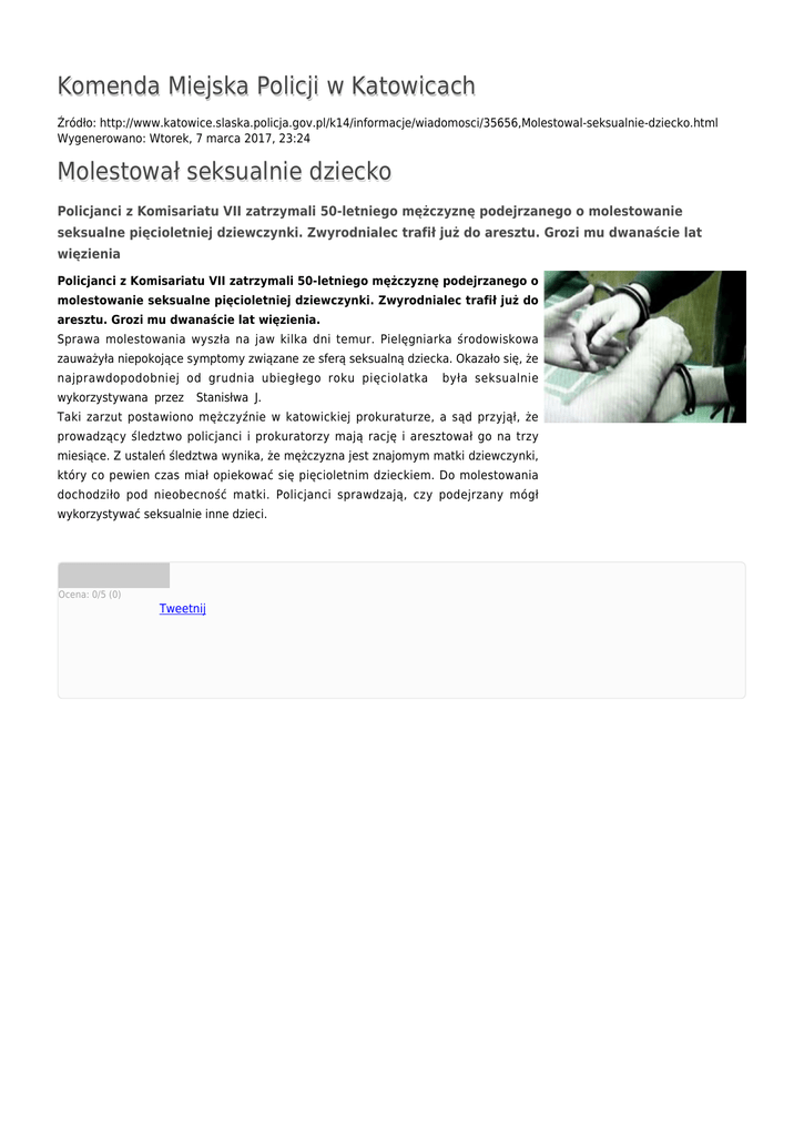 Komenda Miejska Policji w Katowicach Źródło: http://www.katowice.slaska.policja.gov.pl/k14/informacje/wiadomosci/35656,Molestowal-seksualnie-dziecko.html Wygenerowano: Wtorek, 7 marca 2017, 23:24 Molestował seksualnie dziecko Policjanci z Komisariatu VII zatrzymali 50-letniego mężczyznę podejrzanego o molestowanie seksualne pięcioletniej dziewczynki. Zwyrodnialec trafił już do aresztu. Grozi mu dwanaście lat więzienia Policjanci z Komisariatu VII zatrzymali 50-letniego mężczyznę podejrzanego o molestowanie seksualne pięcioletniej dziewczynki. Zwyrodnialec trafił już do aresztu. Grozi mu dwanaście lat więzienia. Sprawa molestowania wyszła na jaw kilka dni temur. Pielęgniarka środowiskowa zauważyła niepokojące symptomy związane ze sferą seksualną dziecka. Okazało się, że najprawdopodobniej od grudnia ubiegłego roku pięciolatka wykorzystywana przez była seksualnie Stanisłwa J. Taki zarzut postawiono mężczyźnie w katowickiej prokuraturze, a sąd przyjął, że prowadzący śledztwo policjanci i prokuratorzy mają rację i aresztował go na trzy miesiące. Z ustaleń śledztwa wynika, że mężczyzna jest znajomym matki dziewczynki, który co pewien czas miał opiekować się pięcioletnim dzieckiem. Do molestowania dochodziło pod nieobecność matki. Policjanci sprawdzają, czy podejrzany mógł wykorzystywać seksualnie inne dzieci. Ocena: 0/5 (0) Tweetnij
