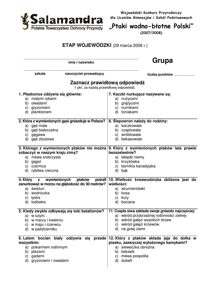 Wojewódzki Konkurs Przyrodniczy dla Uczniów Gimnazjów i Szkół Podstawowych „Ptaki wodno-błotne Polski” (2007/2008) ETAP WOJEWÓDZKI (29 marca 2008 r.) ..................................................................................................................... imię i nazwisko ..................................................................................................................... szkoła nauczyciel prowadzący Grupa liczba punktów ...................... Zaznacz prawidłową odpowiedź 1 pkt. za każdą prawidłową odpowiedź. 1. Płaskonos odżywia się głównie: a) małymi rybami b) owadami c) gryzoniami d) planktonem 7. Kaczki nurkujące nazywane są: a) nużycami b) grążycami c) nurnikami d) toniakami 2. Która z wymienionych gęsi gniazduje w Polsce? 8. Ślepowron należy do rodziny: a) gęś mała a) kaczkowate b) gęś białoczelna b) czaplowate c) gęgawa c) wróblowate d) gęś zbożowa d) bekasowate 3. Którego z wymienionych ptaków nie można 9. Który z wymienionych ptaków lata prawie bezszelestnie? zobaczyć w naszym kraju zimą? a) mewa srebrzysta a) łabędź niemy b) krzyżówka b) gągoł c) czernica c) bernikla kanadyjska d) bąk d) rybitwa rzeczna 4. Który z wymienionych ptaków potrafi 10. Wielkość krwawodzioba zbliżona jest do zanurkować w morzu na głębokość do 30 metrów? wielkości: a) świstun a) strumieniówki b) kosa b) wodniczka c) łyska c) kury d) lodówka d) bociana 5. Kiedy zwykle odbywają się toki batalionów? a) w lutym b) w marcu i kwietniu c) w maju i czerwcu d) w październiku 11. Czapla siwa zakłada swoje gniazdo najczęściej: a) wśród przybrzeżnej roślinności zielnej b) wśród gałęzi wysokich drzew c) wśród gałęzi krzewów d) na gołej ziemi 6. Latem bocian biały odżywia się przede 12. Który z ptaków składa jaja do dołka w wszystkim: piasku, zazwyczaj wyłożonego kamykami? a) pokarmem roślinnym a) sieweczka obrożna b) płazami b) bekasik c) gadami c) mewa pospolita d) gryzoniami i owadami d) dubelt Wojewódzki Konkurs Przyrodniczy dla Uczniów Gimnazjów i Szkół Podstawowych „Ptaki wodno-błotne Polski” (2007/2008) ETAP WOJEWÓDZKI (29 marca 2008 r.) 13. Latem perkoza dwuczubego spotkamy w 19. Który z wymienionych ptaków jest w Polsce naszym kraju przede wszystkim: najmniej licznym gatunkiem lęgowym? a) na wybrzeżu morskim a) rybołów b) na jeziorach b) rybitwa rzeczna c) na torfowiskach c) strumieniówka d) nad rzekami d) mewa srebrzysta 14. Który z wymienionych ptaków ma czerwoną 20. Który z wymienionych ptaków najsprawniej tęczówkę? nurkuje? a) gągoł a) krzyżówka b) ogorzałka b) śmieszka c) bąk c) czernica d) zausznik d) trzciniak 15. Który z wymienionych ptaków gnieździ się 21. Który z wymienionych ptaków poza okresem lęgowym bardzo rzadko wychodzi na ląd? prawie wyłącznie w koloniach? a) bączek a) perkoz dwuczuby b) nurogęś b) kormoran c) zielonka c) rybitwa rzeczna d) wodnik d) samotnik 16. Który z wymienionych ptaków przylatuje z miejsc 22. Który z ptaków gnieździ się w naszym kraju zimowania do Polski zazwyczaj dopiero w maju? nad brzegami rzek? a) łyska a) mewa żółtonoga b) trzcinniczek b) alka c) śmieszka c) siewnica d) żuraw d) brodziec piskliwy 17. U którego z wymienionych ptaków młode 23. Który z wymienionych ptaków potrafi bardzo już na drugi dzień po wykluciu potrafią same sprawnie ukrywać się w trawie, a jego donośny szukać pożywienia? głos godowy możemy usłyszeć również w nocy? a) głowienka a) brodziec śniady b) pluszcz b) kwokacz c) brzęczka c) szczudłak d) trzciniak d) derkacz 18. Który z wymienionych ptaków posiada 24. W jakim głównie środowisku występuje w czerwony dziób? naszym kraju kszyk? a) łabędź krzykliwy a) rwące rzeki górskie b) wodnik b) stawy c) łozówka c) podmokłe łąki i torfowiska d) gęś białoczelna d) jeziora
